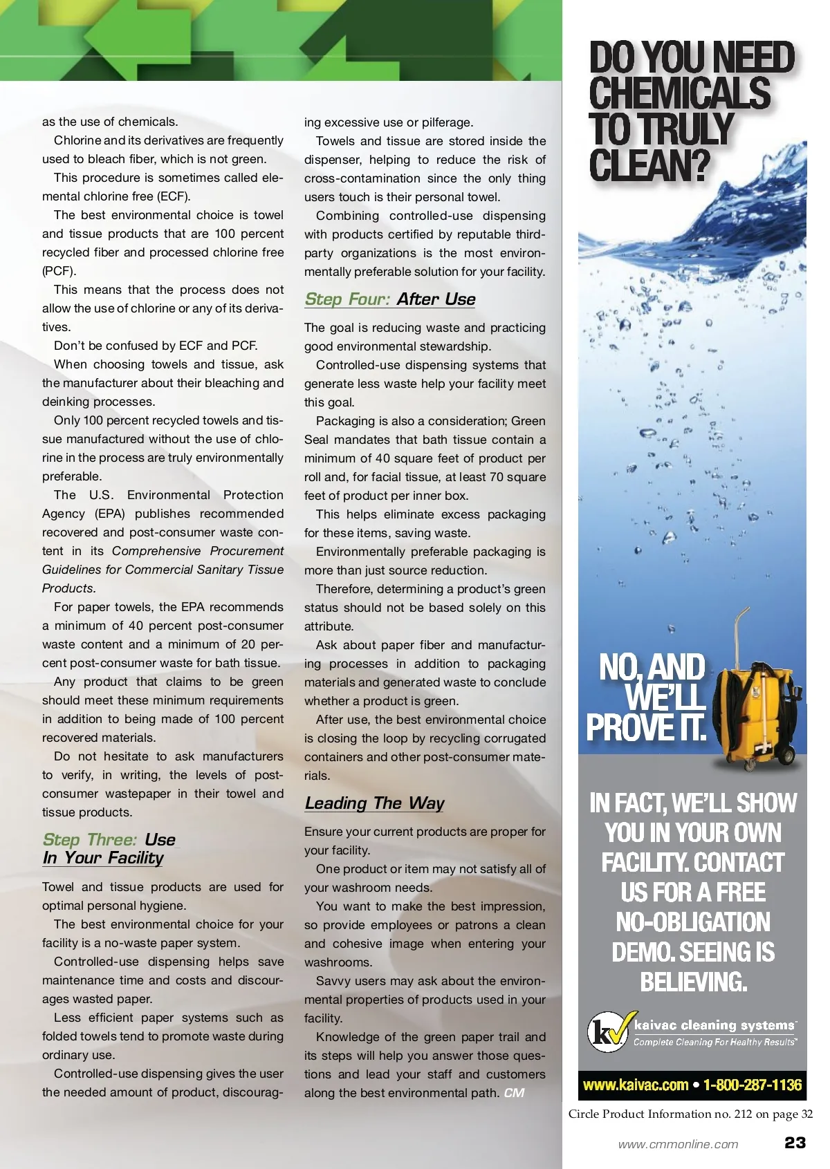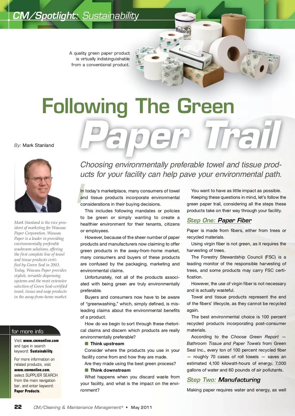 CM/Spotlight: Sustainability A quality green paper product is virtually indistinguishable from a conventional product. Following The Green By: Mark Stanland Paper Trail Choosing environmentally preferable towel and tissue prod-ucts for your facility can help pave your environmental path. I Mark Stanland is the vice pres-ident of marketing for Wausau Paper Corporation. Wausau Paper is a leader in providing environmentally preferable washroom solutions, offering the first complete line of towel and tissue products certi-fied by Green Seal in 2003. Today, Wausau Paper provides stylish, versatile dispensing systems and the most extensive selection of Green Seal-certified towel, tissue and soap products in the away-from-home market. for more info Visit www.cmmonline.com and type in search keyword: Sustainability . For more information on related products, visit www.cmmonline.com , select SUPPLIER SEARCH from the main navigation bar, and enter keyword: Paper Products . In today’s marketplace, many consumers of towel and tissue products incorporate environmental considerations in their buying decisions. This includes following mandates or policies to be green or simply wanting to create a healthier environment for their tenants, citizens or employees. However, because of the sheer number of paper products and manufacturers now claiming to offer green products in the away-from-home market, many consumers and buyers of these products are confused by the packaging, marketing and environmental claims. Unfortunately, not all of the products associ-ated with being green are truly environmentally preferable. Buyers and consumers now have to be aware of “greenwashing,” which, simply defined, is mis-leading claims about the environmental benefits of a product. How do we begin to sort through these rhetori-cal claims and discern which products are really environmentally preferable? Think upstream Consider where the products you use in your facility come from and how they are made. Are they made using the best green process? Think downstream What happens when you discard waste from your facility, and what is the impact on the envi-ronment? You want to have as little impact as possible. Keeping these questions in mind, let’s follow the green paper trail, considering all the steps these products take on their way through your facility. Step One: Paper Fiber Paper is made from fibers, either from trees or recycled materials. Using virgin fiber is not green, as it requires the harvesting of trees. The Forestry Stewardship Council (FSC) is a leading monitor of the responsible harvesting of trees, and some products may carry FSC certi-fication. However, the use of virgin fiber is not necessary and is actually wasteful. Towel and tissue products represent the end of the fibers’ lifecycle, as they cannot be recycled again. The best environmental choice is 100 percent recycled products incorporating post-consumer materials. According to the Choose Green Report — Bathroom Tissue and Paper Towels from Green Seal Inc., every ton of 100 percent recycled fiber — roughly 70 cases of roll towels — saves an estimated 4,100 kilowatt-hours of energy, 7,000 gallons of water and 60 pounds of air pollutants. Step Two: Manufacturing Making paper requires water and energy, as well 22 CM/Cleaning & Maintenance Management ® • May 2011
