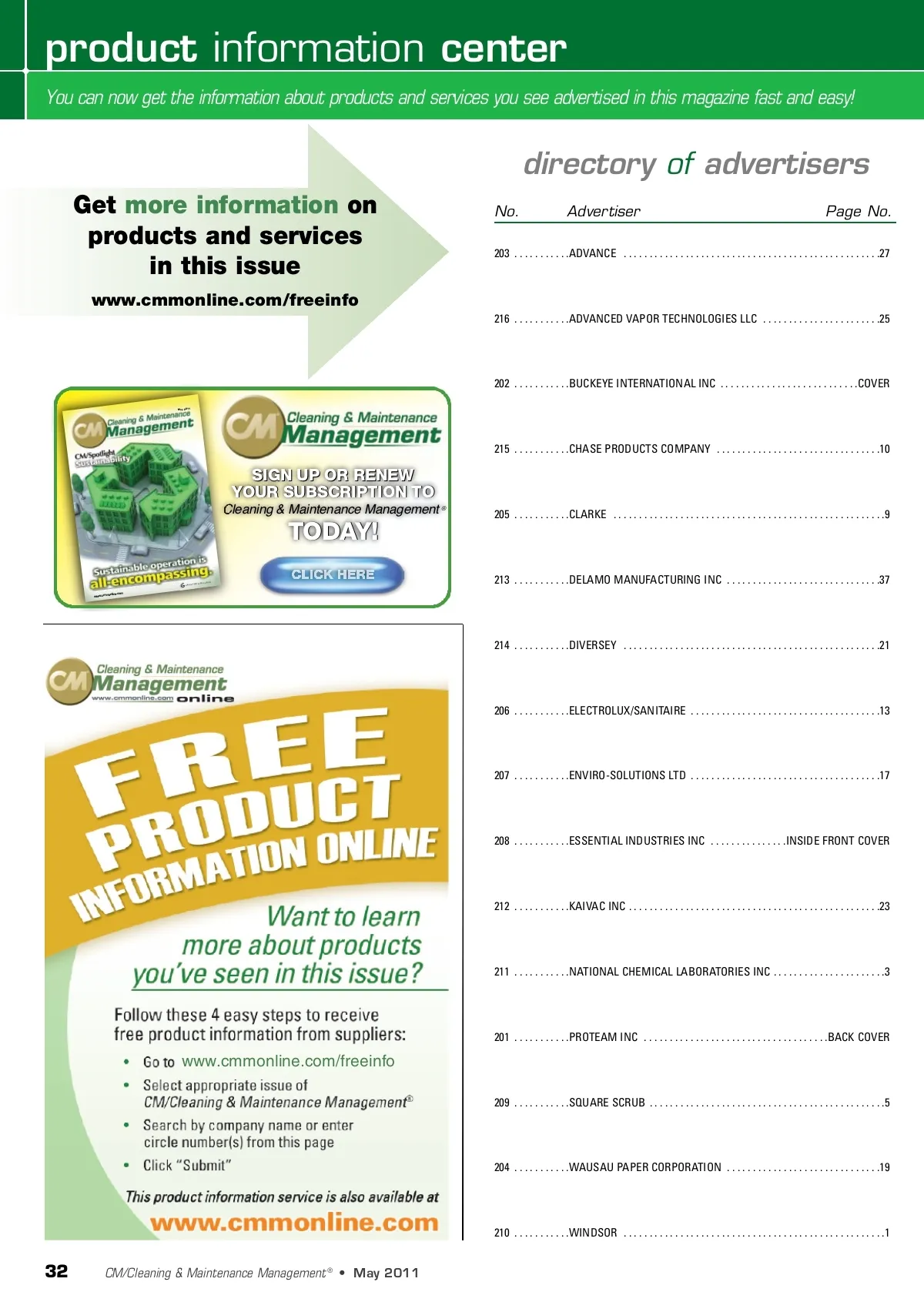 product information center You can now get the information about products and services you see advertised in this magazine fast and easy! directory of advertisers Get more information on products and services in this issue www.cmmonline.com/freeinfo 216 . . . . . . . . . . .ADVANCED VAPOR TECHNOLOGIES LLC . . . . . . . . . . . . . . . . . . . . . . .25 No. Advertiser Page No. 203 . . . . . . . . . . .ADVANCE . . . . . . . . . . . . . . . . . . . . . . . . . . . . . . . . . . . . . . . . . . . . . . . . . .27 202 . . . . . . . . . . .BUCKEYE INTERNATIONAL INC . . . . . . . . . . . . . . . . . . . . . . . . . . .COVER May 2011 215 . . . . . . . . . . .CHASE PRODUCTS COMPANY . . . . . . . . . . . . . . . . . . . . . . . . . . . . . . . .10 SIGN UP OR RENEW YOUR SUBSCRIPTION TO Cleaning & Maintenance Management ® 205 . . . . . . . . . . .CLARKE . . . . . . . . . . . . . . . . . . . . . . . . . . . . . . . . . . . . . . . . . . . . . . . . . . . . .9 TODAY! V G GRAND EDIA VIEW M GROUP 213 . . . . . . . . . . .DELAMO MANUFACTURING INC . . . . . . . . . . . . . . . . . . . . . . . . . . . . . .37 nline.com www.cmmo 214 . . . . . . . . . . .DIVERSEY . . . . . . . . . . . . . . . . . . . . . . . . . . . . . . . . . . . . . . . . . . . . . . . . . .21 206 . . . . . . . . . . .ELECTROLUX/SANITAIRE . . . . . . . . . . . . . . . . . . . . . . . . . . . . . . . . . . . . .13 207 . . . . . . . . . . .ENVIRO-SOLUTIONS LTD . . . . . . . . . . . . . . . . . . . . . . . . . . . . . . . . . . . . .17 208 . . . . . . . . . . .ESSENTIAL INDUSTRIES INC . . . . . . . . . . . . . . .INSIDE FRONT COVER 212 . . . . . . . . . . .KAIVAC INC . . . . . . . . . . . . . . . . . . . . . . . . . . . . . . . . . . . . . . . . . . . . . . . . .23 211 . . . . . . . . . . .NATIONAL CHEMICAL LABORATORIES INC . . . . . . . . . . . . . . . . . . . . . .3 201 . . . . . . . . . . .PROTEAM INC . . . . . . . . . . . . . . . . . . . . . . . . . . . . . . . . . . . .BACK COVER www.cmmonline.com/freeinfo 209 . . . . . . . . . . .SQUARE SCRUB . . . . . . . . . . . . . . . . . . . . . . . . . . . . . . . . . . . . . . . . . . . . . .5 204 . . . . . . . . . . .WAUSAU PAPER CORPORATION . . . . . . . . . . . . . . . . . . . . . . . . . . . . . .19 210 . . . . . . . . . . .WINDSOR . . . . . . . . . . . . . . . . . . . . . . . . . . . . . . . . . . . . . . . . . . . . . . . . . . .1 32 CM/Cleaning & Maintenance Management ® • May 2011