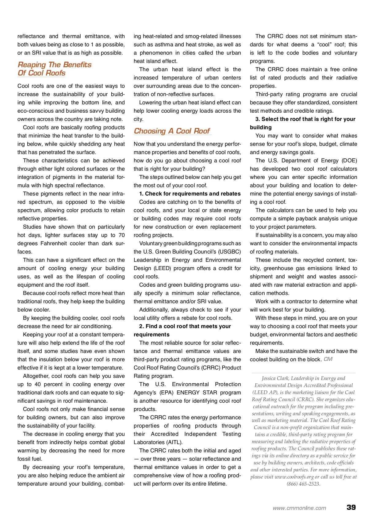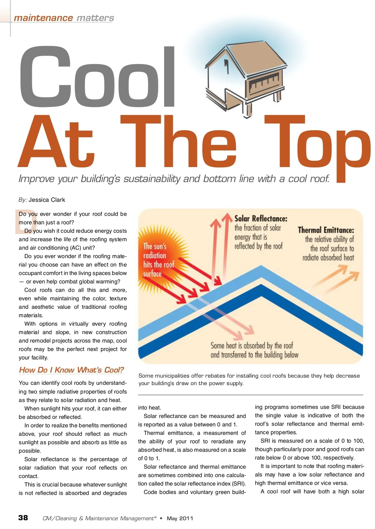 maintenance matters Cool By: Jessica Clark At The Top Improve your building’s sustainability and bottom line with a cool roof. D Do you ever wonder if your roof could be more than just a roof? Do you wish it could reduce energy costs and increase the life of the roofing system and air conditioning (AC) unit? Do you ever wonder if the roofing mate-rial you choose can have an effect on the occupant comfort in the living spaces below — or even help combat global warming? Cool roofs can do all this and more, even while maintaining the color, texture and aesthetic value of traditional roofing materials. With options in virtually every roofing material and slope, in new construction and remodel projects across the map, cool roofs may be the perfect next project for your facility. How Do I Know What’s Cool? You can identify cool roofs by understand-ing two simple radiative properties of roofs as they relate to solar radiation and heat. When sunlight hits your roof, it can either be absorbed or reflected. In order to realize the benefits mentioned above, your roof should reflect as much sunlight as possible and absorb as little as possible. Solar reflectance is the percentage of solar radiation that your roof reflects on contact. This is crucial because whatever sunlight is not reflected is absorbed and degrades Some municipalities offer rebates for installing cool roofs because they help decrease your building’s draw on the power supply. into heat. Solar reflectance can be measured and is reported as a value between 0 and 1. Thermal emittance, a measurement of the ability of your roof to reradiate any absorbed heat, is also measured on a scale of 0 to 1. Solar reflectance and thermal emittance are sometimes combined into one calcula-tion called the solar reflectance index (SRI). Code bodies and voluntary green build-ing programs sometimes use SRI because the single value is indicative of both the roof’s solar reflectance and thermal emit-tance properties. SRI is measured on a scale of 0 to 100, though particularly poor and good roofs can rate below 0 or above 100, respectively. It is important to note that roofing materi-als may have a low solar reflectance and high thermal emittance or vice versa. A cool roof will have both a high solar 38 CM/Cleaning & Maintenance Management ® • May 2011