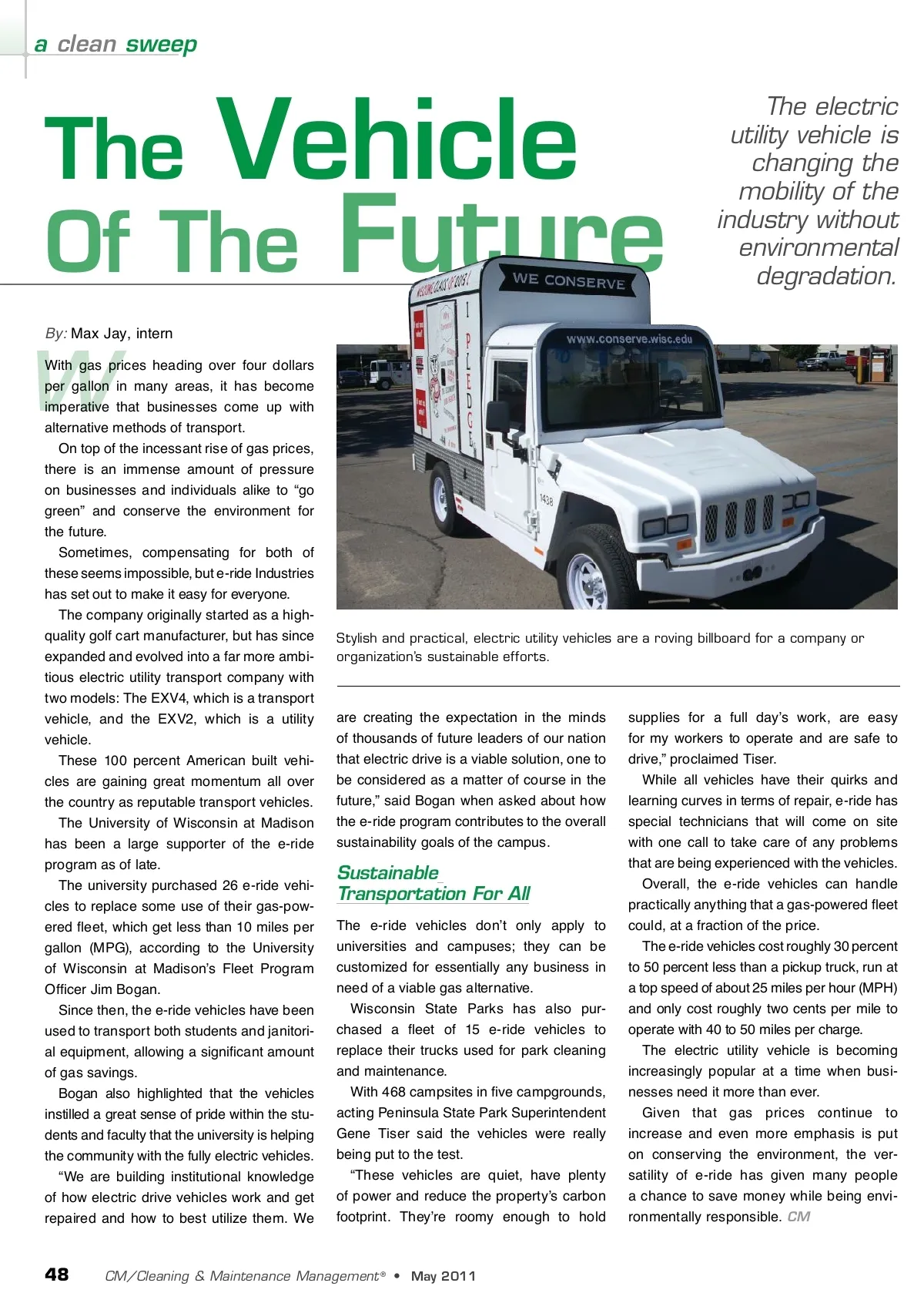 a clean sweep The Vehicle Of The Future By: Max Jay, intern The electric utility vehicle is changing the mobility of the industry without environmental degradation. W With gas prices heading over four dollars per gallon in many areas, it has become imperative that businesses come up with alternative methods of transport. On top of the incessant rise of gas prices, there is an immense amount of pressure on businesses and individuals alike to “go green” and conserve the environment for the future. Sometimes, compensating for both of these seems impossible, but e-ride Industries has set out to make it easy for everyone. The company originally started as a high-quality golf cart manufacturer, but has since expanded and evolved into a far more ambi-tious electric utility transport company with two models: The EXV4, which is a transport vehicle, and the EXV2, which is a utility vehicle. These 100 percent American built vehi-cles are gaining great momentum all over the country as reputable transport vehicles. The University of Wisconsin at Madison has been a large supporter of the e-ride program as of late. The university purchased 26 e-ride vehi-cles to replace some use of their gas-pow-ered fleet, which get less than 10 miles per gallon (MPG), according to the University of Wisconsin at Madison’s Fleet Program Officer Jim Bogan. Since then, the e-ride vehicles have been used to transport both students and janitori-al equipment, allowing a significant amount of gas savings. Bogan also highlighted that the vehicles instilled a great sense of pride within the stu-dents and faculty that the university is helping the community with the fully electric vehicles. “We are building institutional knowledge of how electric drive vehicles work and get repaired and how to best utilize them. We Stylish and practical, electric utility vehicles are a roving billboard for a company or organization’s sustainable efforts. are creating the expectation in the minds of thousands of future leaders of our nation that electric drive is a viable solution, one to be considered as a matter of course in the future,” said Bogan when asked about how the e-ride program contributes to the overall sustainability goals of the campus. Sustainable Transportation For All The e-ride vehicles don’t only apply to universities and campuses; they can be customized for essentially any business in need of a viable gas alternative. Wisconsin State Parks has also pur-chased a fleet of 15 e-ride vehicles to replace their trucks used for park cleaning and maintenance. With 468 campsites in five campgrounds, acting Peninsula State Park Superintendent Gene Tiser said the vehicles were really being put to the test. “These vehicles are quiet, have plenty of power and reduce the property’s carbon footprint. They’re roomy enough to hold supplies for a full day’s work, are easy for my workers to operate and are safe to drive,” proclaimed Tiser. While all vehicles have their quirks and learning curves in terms of repair, e-ride has special technicians that will come on site with one call to take care of any problems that are being experienced with the vehicles. Overall, the e-ride vehicles can handle practically anything that a gas-powered fleet could, at a fraction of the price. The e-ride vehicles cost roughly 30 percent to 50 percent less than a pickup truck, run at a top speed of about 25 miles per hour (MPH) and only cost roughly two cents per mile to operate with 40 to 50 miles per charge. The electric utility vehicle is becoming increasingly popular at a time when busi-nesses need it more than ever. Given that gas prices continue to increase and even more emphasis is put on conserving the environment, the ver-satility of e-ride has given many people a chance to save money while being envi-ronmentally responsible. CM 48 CM/Cleaning & Maintenance Management ® • May 2011