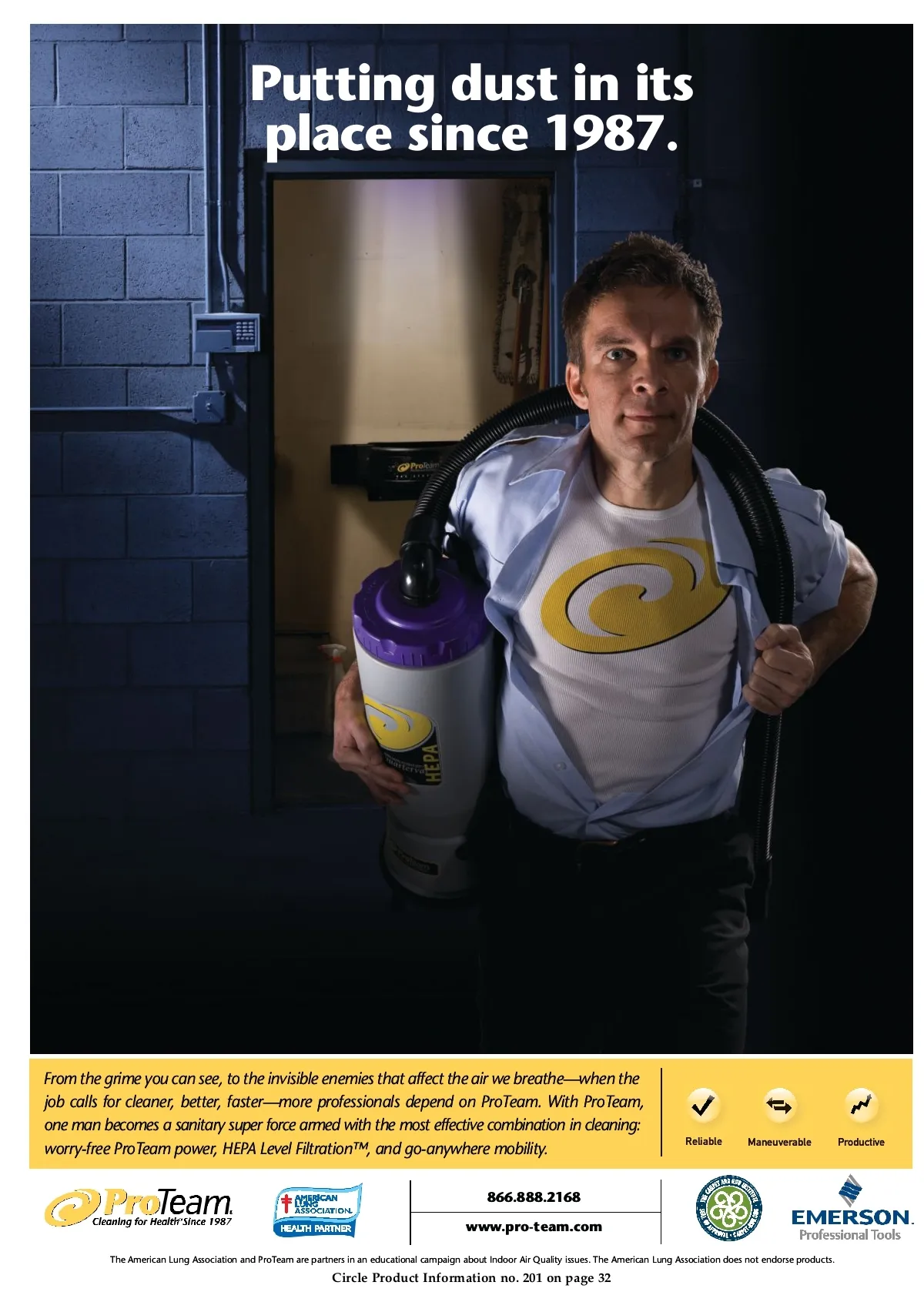 Putting dust in its place since 1987. From the grime you can see, s to the invisible enemies that affect a the air we breathe—when n the job calls for cleaner, better, faster—more professionals depend on ProTeam. With ProTeam, one man becomes a sanitary super force armed with the most effective combination in cleaning: worry-free ProTeam power, HEPA Level Filtration™, and go-anywhere mobility. 866.888.2168 www.pro-team.com Reliable Maneuverable Pr oductiv e Productive The American Lung Association and ProTeam are partners in an educational campaign about Indoor Air Quality issues. The American Lung Association does not endorse products. ucts. Circle Product Information no. 201 on page 32