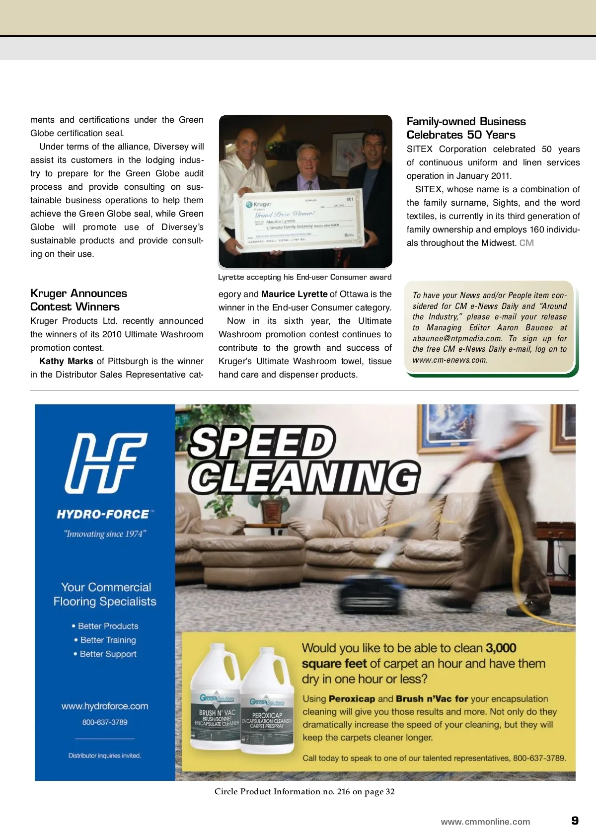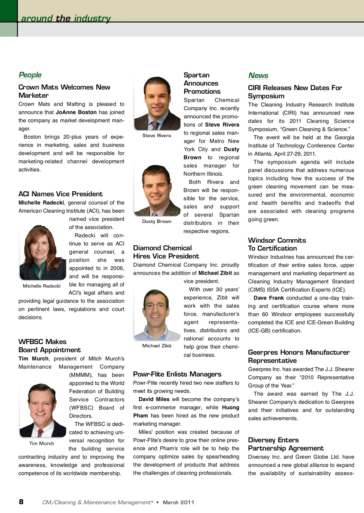 around the industry People Crown Mats Welcomes New Marketer Crown Mats and Matting is pleased to announce that JoAnne Boston has joined the company as market development man-ager. Boston brings 20-plus years of expe-rience in marketing, sales and business development and will be responsible for marketing-related channel development activities. Spartan Announces Promotions Spartan Chemical Company Inc. recently announced the promo-tions of Steve Rivera to regional sales man-ager for Metro New York City and Dusty Brown to regional sales manager for Northern Illinois. Both Rivera and Brown will be respon-sible for the service, sales and support of several Spartan distributors in their respective regions. News CIRI Releases New Dates For Symposium The Cleaning Industry Research Institute International (CIRI) has announced new dates for its 2011 Cleaning Science Symposium, “Green Cleaning & Science.” The event will be held at the Georgia Institute of Technology Conference Center in Atlanta, April 27-29, 2011. The symposium agenda will include panel discussions that address numerous topics including how the success of the green cleaning movement can be mea-sured and the environmental, economic and health benefits and tradeoffs that are associated with cleaning programs going green. Steve Rivera ACI Names Vice President Michelle Radecki , general counsel of the American Cleaning Institute (ACI), has been named vice president of the association. Radecki will con-tinue to serve as ACI general counsel, a position she was appointed to in 2006, and will be responsi-ble for managing all of Michelle Radecki ACI’s legal affairs and providing legal guidance to the association on pertinent laws, regulations and court decisions. Dusty Brown Diamond Chemical Hires Vice President Diamond Chemical Company Inc. proudly announces the addition of Michael Zibit as vice president. With over 30 years’ experience, Zibit will work with the sales force, manufacturer’s agent representa-tives, distributors and national accounts to Michael Zibit help grow their chemi-cal business. Windsor Commits To Certification Windsor Industries has announced the cer-tification of their entire sales force, upper management and marketing department as Cleaning Industry Management Standard (CIMS) ISSA Certification Experts (ICE). Dave Frank conducted a one-day train-ing and certification course where more than 60 Windsor employees successfully completed the ICE and ICE-Green Building (ICE-GB) certification. WFBSC Makes Board Appointment Tim Murch , president of Mitch Murch’s Maintenance Management Company (MMMM), has been appointed to the World Federation of Building Service Contractors (WFBSC) Board of Directors. The WFBSC is dedi-cated to achieving uni-versal recognition for Tim Murch the building service contracting industry and to improving the awareness, knowledge and professional competence of its worldwide membership. Geerpres Honors Manufacturer Representative Geerpres Inc. has awarded The J.J. Shearer Company as their “2010 Representative Group of the Year.” The award was earned by The J.J. Shearer Company’s dedication to Geerpres and their initiatives and for outstanding sales achievements. Powr-Flite Enlists Managers Powr-Flite recently hired two new staffers to meet its growing needs. David Miles will become the company’s first e-commerce manager, while Huong Pham has been hired as the new product marketing manager. Miles’ position was created because of Powr-Flite’s desire to grow their online pres-ence and Pham’s role will be to help the company optimize sales by spearheading the development of products that address the challenges of cleaning professionals. Diversey Enters Partnership Agreement Diversey Inc. and Green Globe Ltd. have announced a new global alliance to expand the availability of sustainability assess-8 CM/Cleaning & Maintenance Management ® • March 2011