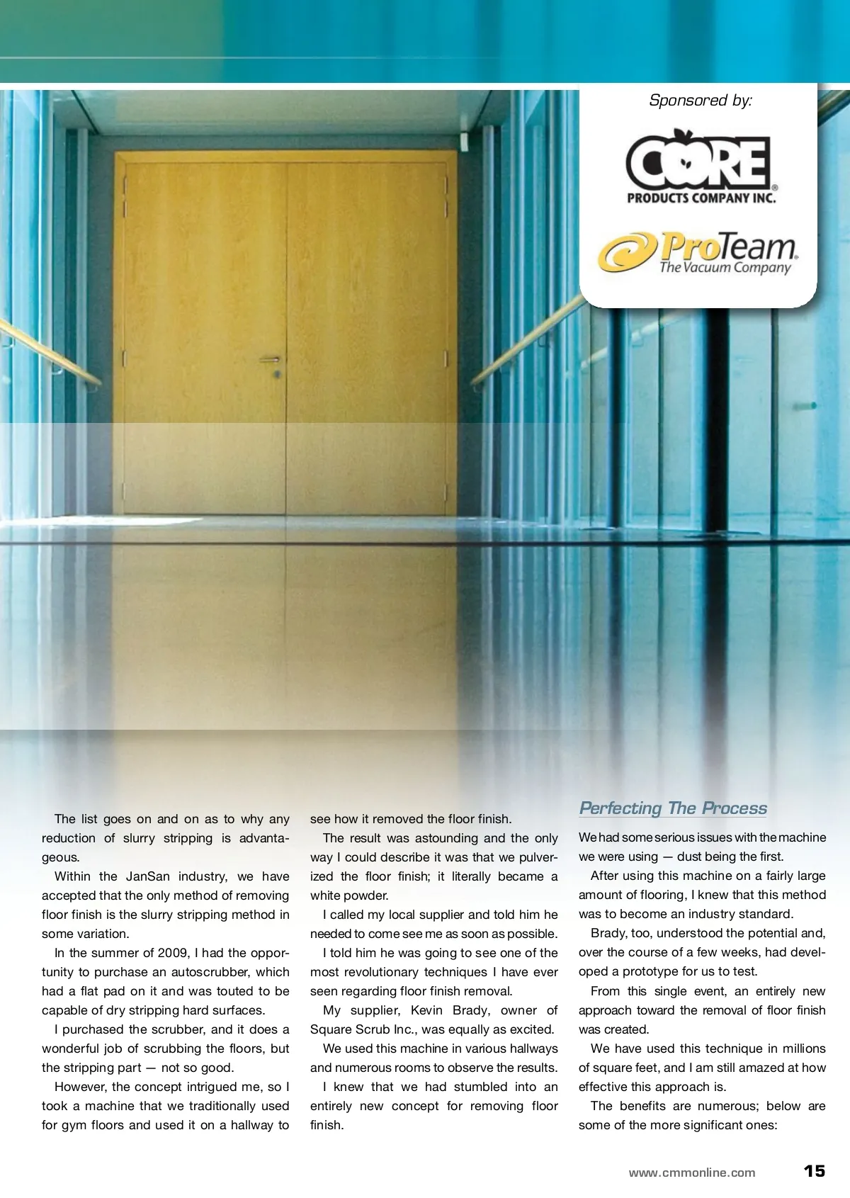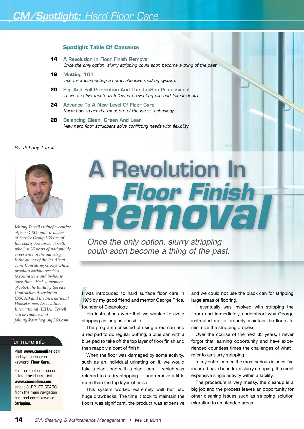 CM/Spotlight: Hard Floor Care Spotlight Table Of Contents 14 18 20 24 28 A Revolution In Floor Finish Removal Once the only option, slurry stripping could soon become a thing of the past. Matting 101 Tips for implementing a comprehensive matting system. Slip And Fall Prevention And The JanSan Professional There are five facets to follow in preventing slip and fall incidents. Advance To A New Level Of Floor Care Know how to get the most out of the latest technology. Balancing Clean, Green And Lean New hard floor scrubbers solve conflicting needs with flexibility. By: Johnny Terrell A Revolution In Johnny Terrell is chief executive officer (CEO) and co-owner of Service Group 360 Inc. of Jonesboro, Arkansas. Terrell, who has 35 years of nationwide experience in the industry, is the owner of the It’s About Time Consulting Group, which provides various services to contractors and in-house operations. He is a member of ISSA, the Building Service Contractors Association (BSCAI) and the International Housekeepers Association International (IEHA). Terrell can be contacted at [email protected]. Removal Once the only option, slurry stripping could soon become a thing of the past. Floor Finish I for more info Visit www.cmmonline.com and type in search keyword: Floor Care . For more information on related products, visit www.cmmonline.com , select SUPPLIER SEARCH from the main navigation bar, and enter keyword: Stripping . I was introduced to hard surface floor care in 1975 by my good friend and mentor George Price, founder of Cleanology. His instructions were that we wanted to avoid stripping as long as possible. The program consisted of using a red can and a red pad to do regular buffing, a blue can with a blue pad to take off the top layer of floor finish and then reapply a coat of finish. When the floor was damaged by some activity, such as an individual urinating on it, we would take a black pad with a black can — which was referred to as dry stripping — and remove a little more than the top layer of finish. This system worked extremely well but had huge drawbacks: The time it took to maintain the floors was significant, the product was expensive and we could not use the black can for stripping large areas of flooring. I eventually was involved with stripping the floors and immediately understood why George instructed me to properly maintain the floors to minimize the stripping process. Over the course of the next 33 years, I never forgot that learning opportunity and have expe-rienced countless times the challenges of what I refer to as slurry stripping. In my entire career, the most serious injuries I’ve incurred have been from slurry stripping, the most expensive single activity within a facility. The procedure is very messy, the cleanup is a big job and the process leaves an opportunity for other cleaning issues such as stripping solution migrating to unintended areas. 14 CM/Cleaning & Maintenance Management ® • March 2011