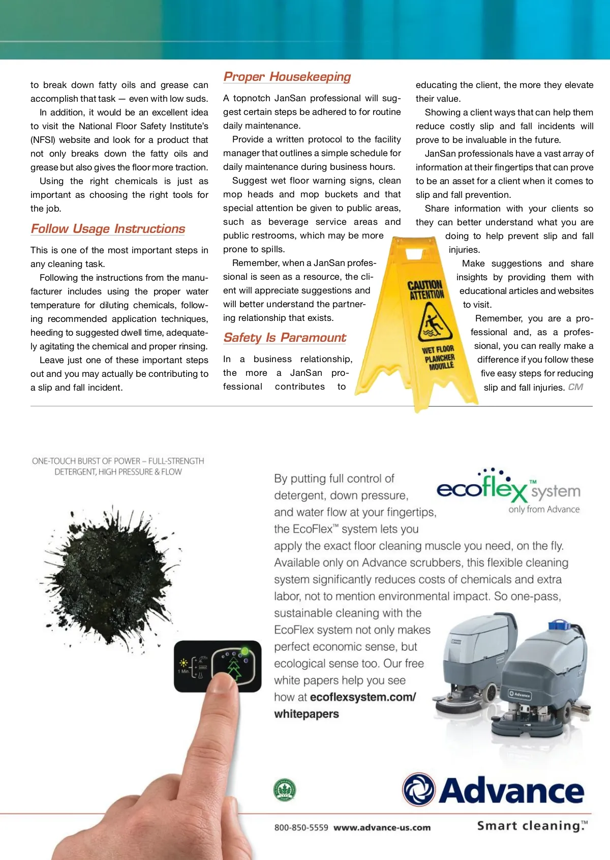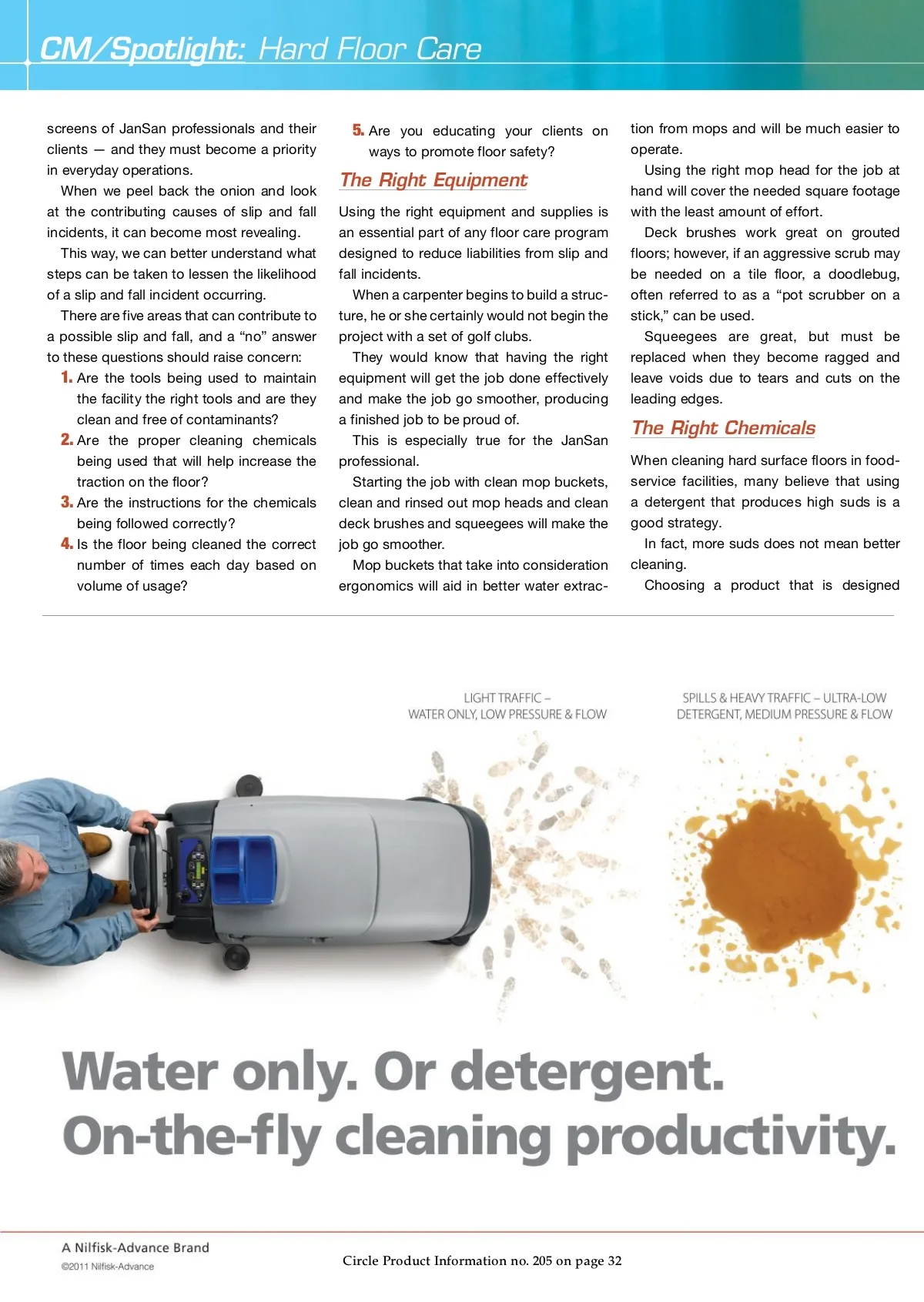 CM/Spotlight: Hard Floor Care screens of JanSan professionals and their clients — and they must become a priority in everyday operations. When we peel back the onion and look at the contributing causes of slip and fall incidents, it can become most revealing. This way, we can better understand what steps can be taken to lessen the likelihood of a slip and fall incident occurring. There are five areas that can contribute to a possible slip and fall, and a “no” answer to these questions should raise concern: 1. Are the tools being used to maintain the facility the right tools and are they clean and free of contaminants? 2. Are the proper cleaning chemicals being used that will help increase the traction on the floor? 3. Are the instructions for the chemicals being followed correctly? 4. Is the floor being cleaned the correct number of times each day based on volume of usage? 5. Are you educating your clients on ways to promote floor safety? The Right Equipment Using the right equipment and supplies is an essential part of any floor care program designed to reduce liabilities from slip and fall incidents. When a carpenter begins to build a struc-ture, he or she certainly would not begin the project with a set of golf clubs. They would know that having the right equipment will get the job done effectively and make the job go smoother, producing a finished job to be proud of. This is especially true for the JanSan professional. Starting the job with clean mop buckets, clean and rinsed out mop heads and clean deck brushes and squeegees will make the job go smoother. Mop buckets that take into consideration ergonomics will aid in better water extrac-tion from mops and will be much easier to operate. Using the right mop head for the job at hand will cover the needed square footage with the least amount of effort. Deck brushes work great on grouted floors; however, if an aggressive scrub may be needed on a tile floor, a doodlebug, often referred to as a “pot scrubber on a stick,” can be used. Squeegees are great, but must be replaced when they become ragged and leave voids due to tears and cuts on the leading edges. The Right Chemicals When cleaning hard surface floors in food-service facilities, many believe that using a detergent that produces high suds is a good strategy. In fact, more suds does not mean better cleaning. Choosing a product that is designed Circle Product Information no. 205 on page 32