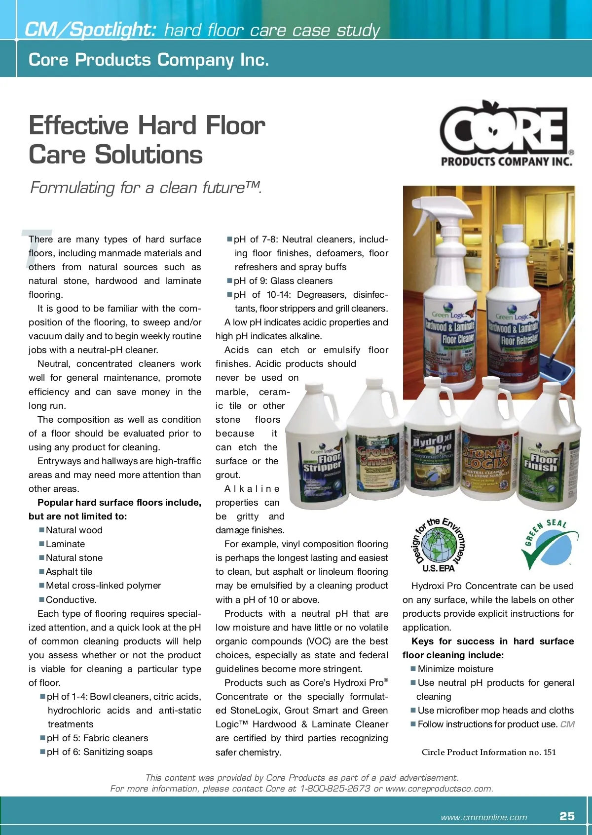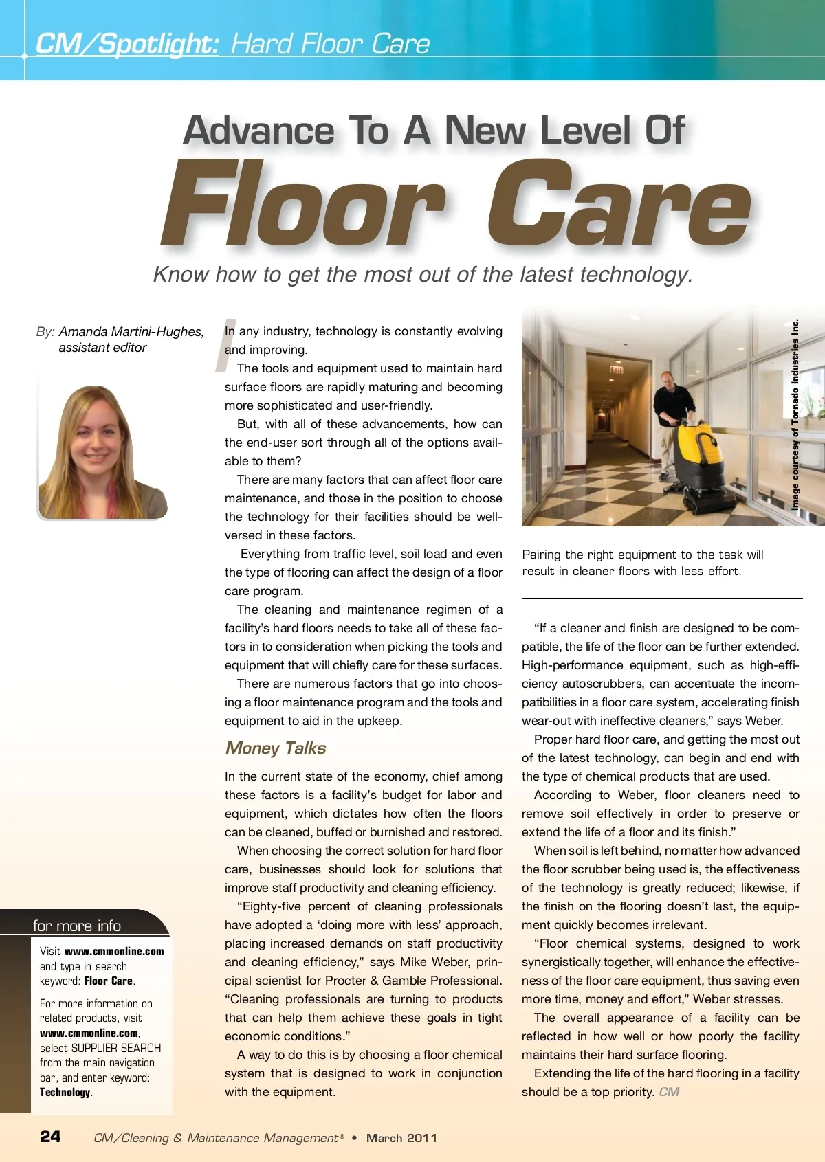 CM/Spotlight: Hard Floor Care Advance To A New Level Of Floor Care Know how to get the most out of the latest technology. By: Amanda Martini-Hughes, assistant editor I In any industry, technology is constantly evolving and improving. The tools and equipment used to maintain hard surface floors are rapidly maturing and becoming more sophisticated and user-friendly. But, with all of these advancements, how can the end-user sort through all of the options avail-able to them? There are many factors that can affect floor care maintenance, and those in the position to choose the technology for their facilities should be well-versed in these factors. Everything from traffic level, soil load and even the type of flooring can affect the design of a floor care program. The cleaning and maintenance regimen of a facility’s hard floors needs to take all of these fac-tors in to consideration when picking the tools and equipment that will chiefly care for these surfaces. There are numerous factors that go into choos-ing a floor maintenance program and the tools and equipment to aid in the upkeep. Pairing the right equipment to the task will result in cleaner floors with less effort. Money Talks In the current state of the economy, chief among these factors is a facility’s budget for labor and equipment, which dictates how often the floors can be cleaned, buffed or burnished and restored. When choosing the correct solution for hard floor care, businesses should look for solutions that improve staff productivity and cleaning efficiency. “Eighty-five percent of cleaning professionals have adopted a ‘doing more with less’ approach, placing increased demands on staff productivity and cleaning efficiency,” says Mike Weber, prin-cipal scientist for Procter & Gamble Professional. “Cleaning professionals are turning to products that can help them achieve these goals in tight economic conditions.” A way to do this is by choosing a floor chemical system that is designed to work in conjunction with the equipment. for more info Visit www.cmmonline.com and type in search keyword: Floor Care . For more information on related products, visit www.cmmonline.com , select SUPPLIER SEARCH from the main navigation bar, and enter keyword: Technology . “If a cleaner and finish are designed to be com-patible, the life of the floor can be further extended. High-performance equipment, such as high-effi-ciency autoscrubbers, can accentuate the incom-patibilities in a floor care system, accelerating finish wear-out with ineffective cleaners,” says Weber. Proper hard floor care, and getting the most out of the latest technology, can begin and end with the type of chemical products that are used. According to Weber, floor cleaners need to remove soil effectively in order to preserve or extend the life of a floor and its finish.” When soil is left behind, no matter how advanced the floor scrubber being used is, the effectiveness of the technology is greatly reduced; likewise, if the finish on the flooring doesn’t last, the equip-ment quickly becomes irrelevant. “Floor chemical systems, designed to work synergistically together, will enhance the effective-ness of the floor care equipment, thus saving even more time, money and effort,” Weber stresses. The overall appearance of a facility can be reflected in how well or how poorly the facility maintains their hard surface flooring. Extending the life of the hard flooring in a facility should be a top priority. CM 24 CM/Cleaning & Maintenance Management ® • March 2011 Image courtesy of Tornado Industries Inc.