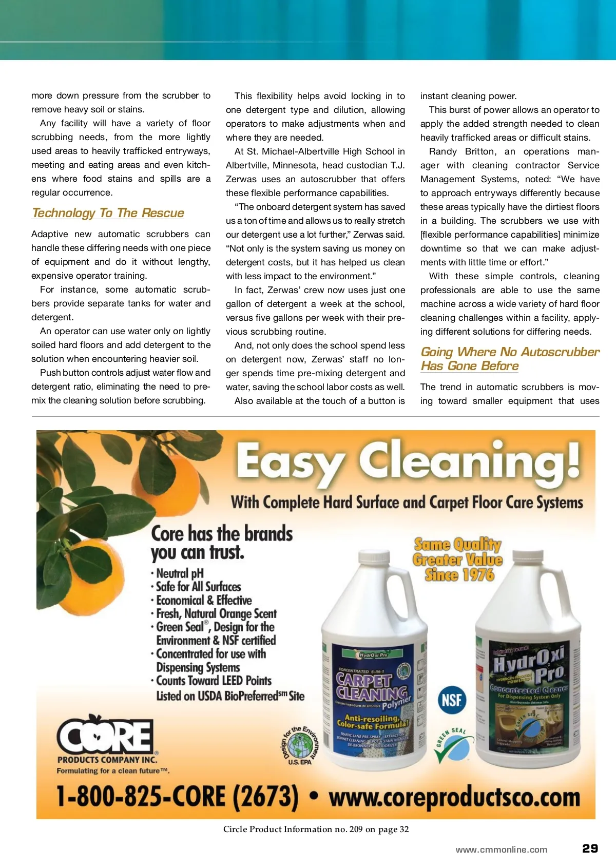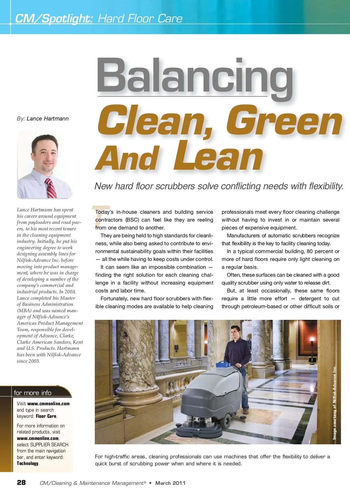 CM/Spotlight: Hard Floor Care Balancing By: Lance Hartmann Clean, Green And Lean New hard floor scrubbers solve conflicting needs with flexibility. Lance Hartmann has spent his career around equipment from payloaders and road pav-ers, to his most recent tenure in the cleaning equipment industry. Initially, he put his engineering degree to work designing assembly lines for Nilfisk-Advance Inc. before moving into product manage-ment, where he was in charge of developing a number of the company’s commercial and industrial products. In 2010, Lance completed his Master of Business Administration (MBA) and was named man-ager of Nilfisk-Advance’s Americas Product Management Team, responsible for devel-opment of Advance, Clarke, Clarke American Sanders, Kent and U.S. Products. Hartmann has been with Nilfisk-Advance since 2003. T Today’s in-house cleaners and building service contractors (BSC) can feel like they are reeling from one demand to another. They are being held to high standards for cleanli-ness, while also being asked to contribute to envi-ronmental sustainability goals within their facilities — all the while having to keep costs under control. It can seem like an impossible combination — finding the right solution for each cleaning chal-lenge in a facility without increasing equipment costs and labor time. Fortunately, new hard floor scrubbers with flex-ible cleaning modes are available to help cleaning professionals meet every floor cleaning challenge without having to invest in or maintain several pieces of expensive equipment. Manufacturers of automatic scrubbers recognize that flexibility is the key to facility cleaning today. In a typical commercial building, 80 percent or more of hard floors require only light cleaning on a regular basis. Often, these surfaces can be cleaned with a good quality scrubber using only water to release dirt. But, at least occasionally, these same floors require a little more effort — detergent to cut through petroleum-based or other difficult soils or for more info Visit www.cmmonline.com and type in search keyword: Floor Care . For more information on related products, visit www.cmmonline.com , select SUPPLIER SEARCH from the main navigation bar, and enter keyword: Technology . For high-traffic areas, cleaning professionals can use machines that offer the flexibility to deliver a quick burst of scrubbing power when and where it is needed. 28 CM/Cleaning & Maintenance Management ® • March 2011 Image courtesy of Nilfisk-Advance Inc.