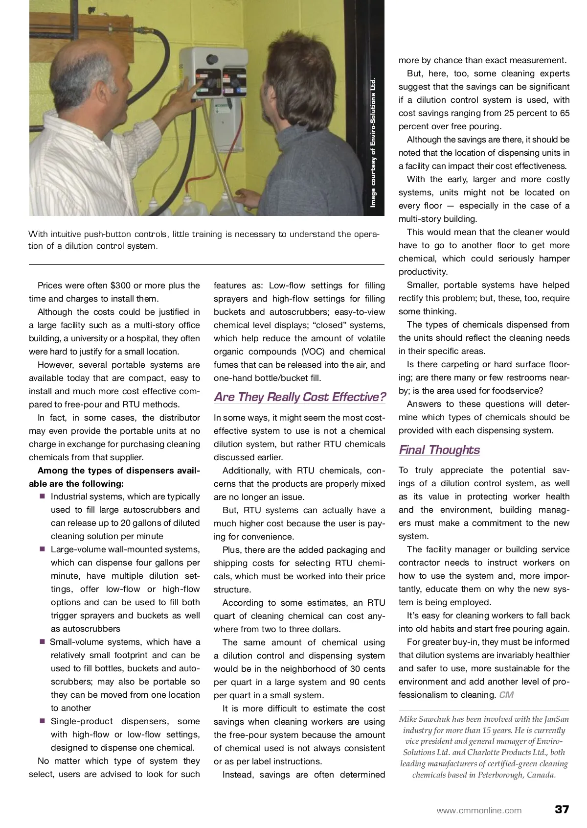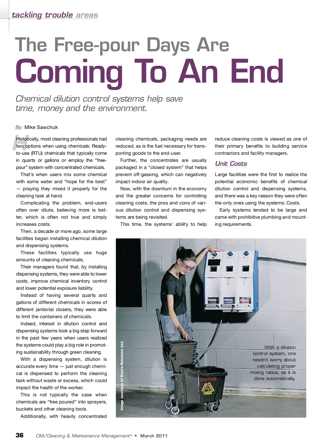 tackling trouble areas The Free-pour Days Are Coming To An End Chemical dilution control systems help save time, money and the environment. By: Mike Sawchuk H Historically, most cleaning professionals had two options when using chemicals: Ready-to-use (RTU) chemicals that typically come in quarts or gallons or employ the “free-pour” system with concentrated chemicals. That’s when users mix some chemical with some water and “hope for the best” — praying they mixed it properly for the cleaning task at hand. Complicating the problem, end-users often over dilute, believing more is bet-ter, which is often not true and simply increases costs. Then, a decade or more ago, some large facilities began installing chemical dilution and dispensing systems. These facilities typically use huge amounts of cleaning chemicals. Their managers found that, by installing dispensing systems, they were able to lower costs, improve chemical inventory control and lower potential exposure liability. Instead of having several quarts and gallons of different chemicals in scores of different janitorial closets, they were able to limit the containers of chemicals. Indeed, interest in dilution control and dispensing systems took a big step forward in the past few years when users realized the systems could play a big role in promot-ing sustainability through green cleaning. With a dispensing system, dilution is accurate every time — just enough chemi-cal is dispensed to perform the cleaning task without waste or excess, which could impact the health of the worker. This is not typically the case when chemicals are “free poured” into sprayers, buckets and other cleaning tools. Additionally, with heavily concentrated cleaning chemicals, packaging needs are reduced, as is the fuel necessary for trans-porting goods to the end-user. Further, the concentrates are usually packaged in a “closed system” that helps prevent off-gassing, which can negatively impact indoor air quality. Now, with the downturn in the economy and the greater concerns for controlling cleaning costs, the pros and cons of vari-ous dilution control and dispensing sys-tems are being revisited. This time, the systems’ ability to help reduce cleaning costs is viewed as one of their primary benefits to building service contractors and facility managers. Unit Costs Large facilities were the first to realize the potential economic benefits of chemical dilution control and dispensing systems, and there was a key reason they were often the only ones using the systems: Costs. Early systems tended to be large and came with prohibitive plumbing and mount-ing requirements. Image courtesy of Enviro-Solutions Ltd. With a dilution control system, one needn’t worry about calculating proper mixing ratios, as it is done automatically. 36 CM/Cleaning & Maintenance Management ® • March 2011