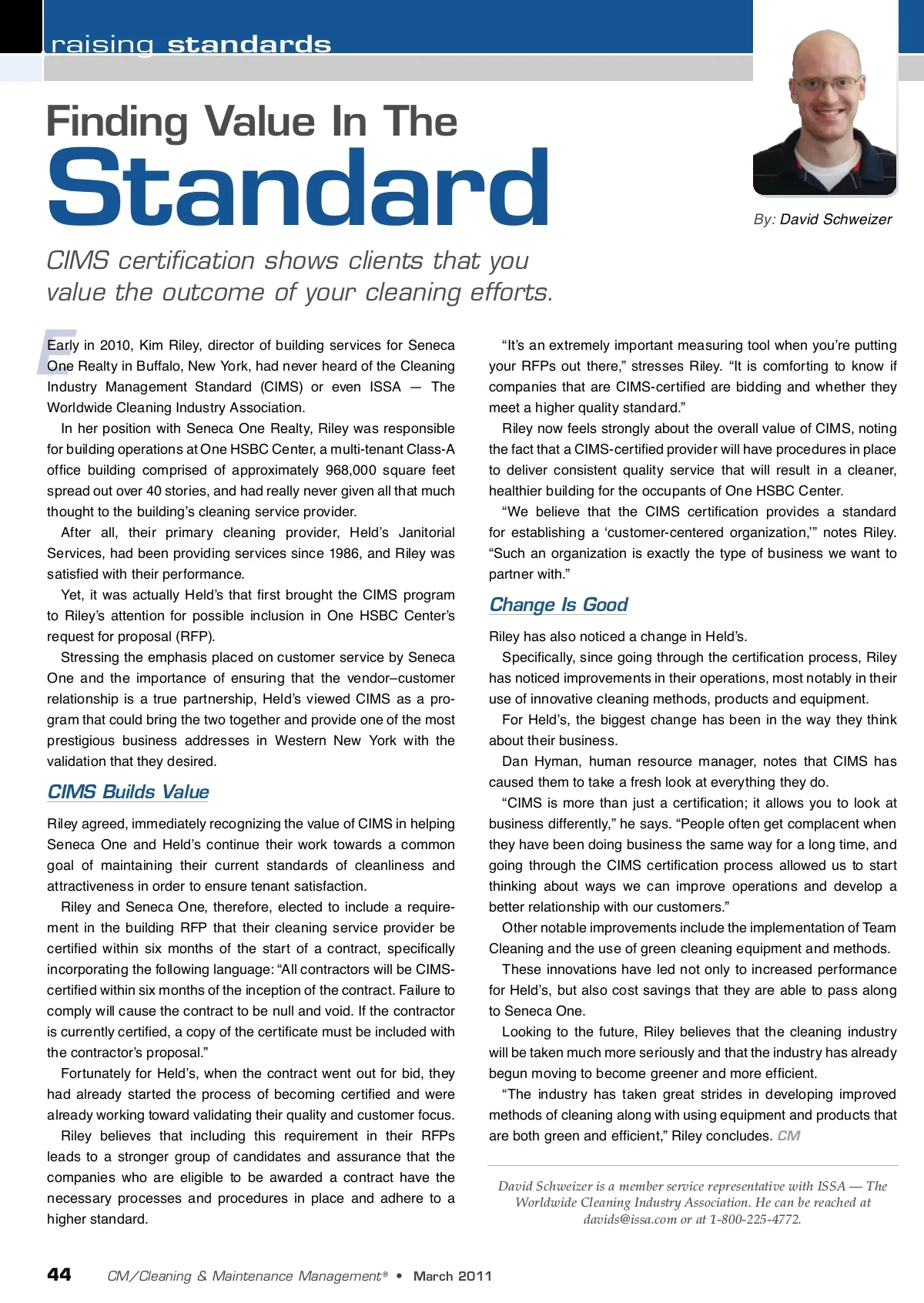 raising standards Finding Value In The Standard CIMS certification shows clients that you value the outcome of your cleaning efforts. By: David Schweizer E Early in 2010, Kim Riley, director of building services for Seneca One Realty in Buffalo, New York, had never heard of the Cleaning Industry Management Standard (CIMS) or even ISSA — The Worldwide Cleaning Industry Association. In her position with Seneca One Realty, Riley was responsible for building operations at One HSBC Center, a multi-tenant Class-A office building comprised of approximately 968,000 square feet spread out over 40 stories, and had really never given all that much thought to the building’s cleaning service provider. After all, their primary cleaning provider, Held’s Janitorial Services, had been providing services since 1986, and Riley was satisfied with their performance. Yet, it was actually Held’s that first brought the CIMS program to Riley’s attention for possible inclusion in One HSBC Center’s request for proposal (RFP). Stressing the emphasis placed on customer service by Seneca One and the importance of ensuring that the vendor–customer relationship is a true partnership, Held’s viewed CIMS as a pro-gram that could bring the two together and provide one of the most prestigious business addresses in Western New York with the validation that they desired. “It’s an extremely important measuring tool when you’re putting your RFPs out there,” stresses Riley. “It is comforting to know if companies that are CIMS-certified are bidding and whether they meet a higher quality standard.” Riley now feels strongly about the overall value of CIMS, noting the fact that a CIMS-certified provider will have procedures in place to deliver consistent quality service that will result in a cleaner, healthier building for the occupants of One HSBC Center. “We believe that the CIMS certification provides a standard for establishing a ‘customer-centered organization,’” notes Riley. “Such an organization is exactly the type of business we want to partner with.” Change Is Good Riley has also noticed a change in Held’s. Specifically, since going through the certification process, Riley has noticed improvements in their operations, most notably in their use of innovative cleaning methods, products and equipment. For Held’s, the biggest change has been in the way they think about their business. Dan Hyman, human resource manager, notes that CIMS has caused them to take a fresh look at everything they do. “CIMS is more than just a certification; it allows you to look at business differently,” he says. “People often get complacent when they have been doing business the same way for a long time, and going through the CIMS certification process allowed us to start thinking about ways we can improve operations and develop a better relationship with our customers.” Other notable improvements include the implementation of Team Cleaning and the use of green cleaning equipment and methods. These innovations have led not only to increased performance for Held’s, but also cost savings that they are able to pass along to Seneca One. Looking to the future, Riley believes that the cleaning industry will be taken much more seriously and that the industry has already begun moving to become greener and more efficient. “The industry has taken great strides in developing improved methods of cleaning along with using equipment and products that are both green and efficient,” Riley concludes. CM CIMS Builds Value Riley agreed, immediately recognizing the value of CIMS in helping Seneca One and Held’s continue their work towards a common goal of maintaining their current standards of cleanliness and attractiveness in order to ensure tenant satisfaction. Riley and Seneca One, therefore, elected to include a require-ment in the building RFP that their cleaning service provider be certified within six months of the start of a contract, specifically incorporating the following language: “All contractors will be CIMS-certified within six months of the inception of the contract. Failure to comply will cause the contract to be null and void. If the contractor is currently certified, a copy of the certificate must be included with the contractor’s proposal.” Fortunately for Held’s, when the contract went out for bid, they had already started the process of becoming certified and were already working toward validating their quality and customer focus. Riley believes that including this requirement in their RFPs leads to a stronger group of candidates and assurance that the companies who are eligible to be awarded a contract have the necessary processes and procedures in place and adhere to a higher standard. David Schweizer is a member service representative with ISSA — The Worldwide Cleaning Industry Association. He can be reached at [email protected] or at 1-800-225-4772. 44 CM/Cleaning & Maintenance Management ® • March 2011