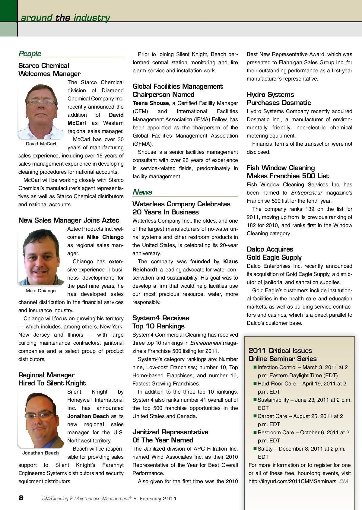 around the industry People Starco Chemical Welcomes Manager The Starco Chemical division of Diamond Chemical Company Inc. recently announced the addition of David McCarl as Western regional sales manager. McCarl has over 30 David McCarl years of manufacturing sales experience, including over 15 years of sales management experience in developing cleaning procedures for national accounts. McCarl will be working closely with Starco Chemical’s manufacturer’s agent representa-tives as well as Starco Chemical distributors and national accounts. Prior to joining Silent Knight, Beach per-formed central station monitoring and fire alarm service and installation work. Best New Representative Award, which was presented to Flannigan Sales Group Inc. for their outstanding performance as a first-year manufacturer’s representative. Global Facilities Management Chairperson Named Teena Shouse , a Certified Facility Manager (CFM) and International Facilities Management Association (IFMA) Fellow, has been appointed as the chairperson of the Global Facilities Management Association (GFMA). Shouse is a senior facilities management consultant with over 26 years of experience in service-related fields, predominately in facility management. Hydro Systems Purchases Dosmatic Hydro Systems Company recently acquired Dosmatic Inc., a manufacturer of environ-mentally friendly, non-electric chemical metering equipment. Financial terms of the transaction were not disclosed. Fish Window Cleaning Makes Franchise 500 List Fish Window Cleaning Services Inc. has been named to Entrepreneur magazine’s Franchise 500 list for the tenth year. The company ranks 139 on the list for 2011, moving up from its previous ranking of 182 for 2010, and ranks first in the Window Cleaning category. News Waterless Company Celebrates 20 Years In Business Waterless Company Inc., the oldest and one of the largest manufacturers of no-water uri-nal systems and other restroom products in the United States, is celebrating its 20-year anniversary. The company was founded by Klaus Reichardt , a leading advocate for water con-servation and sustainability: His goal was to develop a firm that would help facilities use our most precious resource, water, more responsibly. New Sales Manager Joins Aztec Aztec Products Inc. wel-comes Mike Chiango as regional sales man-ager. Chiango has exten-sive experience in busi-ness development; for the past nine years, he Mike Chiango has developed sales channel distribution in the financial services and insurance industry. Chiango will focus on growing his territory — which includes, among others, New York, New Jersey and Illinois — with large building maintenance contractors, janitorial companies and a select group of product distributors. Dalco Acquires Gold Eagle Supply Dalco Enterprises Inc. recently announced its acquisition of Gold Eagle Supply, a distrib-utor of janitorial and sanitation supplies. Gold Eagle’s customers include institution-al facilities in the health care and education markets, as well as building service contrac-tors and casinos, which is a direct parallel to Dalco’s customer base. System4 Receives Top 10 Rankings System4 Commercial Cleaning has received three top 10 rankings in Entrepreneur maga-zine’s Franchise 500 listing for 2011. System4’s category rankings are: Number nine, Low-cost Franchises; number 10, Top Home-based Franchises; and number 10, Fastest Growing Franchises. In addition to the three top 10 rankings, System4 also ranks number 41 overall out of the top 500 franchise opportunities in the United States and Canada. 2011 Critical Issues Online Seminar Series Infection Control – March 3, 2011 at 2 p.m. Eastern Daylight Time (EDT) Hard Floor Care – April 19, 2011 at 2 p.m. EDT Sustainability – June 23, 2011 at 2 p.m. EDT Carpet Care – August 25, 2011 at 2 p.m. EDT Restroom Care – October 6, 2011 at 2 p.m. EDT Safety – December 8, 2011 at 2 p.m. EDT For more information or to register for one or all of these free, hour-long events, visit http://tinyurl.com/2011CMMSeminars. CM Regional Manager Hired To Silent Knight Silent Knight by Honeywell International Inc. has announced Jonathan Beach as its new regional sales manager for the U.S. Northwest territory. Beach will be respon-Jonathan Beach sible for providing sales support to Silent Knight’s Farenhyt Engineered Systems distributors and security equipment distributors. Janitized Representative Of The Year Named The Janitized division of APC Filtration Inc. named Wind Associates Inc. as their 2010 Representative of the Year for Best Overall Performance. Also given for the first time was the 2010 8 CM/Cleaning & Maintenance Management ® • February 2011