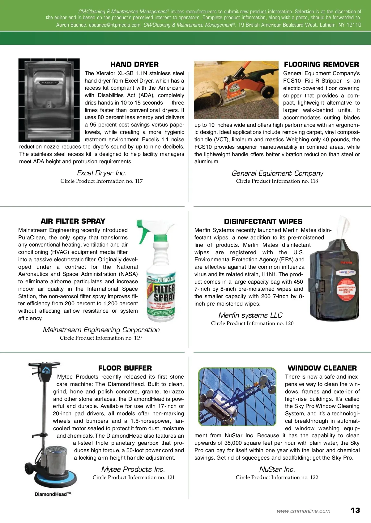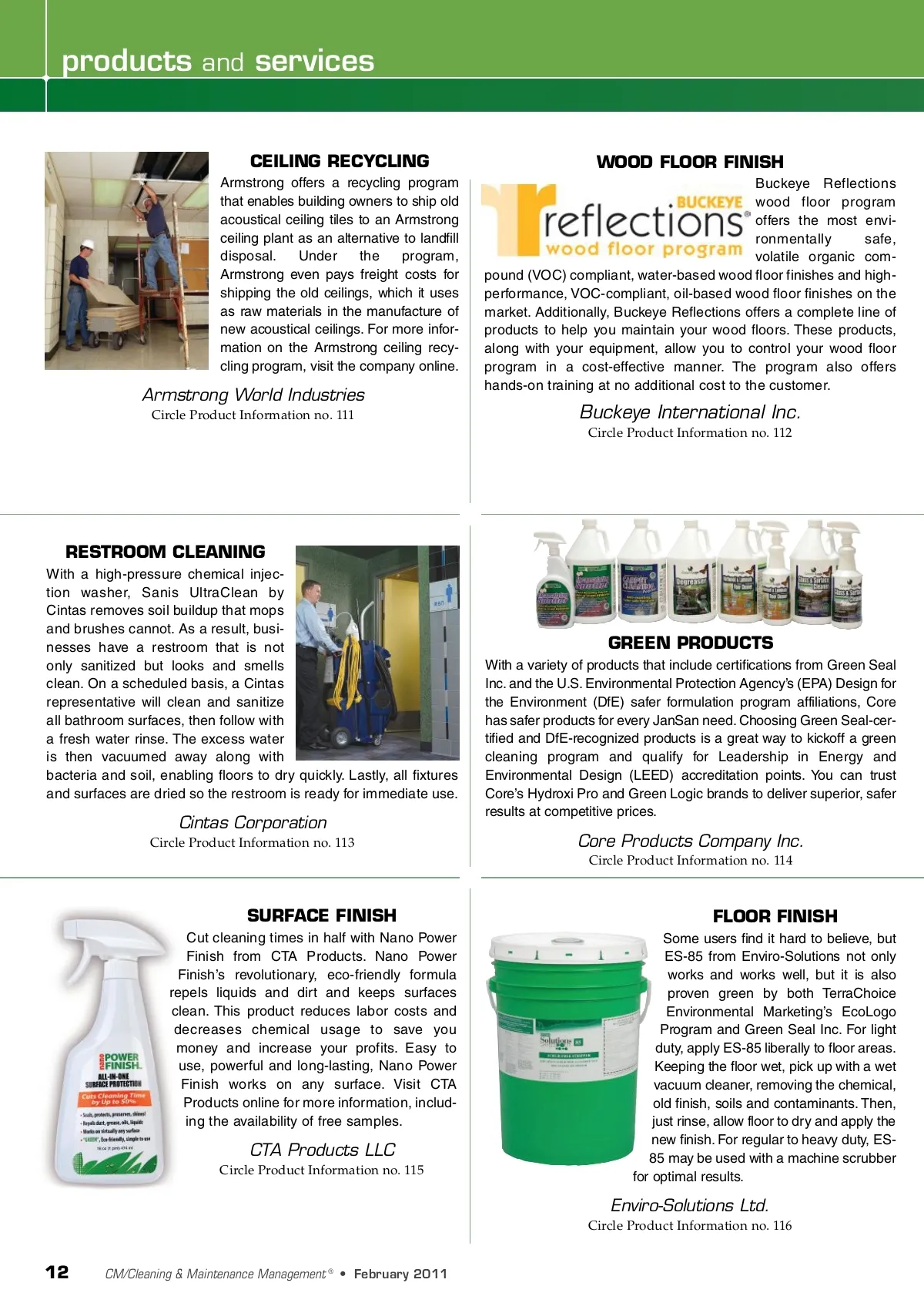 products and services CEILING RECYCLING Armstrong offers a recycling program that enables building owners to ship old acoustical ceiling tiles to an Armstrong ceiling plant as an alternative to landfill disposal. Under the program, Armstrong even pays freight costs for shipping the old ceilings, which it uses as raw materials in the manufacture of new acoustical ceilings. For more infor-mation on the Armstrong ceiling recy-cling program, visit the company online. WOOD FLOOR FINISH Buckeye Reflections wood floor program offers the most envi-ronmentally safe, volatile organic com-pound (VOC) compliant, water-based wood floor finishes and high-performance, VOC-compliant, oil-based wood floor finishes on the market. Additionally, Buckeye Reflections offers a complete line of products to help you maintain your wood floors. These products, along with your equipment, allow you to control your wood floor program in a cost-effective manner. The program also offers hands-on training at no additional cost to the customer. Armstrong World Industries Circle Product Information no. 111 Buckeye International Inc. Circle Product Information no. 112 RESTROOM CLEANING With a high-pressure chemical injec-tion washer, Sanis UltraClean by Cintas removes soil buildup that mops and brushes cannot. As a result, busi-nesses have a restroom that is not only sanitized but looks and smells clean. On a scheduled basis, a Cintas representative will clean and sanitize all bathroom surfaces, then follow with a fresh water rinse. The excess water is then vacuumed away along with bacteria and soil, enabling floors to dry quickly. Lastly, all fixtures and surfaces are dried so the restroom is ready for immediate use. GREEN PRODUCTS With a variety of products that include certifications from Green Seal Inc. and the U.S. Environmental Protection Agency’s (EPA) Design for the Environment (DfE) safer formulation program affiliations, Core has safer products for every JanSan need. Choosing Green Seal-cer-tified and DfE-recognized products is a great way to kickoff a green cleaning program and qualify for Leadership in Energy and Environmental Design (LEED) accreditation points. You can trust Core’s Hydroxi Pro and Green Logic brands to deliver superior, safer results at competitive prices. Cintas Corporation Circle Product Information no. 113 Core Products Company Inc. Circle Product Information no. 114 SURFACE FINISH Cut cleaning times in half with Nano Power Finish from CTA Products. Nano Power Finish’s revolutionary, eco-friendly formula repels liquids and dirt and keeps surfaces clean. This product reduces labor costs and decreases chemical usage to save you money and increase your profits. Easy to use, powerful and long-lasting, Nano Power Finish works on any surface. Visit CTA Products online for more information, includ-ing the availability of free samples. FLOOR FINISH Some users find it hard to believe, but ES-85 from Enviro-Solutions not only works and works well, but it is also proven green by both TerraChoice Environmental Marketing’s EcoLogo Program and Green Seal Inc. For light duty, apply ES-85 liberally to floor areas. Keeping the floor wet, pick up with a wet vacuum cleaner, removing the chemical, old finish, soils and contaminants. Then, just rinse, allow floor to dry and apply the new finish. For regular to heavy duty, ES-85 may be used with a machine scrubber for optimal results. CTA Products LLC Circle Product Information no. 115 Enviro-Solutions Ltd. Circle Product Information no. 116 12 CM/Cleaning & Maintenance Management ® • February 2011