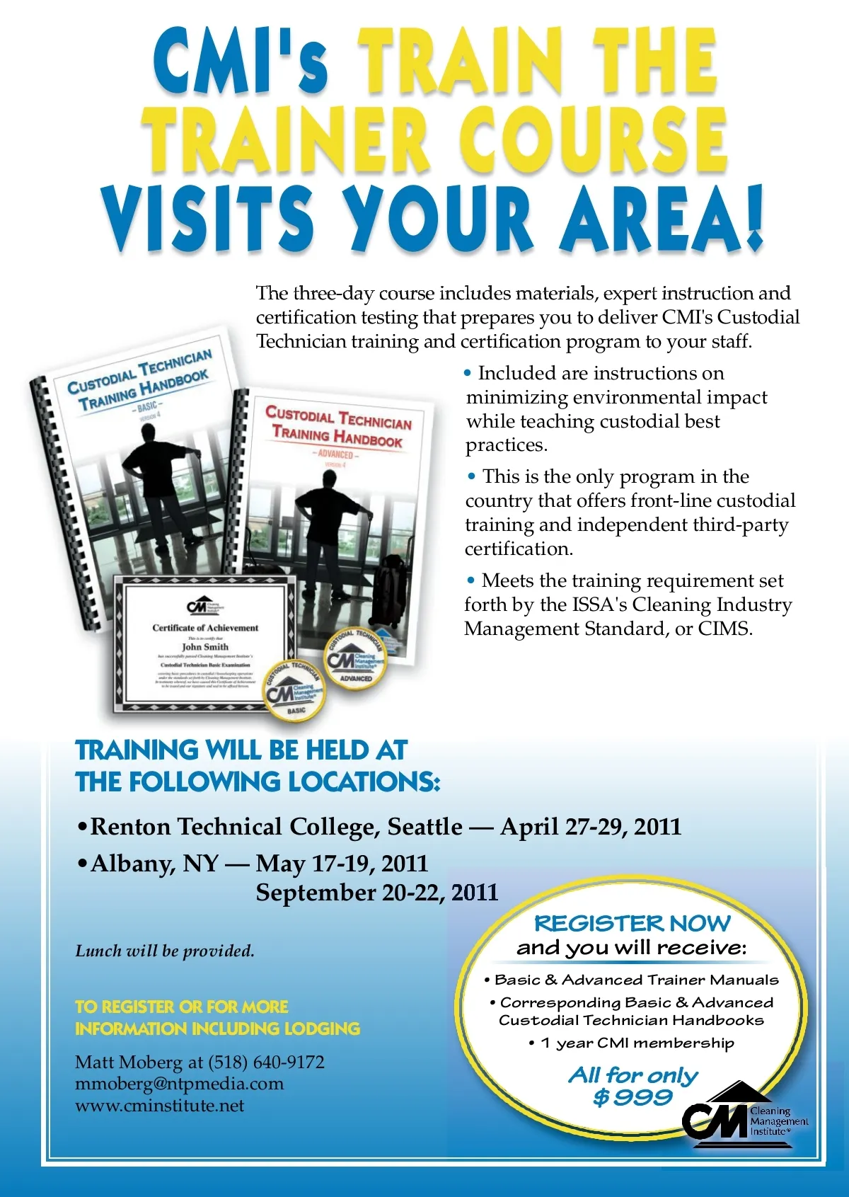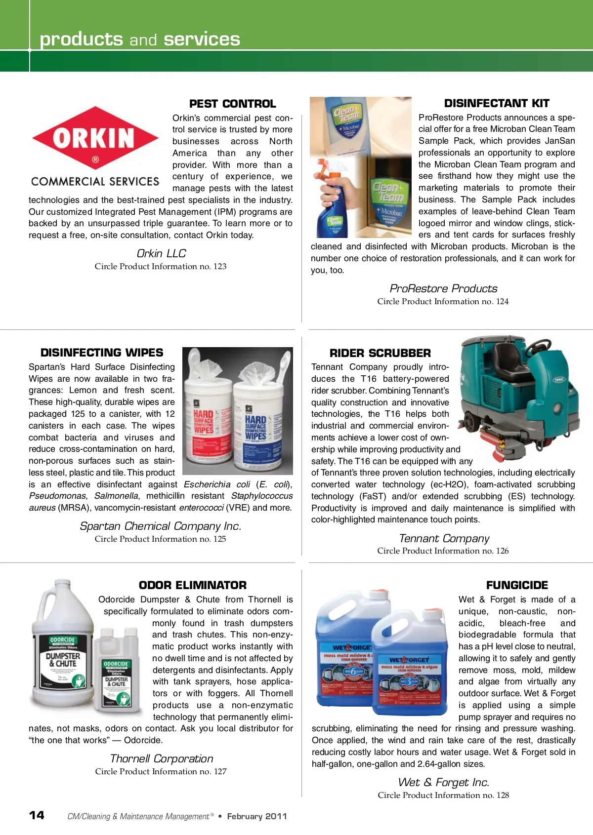 products and services PEST CONTROL Orkin’s commercial pest con-trol service is trusted by more businesses across North America than any other provider. With more than a century of experience, we manage pests with the latest technologies and the best-trained pest specialists in the industry. Our customized Integrated Pest Management (IPM) programs are backed by an unsurpassed triple guarantee. To learn more or to request a free, on-site consultation, contact Orkin today. DISINFECTANT KIT ProRestore Products announces a spe-cial offer for a free Microban Clean Team Sample Pack, which provides JanSan professionals an opportunity to explore the Microban Clean Team program and see firsthand how they might use the marketing materials to promote their business. The Sample Pack includes examples of leave-behind Clean Team logoed mirror and window clings, stick-ers and tent cards for surfaces freshly cleaned and disinfected with Microban products. Microban is the number one choice of restoration professionals, and it can work for you, too. Orkin LLC Circle Product Information no. 123 ProRestore Products Circle Product Information no. 124 DISINFECTING WIPES Spartan’s Hard Surface Disinfecting Wipes are now available in two fra-grances: Lemon and fresh scent. These high-quality, durable wipes are packaged 125 to a canister, with 12 canisters in each case. The wipes combat bacteria and viruses and reduce cross-contamination on hard, non-porous surfaces such as stain-less steel, plastic and tile. This product is an effective disinfectant against Escherichia coli ( E. coli ), Pseudomonas , Salmonella , methicillin resistant Staphylococcus aureus (MRSA), vancomycin-resistant enterococci (VRE) and more. RIDER SCRUBBER Tennant Company proudly intro-duces the T16 battery-powered rider scrubber. Combining Tennant’s quality construction and innovative technologies, the T16 helps both industrial and commercial environ-ments achieve a lower cost of own-ership while improving productivity and safety. The T16 can be equipped with any of Tennant’s three proven solution technologies, including electrically converted water technology (ec-H2O), foam-activated scrubbing technology (FaST) and/or extended scrubbing (ES) technology. Productivity is improved and daily maintenance is simplified with color-highlighted maintenance touch points. Spartan Chemical Company Inc. Circle Product Information no. 125 Tennant Company Circle Product Information no. 126 ODOR ELIMINATOR Odorcide Dumpster & Chute from Thornell is specifically formulated to eliminate odors com-monly found in trash dumpsters and trash chutes. This non-enzy-matic product works instantly with no dwell time and is not affected by detergents and disinfectants. Apply with tank sprayers, hose applica-tors or with foggers. All Thornell products use a non-enzymatic technology that permanently elimi-nates, not masks, odors on contact. Ask you local distributor for “the one that works” — Odorcide. FUNGICIDE Wet & Forget is made of a unique, non-caustic, non-acidic, bleach-free and biodegradable formula that has a pH level close to neutral, allowing it to safely and gently remove moss, mold, mildew and algae from virtually any outdoor surface. Wet & Forget is applied using a simple pump sprayer and requires no scrubbing, eliminating the need for rinsing and pressure washing. Once applied, the wind and rain take care of the rest, drastically reducing costly labor hours and water usage. Wet & Forget sold in half-gallon, one-gallon and 2.64-gallon sizes. Thornell Corporation Circle Product Information no. 127 Wet & Forget Inc. Circle Product Information no. 128 14 CM/Cleaning & Maintenance Management ® • February 2011