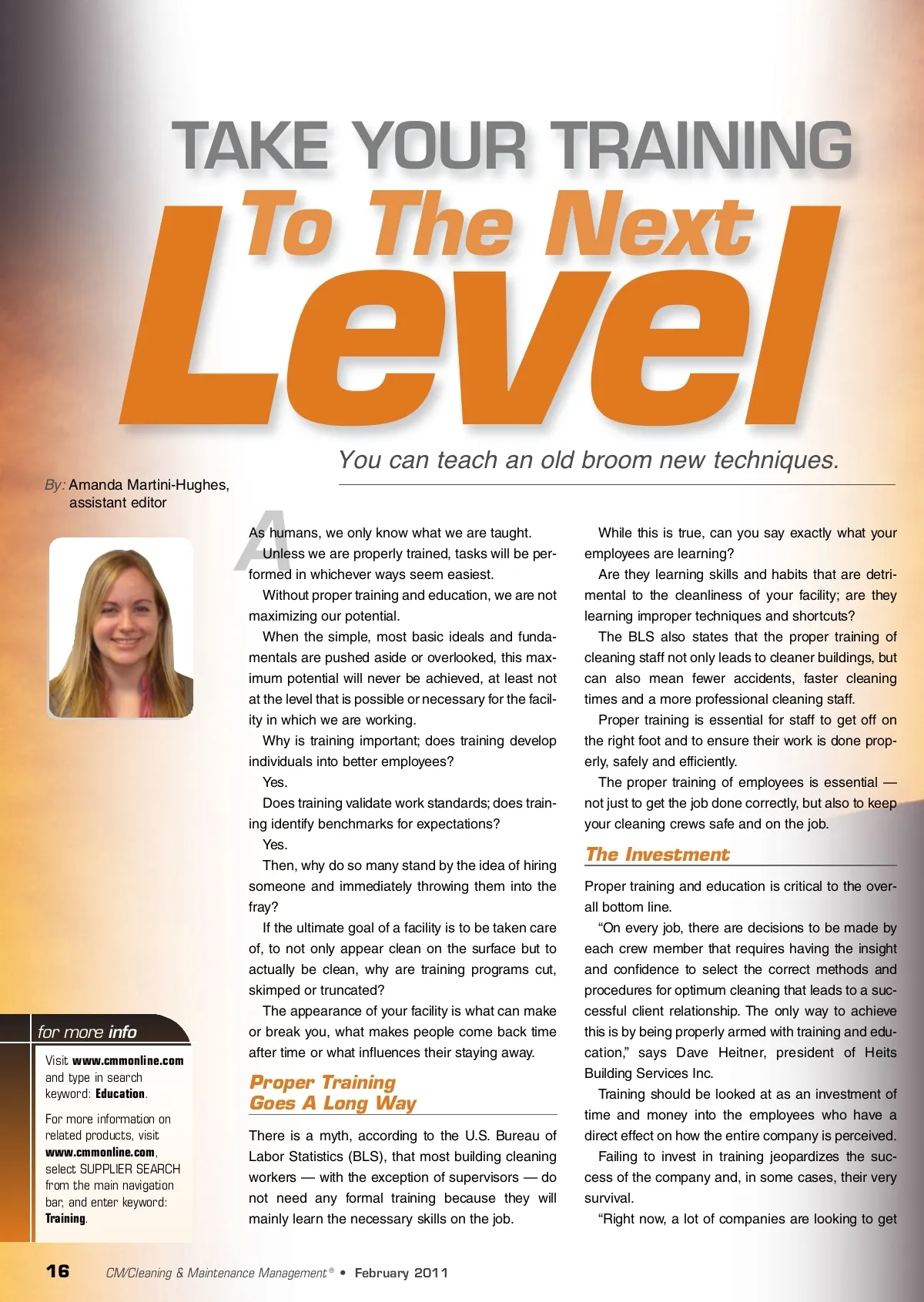 TAKE YOUR TRAINING By: Amanda Martini-Hughes, assistant editor Level A As humans, we only know what we are taught. Unless we are properly trained, tasks will be per-formed in whichever ways seem easiest. Without proper training and education, we are not maximizing our potential. When the simple, most basic ideals and funda-mentals are pushed aside or overlooked, this max-imum potential will never be achieved, at least not at the level that is possible or necessary for the facil-ity in which we are working. Why is training important; does training develop individuals into better employees? Yes. Does training validate work standards; does train-ing identify benchmarks for expectations? Yes. Then, why do so many stand by the idea of hiring someone and immediately throwing them into the fray? If the ultimate goal of a facility is to be taken care of, to not only appear clean on the surface but to actually be clean, why are training programs cut, skimped or truncated? The appearance of your facility is what can make or break you, what makes people come back time after time or what influences their staying away. To The Next You can teach an old broom new techniques. While this is true, can you say exactly what your employees are learning? Are they learning skills and habits that are detri-mental to the cleanliness of your facility; are they learning improper techniques and shortcuts? The BLS also states that the proper training of cleaning staff not only leads to cleaner buildings, but can also mean fewer accidents, faster cleaning times and a more professional cleaning staff. Proper training is essential for staff to get off on the right foot and to ensure their work is done prop-erly, safely and efficiently. The proper training of employees is essential — not just to get the job done correctly, but also to keep your cleaning crews safe and on the job. The Investment Proper training and education is critical to the over-all bottom line. “On every job, there are decisions to be made by each crew member that requires having the insight and confidence to select the correct methods and procedures for optimum cleaning that leads to a suc-cessful client relationship. The only way to achieve this is by being properly armed with training and edu-cation,” says Dave Heitner, president of Heits Building Services Inc. Training should be looked at as an investment of time and money into the employees who have a direct effect on how the entire company is perceived. Failing to invest in training jeopardizes the suc-cess of the company and, in some cases, their very survival. “Right now, a lot of companies are looking to get for more info Visit www.cmmonline.com and type in search keyword: Education . For more information on related products, visit www.cmmonline.com , select SUPPLIER SEARCH from the main navigation bar, and enter keyword: Training . Proper Training Goes A Long Way There is a myth, according to the U.S. Bureau of Labor Statistics (BLS), that most building cleaning workers — with the exception of supervisors — do not need any formal training because they will mainly learn the necessary skills on the job. 16 CM/Cleaning & Maintenance Management ® • February 2011