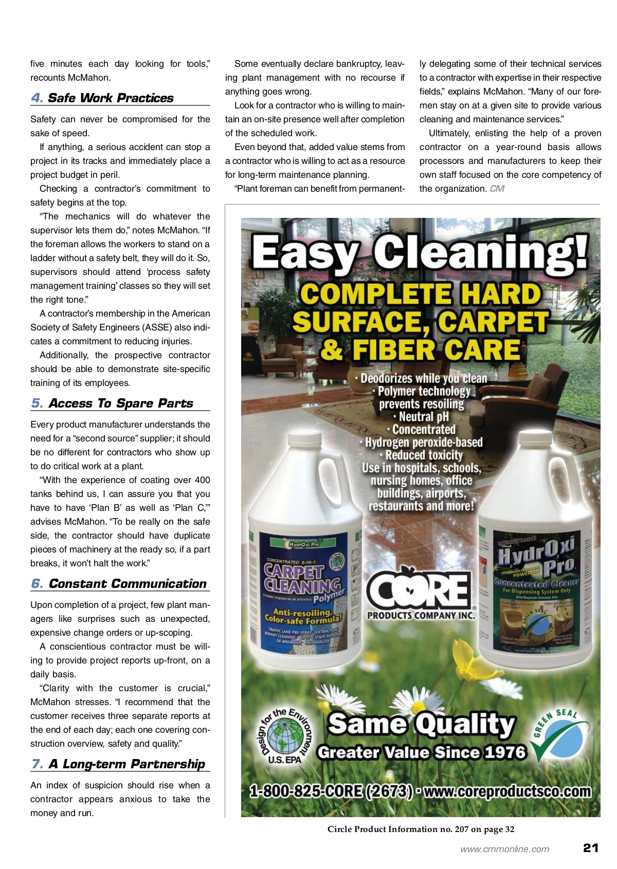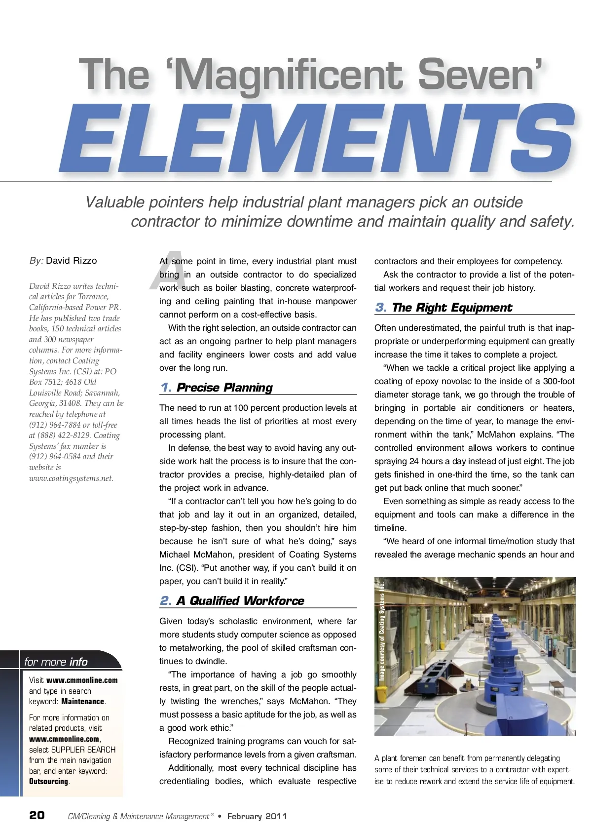 The ‘Magnificent Seven’ ELEMENTS Valuable pointers help industrial plant managers pick an outside contractor to minimize downtime and maintain quality and safety. By: David Rizzo David Rizzo writes techni-cal articles for Torrance, California-based Power PR. He has published two trade books, 150 technical articles and 300 newspaper columns. For more informa-tion, contact Coating Systems Inc. (CSI) at: PO Box 7512; 4618 Old Louisville Road; Savannah, Georgia, 31408. They can be reached by telephone at (912) 964-7884 or toll-free at (888) 422-8129. Coating Systems’ fax number is (912) 964-0584 and their website is www.coatingsystems.net. A At some point in time, every industrial plant must bring in an outside contractor to do specialized work such as boiler blasting, concrete waterproof-ing and ceiling painting that in-house manpower cannot perform on a cost-effective basis. With the right selection, an outside contractor can act as an ongoing partner to help plant managers and facility engineers lower costs and add value over the long run. contractors and their employees for competency. Ask the contractor to provide a list of the poten-tial workers and request their job history. 3. The Right Equipment Often underestimated, the painful truth is that inap-propriate or underperforming equipment can greatly increase the time it takes to complete a project. “When we tackle a critical project like applying a coating of epoxy novolac to the inside of a 300-foot diameter storage tank, we go through the trouble of bringing in portable air conditioners or heaters, depending on the time of year, to manage the envi-ronment within the tank,” McMahon explains. “The controlled environment allows workers to continue spraying 24 hours a day instead of just eight. The job gets finished in one-third the time, so the tank can get put back online that much sooner.” Even something as simple as ready access to the equipment and tools can make a difference in the timeline. “We heard of one informal time/motion study that revealed the average mechanic spends an hour and 1. Precise Planning The need to run at 100 percent production levels at all times heads the list of priorities at most every processing plant. In defense, the best way to avoid having any out-side work halt the process is to insure that the con-tractor provides a precise, highly-detailed plan of the project work in advance. “If a contractor can’t tell you how he’s going to do that job and lay it out in an organized, detailed, step-by-step fashion, then you shouldn’t hire him because he isn’t sure of what he’s doing,” says Michael McMahon, president of Coating Systems Inc. (CSI). “Put another way, if you can’t build it on paper, you can’t build it in reality.” 2. A Qualified Workforce Given today’s scholastic environment, where far more students study computer science as opposed to metalworking, the pool of skilled craftsman con-tinues to dwindle. “The importance of having a job go smoothly rests, in great part, on the skill of the people actual-ly twisting the wrenches,” says McMahon. “They must possess a basic aptitude for the job, as well as a good work ethic.” Recognized training programs can vouch for sat-isfactory performance levels from a given craftsman. Additionally, most every technical discipline has credentialing bodies, which evaluate respective for more info Visit www.cmmonline.com and type in search keyword: Maintenance . For more information on related products, visit www.cmmonline.com , select SUPPLIER SEARCH from the main navigation bar, and enter keyword: Outsourcing . A plant foreman can benefit from permanently delegating some of their technical services to a contractor with expert-ise to reduce rework and extend the service life of equipment. 20 CM/Cleaning & Maintenance Management ® • February 2011 Image courtesy of Coating Systems Inc.