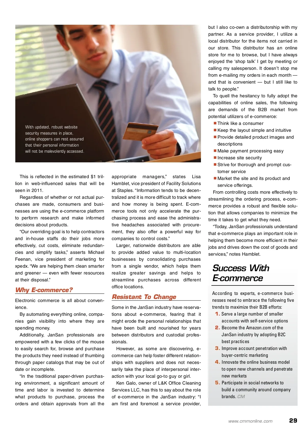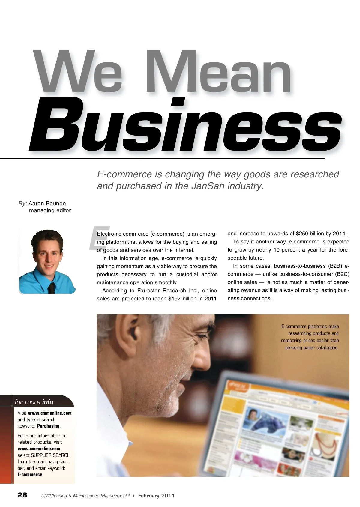 Business E-commerce is changing the way goods are researched and purchased in the JanSan industry. By: Aaron Baunee, managing editor We Mean E Electronic commerce (e-commerce) is an emerg-ing platform that allows for the buying and selling of goods and services over the Internet. In this information age, e-commerce is quickly gaining momentum as a viable way to procure the products necessary to run a custodial and/or maintenance operation smoothly. According to Forrester Research Inc., online sales are projected to reach $192 billion in 2011 and increase to upwards of $250 billion by 2014. To say it another way, e-commerce is expected to grow by nearly 10 percent a year for the fore-seeable future. In some cases, business-to-business (B2B) e-commerce — unlike business-to-consumer (B2C) online sales — is not as much a matter of gener-ating revenue as it is a way of making lasting busi-ness connections. E-commerce platforms make researching products and comparing prices easier than perusing paper catalogues. for more info Visit www.cmmonline.com and type in search keyword: Purchasing . For more information on related products, visit www.cmmonline.com , select SUPPLIER SEARCH from the main navigation bar, and enter keyword: E-commerce . 28 CM/Cleaning & Maintenance Management ® • February 2011