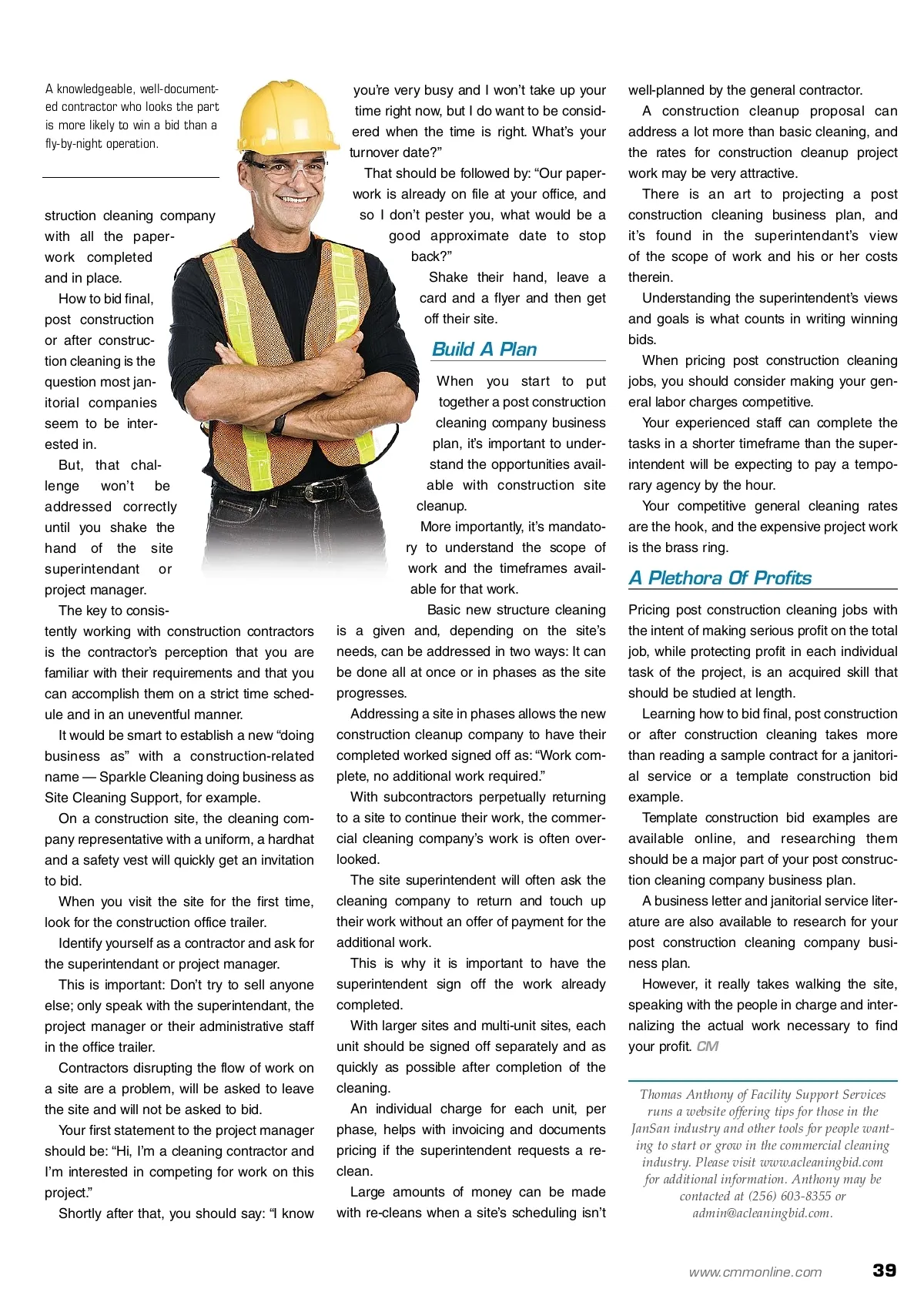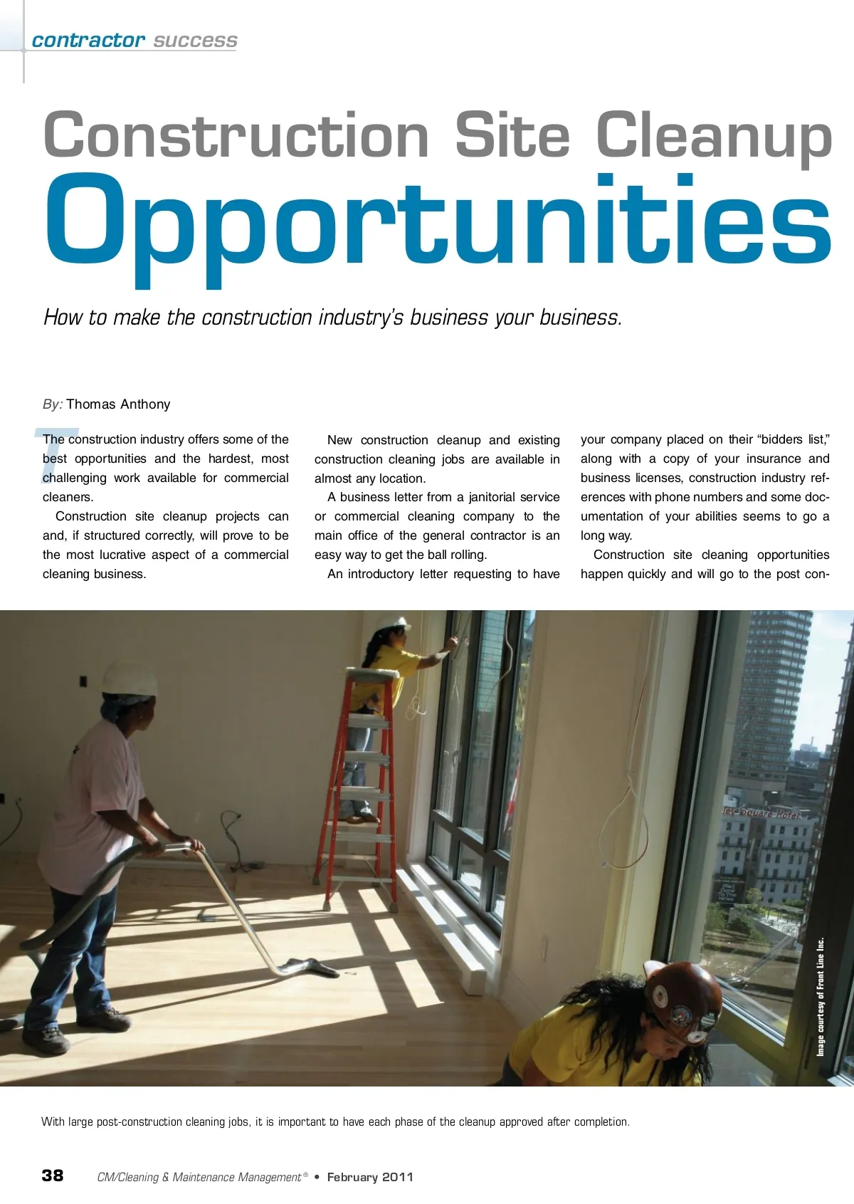 contractor success Construction Site Cleanup Opportunities How to make the construction industry’s business your business. By: Thomas Anthony T The construction industry offers some of the best opportunities and the hardest, most challenging work available for commercial cleaners. Construction site cleanup projects can and, if structured correctly, will prove to be the most lucrative aspect of a commercial cleaning business. New construction cleanup and existing construction cleaning jobs are available in almost any location. A business letter from a janitorial service or commercial cleaning company to the main office of the general contractor is an easy way to get the ball rolling. An introductory letter requesting to have your company placed on their “bidders list,” along with a copy of your insurance and business licenses, construction industry ref-erences with phone numbers and some doc-umentation of your abilities seems to go a long way. Construction site cleaning opportunities happen quickly and will go to the post con-With large post-construction cleaning jobs, it is important to have each phase of the cleanup approved after completion. 38 CM/Cleaning & Maintenance Management ® • February 2011 Image courtesy of Front Line Inc.