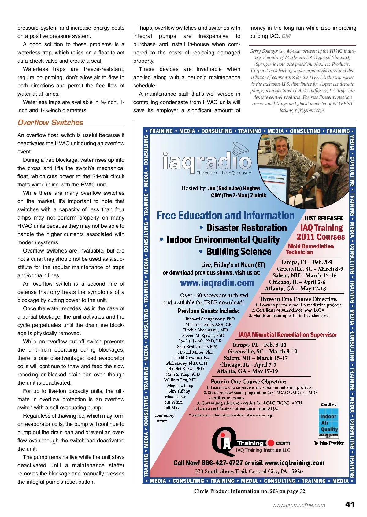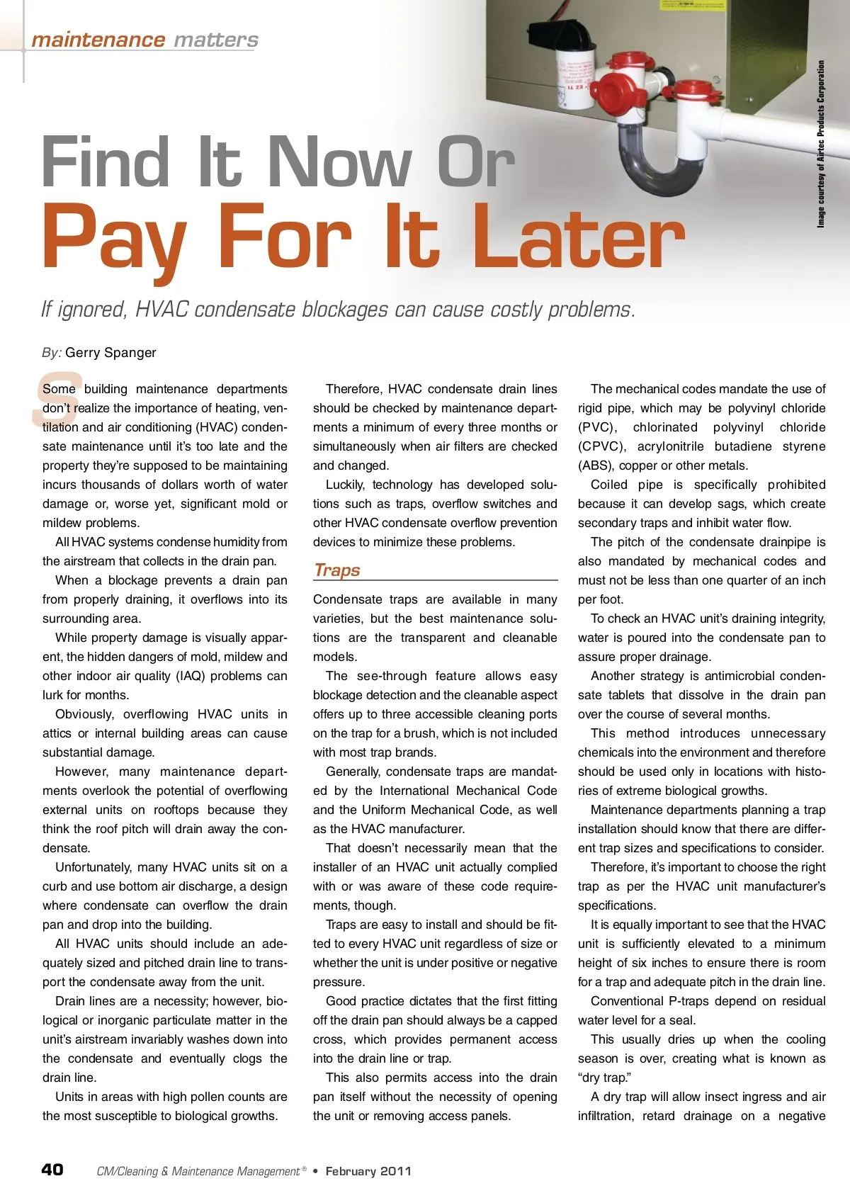 maintenance matters Image courtesy of Airtec Products Corporation Find It Now Or By: Gerry Spanger Pay For It Later If ignored, HVAC condensate blockages can cause costly problems. S Some building maintenance departments don’t realize the importance of heating, ven-tilation and air conditioning (HVAC) conden-sate maintenance until it’s too late and the property they’re supposed to be maintaining incurs thousands of dollars worth of water damage or, worse yet, significant mold or mildew problems. All HVAC systems condense humidity from the airstream that collects in the drain pan. When a blockage prevents a drain pan from properly draining, it overflows into its surrounding area. While property damage is visually appar-ent, the hidden dangers of mold, mildew and other indoor air quality (IAQ) problems can lurk for months. Obviously, overflowing HVAC units in attics or internal building areas can cause substantial damage. However, many maintenance depart-ments overlook the potential of overflowing external units on rooftops because they think the roof pitch will drain away the con-densate. Unfortunately, many HVAC units sit on a curb and use bottom air discharge, a design where condensate can overflow the drain pan and drop into the building. All HVAC units should include an ade-quately sized and pitched drain line to trans-port the condensate away from the unit. Drain lines are a necessity; however, bio-logical or inorganic particulate matter in the unit’s airstream invariably washes down into the condensate and eventually clogs the drain line. Units in areas with high pollen counts are the most susceptible to biological growths. Therefore, HVAC condensate drain lines should be checked by maintenance depart-ments a minimum of every three months or simultaneously when air filters are checked and changed. Luckily, technology has developed solu-tions such as traps, overflow switches and other HVAC condensate overflow prevention devices to minimize these problems. Traps Condensate traps are available in many varieties, but the best maintenance solu-tions are the transparent and cleanable models. The see-through feature allows easy blockage detection and the cleanable aspect offers up to three accessible cleaning ports on the trap for a brush, which is not included with most trap brands. Generally, condensate traps are mandat-ed by the International Mechanical Code and the Uniform Mechanical Code, as well as the HVAC manufacturer. That doesn’t necessarily mean that the installer of an HVAC unit actually complied with or was aware of these code require-ments, though. Traps are easy to install and should be fit-ted to every HVAC unit regardless of size or whether the unit is under positive or negative pressure. Good practice dictates that the first fitting off the drain pan should always be a capped cross, which provides permanent access into the drain line or trap. This also permits access into the drain pan itself without the necessity of opening the unit or removing access panels. The mechanical codes mandate the use of rigid pipe, which may be polyvinyl chloride (PVC), chlorinated polyvinyl chloride (CPVC), acrylonitrile butadiene styrene (ABS), copper or other metals. Coiled pipe is specifically prohibited because it can develop sags, which create secondary traps and inhibit water flow. The pitch of the condensate drainpipe is also mandated by mechanical codes and must not be less than one quarter of an inch per foot. To check an HVAC unit’s draining integrity, water is poured into the condensate pan to assure proper drainage. Another strategy is antimicrobial conden-sate tablets that dissolve in the drain pan over the course of several months. This method introduces unnecessary chemicals into the environment and therefore should be used only in locations with histo-ries of extreme biological growths. Maintenance departments planning a trap installation should know that there are differ-ent trap sizes and specifications to consider. Therefore, it’s important to choose the right trap as per the HVAC unit manufacturer’s specifications. It is equally important to see that the HVAC unit is sufficiently elevated to a minimum height of six inches to ensure there is room for a trap and adequate pitch in the drain line. Conventional P-traps depend on residual water level for a seal. This usually dries up when the cooling season is over, creating what is known as “dry trap.” A dry trap will allow insect ingress and air infiltration, retard drainage on a negative 40 CM/Cleaning & Maintenance Management ® • February 2011