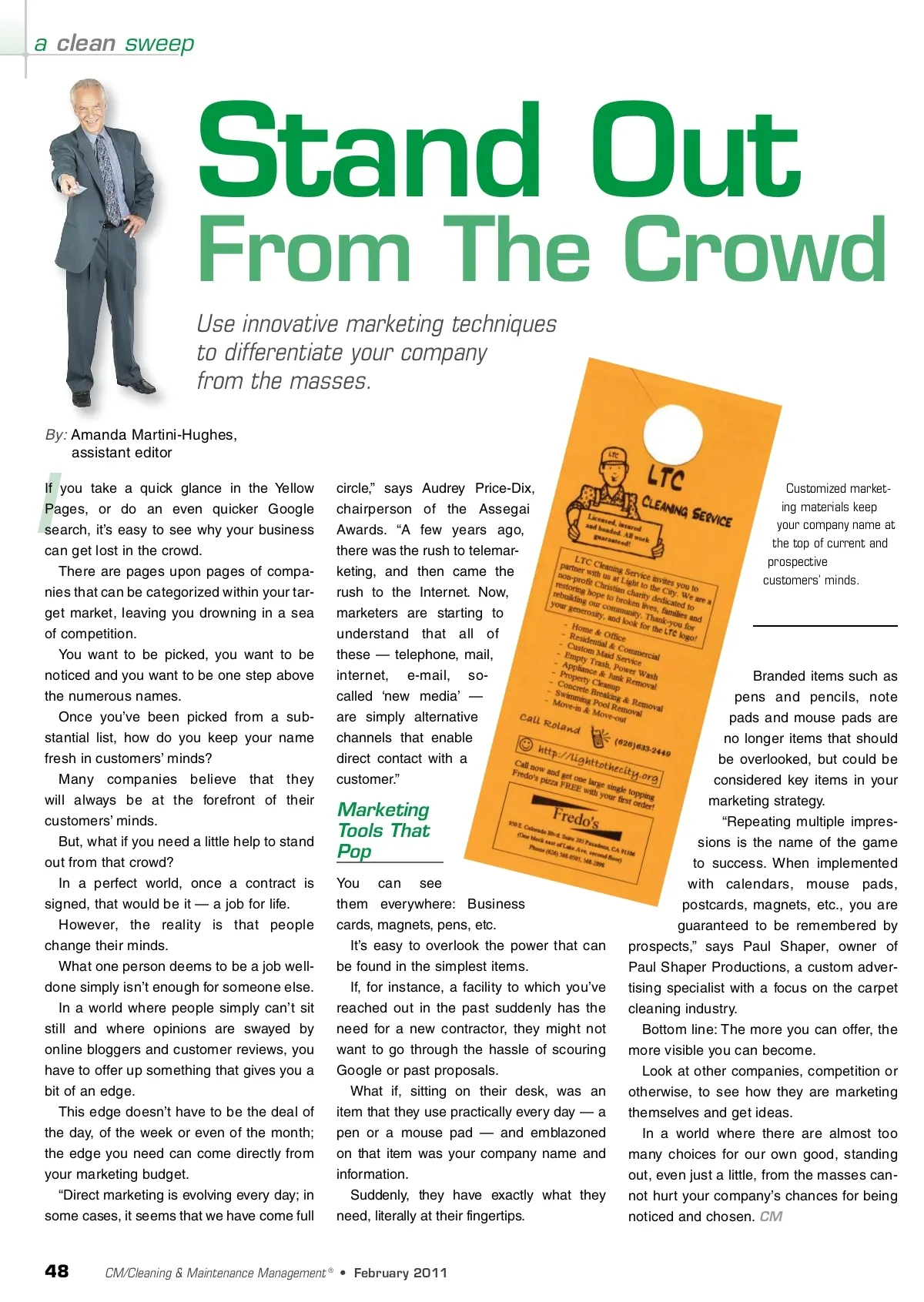 a clean sweep Stand Out Use innovative marketing techniques to differentiate your company from the masses. By: Amanda Martini-Hughes, assistant editor From The Crowd I If you take a quick glance in the Yellow Pages, or do an even quicker Google search, it’s easy to see why your business can get lost in the crowd. There are pages upon pages of compa-nies that can be categorized within your tar-get market, leaving you drowning in a sea of competition. You want to be picked, you want to be noticed and you want to be one step above the numerous names. Once you’ve been picked from a sub-stantial list, how do you keep your name fresh in customers’ minds? Many companies believe that they will always be at the forefront of their customers’ minds. But, what if you need a little help to stand out from that crowd? In a perfect world, once a contract is signed, that would be it — a job for life. However, the reality is that people change their minds. What one person deems to be a job well-done simply isn’t enough for someone else. In a world where people simply can’t sit still and where opinions are swayed by online bloggers and customer reviews, you have to offer up something that gives you a bit of an edge. This edge doesn’t have to be the deal of the day, of the week or even of the month; the edge you need can come directly from your marketing budget. “Direct marketing is evolving every day; in some cases, it seems that we have come full circle,” says Audrey Price-Dix, chairperson of the Assegai Awards. “A few years ago, there was the rush to telemar-keting, and then came the rush to the Internet. Now, marketers are starting to understand that all of these — telephone, mail, internet, e-mail, so-called ‘new media’ — are simply alternative channels that enable direct contact with a customer.” Customized market-ing materials keep your company name at the top of current and prospective customers’ minds. Marketing Tools That Pop You can see them everywhere: Business cards, magnets, pens, etc. It’s easy to overlook the power that can be found in the simplest items. If, for instance, a facility to which you’ve reached out in the past suddenly has the need for a new contractor, they might not want to go through the hassle of scouring Google or past proposals. What if, sitting on their desk, was an item that they use practically every day — a pen or a mouse pad — and emblazoned on that item was your company name and information. Suddenly, they have exactly what they need, literally at their fingertips. Branded items such as pens and pencils, note pads and mouse pads are no longer items that should be overlooked, but could be considered key items in your marketing strategy. “Repeating multiple impres-sions is the name of the game to success. When implemented with calendars, mouse pads, postcards, magnets, etc., you are guaranteed to be remembered by prospects,” says Paul Shaper, owner of Paul Shaper Productions, a custom adver-tising specialist with a focus on the carpet cleaning industry. Bottom line: The more you can offer, the more visible you can become. Look at other companies, competition or otherwise, to see how they are marketing themselves and get ideas. In a world where there are almost too many choices for our own good, standing out, even just a little, from the masses can-not hurt your company’s chances for being noticed and chosen. CM 48 CM/Cleaning & Maintenance Management ® • February 2011