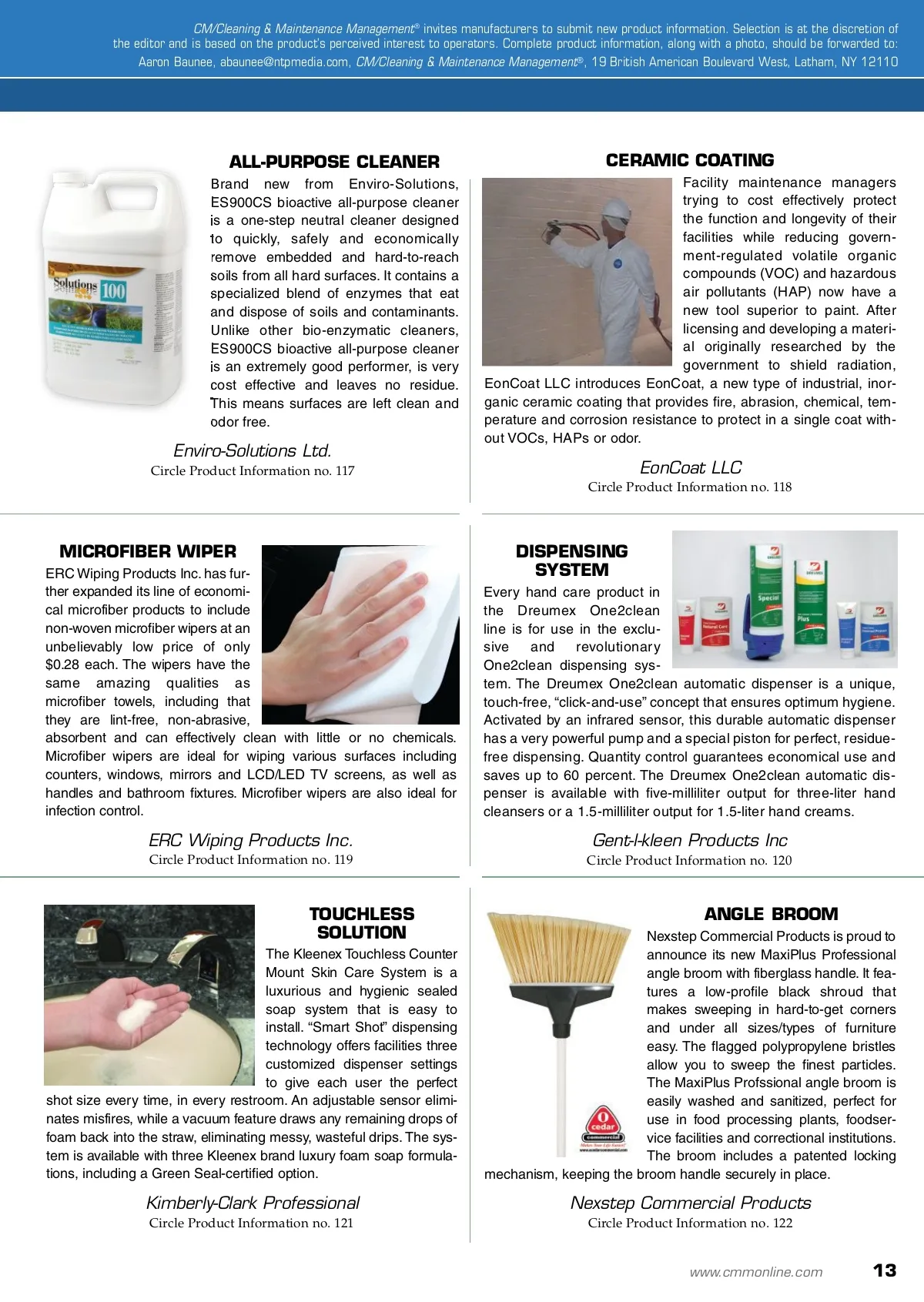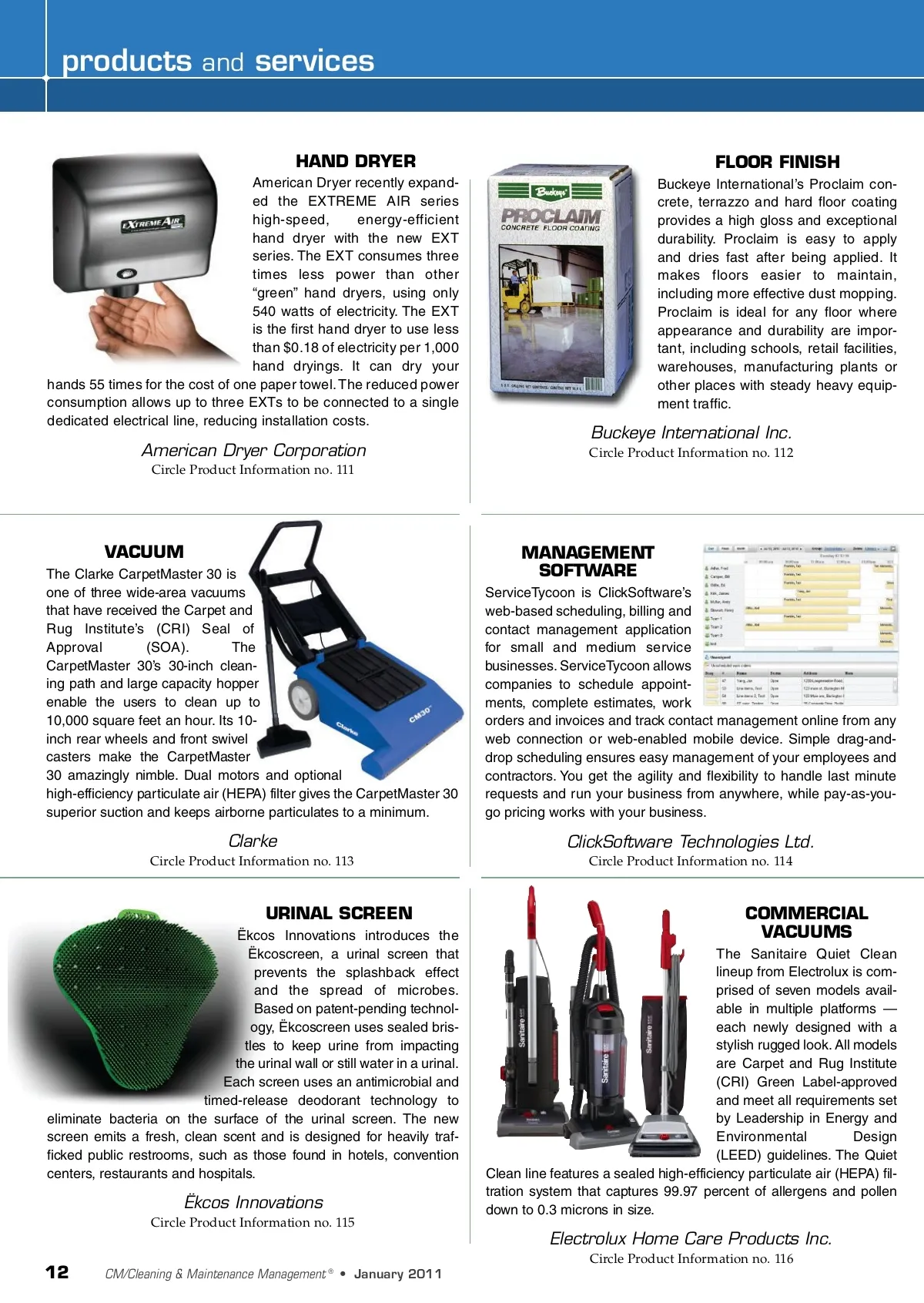 products and services HAND DRYER American Dryer recently expand-ed the EXTREME AIR series high-speed, energy-efficient hand dryer with the new EXT series. The EXT consumes three times less power than other “green” hand dryers, using only 540 watts of electricity. The EXT is the first hand dryer to use less than $0.18 of electricity per 1,000 hand dryings. It can dry your hands 55 times for the cost of one paper towel. The reduced power consumption allows up to three EXTs to be connected to a single dedicated electrical line, reducing installation costs. FLOOR FINISH Buckeye International’s Proclaim con-crete, terrazzo and hard floor coating provides a high gloss and exceptional durability. Proclaim is easy to apply and dries fast after being applied. It makes floors easier to maintain, including more effective dust mopping. Proclaim is ideal for any floor where appearance and durability are impor-tant, including schools, retail facilities, warehouses, manufacturing plants or other places with steady heavy equip-ment traffic. American Dryer Corporation Circle Product Information no. 111 Buckeye International Inc. Circle Product Information no. 112 VACUUM The Clarke CarpetMaster 30 is one of three wide-area vacuums that have received the Carpet and Rug Institute’s (CRI) Seal of Approval (SOA). The CarpetMaster 30’s 30-inch clean-ing path and large capacity hopper enable the users to clean up to 10,000 square feet an hour. Its 10-inch rear wheels and front swivel casters make the CarpetMaster 30 amazingly nimble. Dual motors and optional high-efficiency particulate air (HEPA) filter gives the CarpetMaster 30 superior suction and keeps airborne particulates to a minimum. MANAGEMENT SOFTWARE ServiceTycoon is ClickSoftware’s web-based scheduling, billing and contact management application for small and medium service businesses. ServiceTycoon allows companies to schedule appoint-ments, complete estimates, work orders and invoices and track contact management online from any web connection or web-enabled mobile device. Simple drag-and-drop scheduling ensures easy management of your employees and contractors. You get the agility and flexibility to handle last minute requests and run your business from anywhere, while pay-as-you-go pricing works with your business. Clarke Circle Product Information no. 113 ClickSoftware Technologies Ltd. Circle Product Information no. 114 URINAL SCREEN Ëkcos Innovations introduces the Ëkcoscreen, a urinal screen that prevents the splashback effect and the spread of microbes. Based on patent-pending technol-ogy, Ëkcoscreen uses sealed bris-tles to keep urine from impacting the urinal wall or still water in a urinal. Each screen uses an antimicrobial and timed-release deodorant technology to eliminate bacteria on the surface of the urinal screen. The new screen emits a fresh, clean scent and is designed for heavily traf-ficked public restrooms, such as those found in hotels, convention centers, restaurants and hospitals. COMMERCIAL VACUUMS The Sanitaire Quiet Clean lineup from Electrolux is com-prised of seven models avail-able in multiple platforms — each newly designed with a stylish rugged look. All models are Carpet and Rug Institute (CRI) Green Label-approved and meet all requirements set by Leadership in Energy and Environmental Design (LEED) guidelines. The Quiet Clean line features a sealed high-efficiency particulate air (HEPA) fil-tration system that captures 99.97 percent of allergens and pollen down to 0.3 microns in size. Ëkcos Innovations Circle Product Information no. 115 Electrolux Home Care Products Inc. Circle Product Information no. 116 12 CM/Cleaning & Maintenance Management ® • January 2011