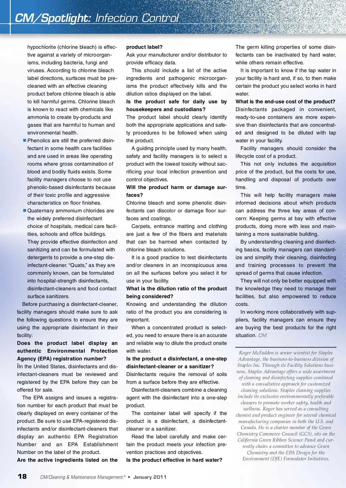 CM/Spotlight: Infection Control hypochlorite (chlorine bleach) is effec-tive against a variety of microorgan-isms, including bacteria, fungi and viruses. According to chlorine bleach label directions, surfaces must be pre-cleaned with an effective cleaning product before chlorine bleach is able to kill harmful germs. Chlorine bleach is known to react with chemicals like ammonia to create by-products and gases that are harmful to human and environmental health. Phenolics are still the preferred disin-fectant in some health care facilities and are used in areas like operating rooms where gross contamination of blood and bodily fluids exists. Some facility managers choose to not use phenolic-based disinfectants because of their toxic profile and aggressive characteristics on floor finishes. Quaternary ammonium chlorides are the widely preferred disinfectant choice of hospitals, medical care facil-ities, schools and office buildings. They provide effective disinfection and sanitizing and can be formulated with detergents to provide a one-step dis-infectant-cleaner. “Quats,” as they are commonly known, can be formulated into hospital-strength disinfectants, disinfectant-cleaners and food contact surface sanitizers. Before purchasing a disinfectant-cleaner, facility managers should make sure to ask the following questions to ensure they are using the appropriate disinfectant in their facility: Does the product label display an authentic Environmental Protection Agency (EPA) registration number? ÏIn the United States, disinfectants and dis-infectant-cleaners must be reviewed and registered by the EPA before they can be offered for sale. The EPA assigns and issues a registra-tion number for each product that must be clearly displayed on every container of the product. Be sure to use EPA-registered dis-infectants and/or disinfectant-cleaners that display an authentic EPA Registration Number and an EPA Establishment Number on the label of the product. Are the active ingredients listed on the product label? Ask your manufacturer and/or distributor to provide efficacy data. This should include a list of the active ingredients and pathogenic microorgan-isms the product effectively kills and the dilution ratios displayed on the label. Is the product safe for daily use by housekeepers and custodians? The product label should clearly identify both the appropriate applications and safe-ty procedures to be followed when using the product. A guiding principle used by many health, safety and facility managers is to select a product with the lowest toxicity without sac-rificing your local infection prevention and control objectives. Will the product harm or damage sur-faces? Chlorine bleach and some phenolic disin-fectants can discolor or damage floor sur-faces and coatings. Carpets, entrance matting and clothing are just a few of the fibers and materials that can be harmed when contacted by chlorine bleach solutions. It is a good practice to test disinfectants and/or cleaners in an inconspicuous area on all the surfaces before you select it for use in your facility. What is the dilution ratio of the product being considered? Knowing and understanding the dilution ratio of the product you are considering is important. When a concentrated product is select-ed, you need to ensure there is an accurate and reliable way to dilute the product onsite with water. Is the product a disinfectant, a one-step disinfectant-cleaner or a sanitizer? Disinfectants require the removal of soils from a surface before they are effective. Disinfectant-cleaners combine a cleaning agent with the disinfectant into a one-step product. The container label will specify if the product is a disinfectant, a disinfectant-cleaner or a sanitizer. Read the label carefully and make cer-tain the product meets your infection pre-vention practices and objectives. Is the product effective in hard water? The germ killing properties of some disin-fectants can be inactivated by hard water, while others remain effective. It is important to know if the tap water in your facility is hard and, if so, to then make certain the product you select works in hard water. What is the end-use cost of the product? Disinfectants packaged in convenient, ready-to-use containers are more expen-sive than disinfectants that are concentrat-ed and designed to be diluted with tap water in your facility. Facility managers should consider the lifecycle cost of a product. This not only includes the acquisition price of the product, but the costs for use, handling and disposal of products over time. This will help facility managers make informed decisions about which products can address the three key areas of con-cern: Keeping germs at bay with effective products, doing more with less and main-taining a more sustainable building. By understanding cleaning and disinfect-ing basics, facility managers can standard-ize and simplify their cleaning, disinfecting and training processes to prevent the spread of germs that cause infection. They will not only be better equipped with the knowledge they need to manage their facilities, but also empowered to reduce costs. In working more collaboratively with sup-pliers, facility managers can ensure they are buying the best products for the right situation. CM Roger McFadden is senior scientist for Staples Advantage, the business-to-business division of Staples Inc. Through its Facility Solutions busi-ness, Staples Advantage offers a wide assortment of cleaning and disinfecting supplies combined with a consultative approach for customized cleaning solutions. Staples cleaning supplies include its exclusive environmentally preferable cleaners to promote worker safety, health and wellness. Roger has served as a consulting chemist and product engineer for several chemical manufacturing companies in both the U.S. and Canada. He is a charter member of the Green Chemistry Commerce Council (GC3), sits on the California Green Ribbon Science Pan
