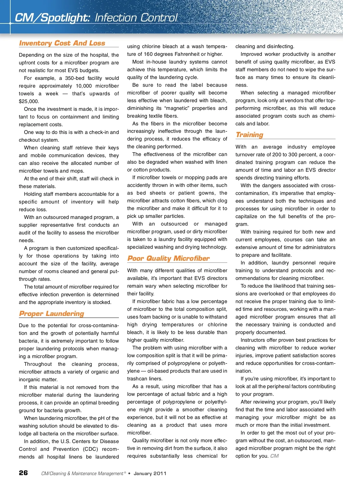 CM/Spotlight: Infection Control Inventory Cost And Loss Depending on the size of the hospital, the upfront costs for a microfiber program are not realistic for most EVS budgets. For example, a 350-bed facility would require approximately 10,000 microfiber towels a week — that’s upwards of $25,000. Once the investment is made, it is impor-tant to focus on containment and limiting replacement costs. One way to do this is with a check-in and checkout system. When cleaning staff retrieve their keys and mobile communication devices, they can also receive the allocated number of microfiber towels and mops. At the end of their shift, staff will check in these materials. Holding staff members accountable for a specific amount of inventory will help reduce loss. With an outsourced managed program, a supplier representative first conducts an audit of the facility to assess the microfiber needs. A program is then customized specifical-ly for those operations by taking into account the size of the facility, average number of rooms cleaned and general put-through rates. The total amount of microfiber required for effective infection prevention is determined and the appropriate inventory is stocked. using chlorine bleach at a wash tempera-ture of 160 degrees Fahrenheit or higher. Most in-house laundry systems cannot achieve this temperature, which limits the quality of the laundering cycle. Be sure to read the label because microfiber of poorer quality will become less effective when laundered with bleach, diminishing its “magnetic” properties and breaking textile fibers. As the fibers in the microfiber become increasingly ineffective through the laun-dering process, it reduces the efficacy of the cleaning performed. The effectiveness of the microfiber can also be degraded when washed with linen or cotton products. If microfiber towels or mopping pads are accidently thrown in with other items, such as bed sheets or patient gowns, the microfiber attracts cotton fibers, which clog the microfiber and make it difficult for it to pick up smaller particles. With an outsourced or managed microfiber program, used or dirty microfiber is taken to a laundry facility equipped with specialized washing and drying technology. cleaning and disinfecting. Improved worker productivity is another benefit of using quality microfiber, as EVS staff members do not need to wipe the sur-face as many times to ensure its cleanli-ness. When selecting a managed microfiber program, look only at vendors that offer top-performing microfiber, as this will reduce associated program costs such as chemi-cals and labor. Training With an average industry employee turnover rate of 200 to 300 percent, a coor-dinated training program can reduce the amount of time and labor an EVS director spends directing training efforts. With the dangers associated with cross-contamination, it’s imperative that employ-ees understand both the techniques and processes for using microfiber in order to capitalize on the full benefits of the pro-gram. With training required for both new and current employees, courses can take an extensive amount of time for administrators to prepare and facilitate. In addition, laundry personnel require training to understand protocols and rec-ommendations for cleaning microfiber. To reduce the likelihood that training ses-sions are overlooked or that employees do not receive the proper training due to limit-ed time and resources, working with a man-aged microfiber program ensures that all the necessary training is conducted and properly documented. Instructors offer proven best practices for cleaning with microfiber to reduce worker injuries, improve patient satisfaction scores and reduce opportunities for cross-contam-ination. If you’re using microfiber, it’s important to look at all the peripheral factors contributing to your program. After reviewing your program, you’ll likely find that the time and labor associated with managing your microfiber might be as much or more than the initial investment. In order to get the most out of your pro-gram without the cost, an outsourced, man-aged microfiber program might be the right option for you. CM Poor Quality Microfiber With many different qualities of microfiber available, it’s important that EVS directors remain wary when selecting microfiber for their facility. If microfiber fabric has a low percentage of microfiber to the total composition split, uses foam backing or is unable to withstand high drying temperatures or chlorine bleach, it is likely to be less durable than higher quality microfiber. The problem with using microfiber with a low composition split is that it will be prima-rily comprised of polypropylene or polyeth-ylene — oil-based products that are used in trashcan liners. As a result, using microfiber that has a low percentage of actual fabric and a high percentage of polypropylene or polyethyl-ene might provide a smoother cleaning experience, but it will not be as effective at cleaning as a product that uses more microfiber. Quality microfiber is not only more effec-tive in removing dirt from the surface, it also requires substantially less chemical for Proper Laundering Due to the potential for cross-contamina-tion and the growth of potentially harmful bacteria, it is extremely important to follow proper laundering protocols when manag-ing a microfiber program. Throughout the cleaning process, microfiber attracts a variety of organic and inorganic matter. If this material is not removed from the microfiber material during the laundering process, it can provide an optimal breeding ground for bacteria growth. When laundering microfiber, the pH of the washing solution should be elevated to dis-lodge all bacteria on the microfiber surface. In addition, the U.S. Centers for Disease Control and Prevention (CDC) recom-mends all hospital linens be laundered 26 CM/Cleaning & Maintenance Management ® • January 2011