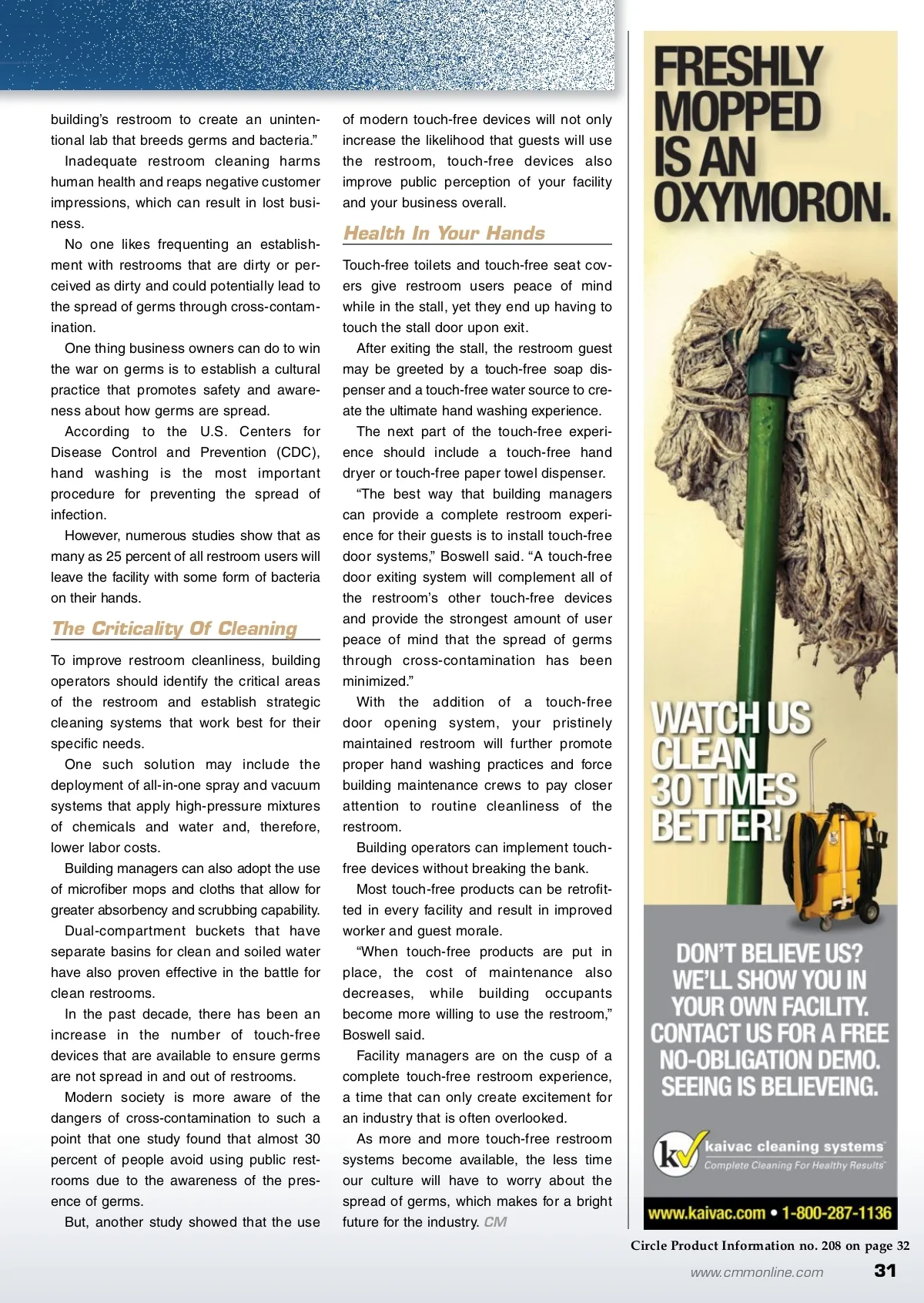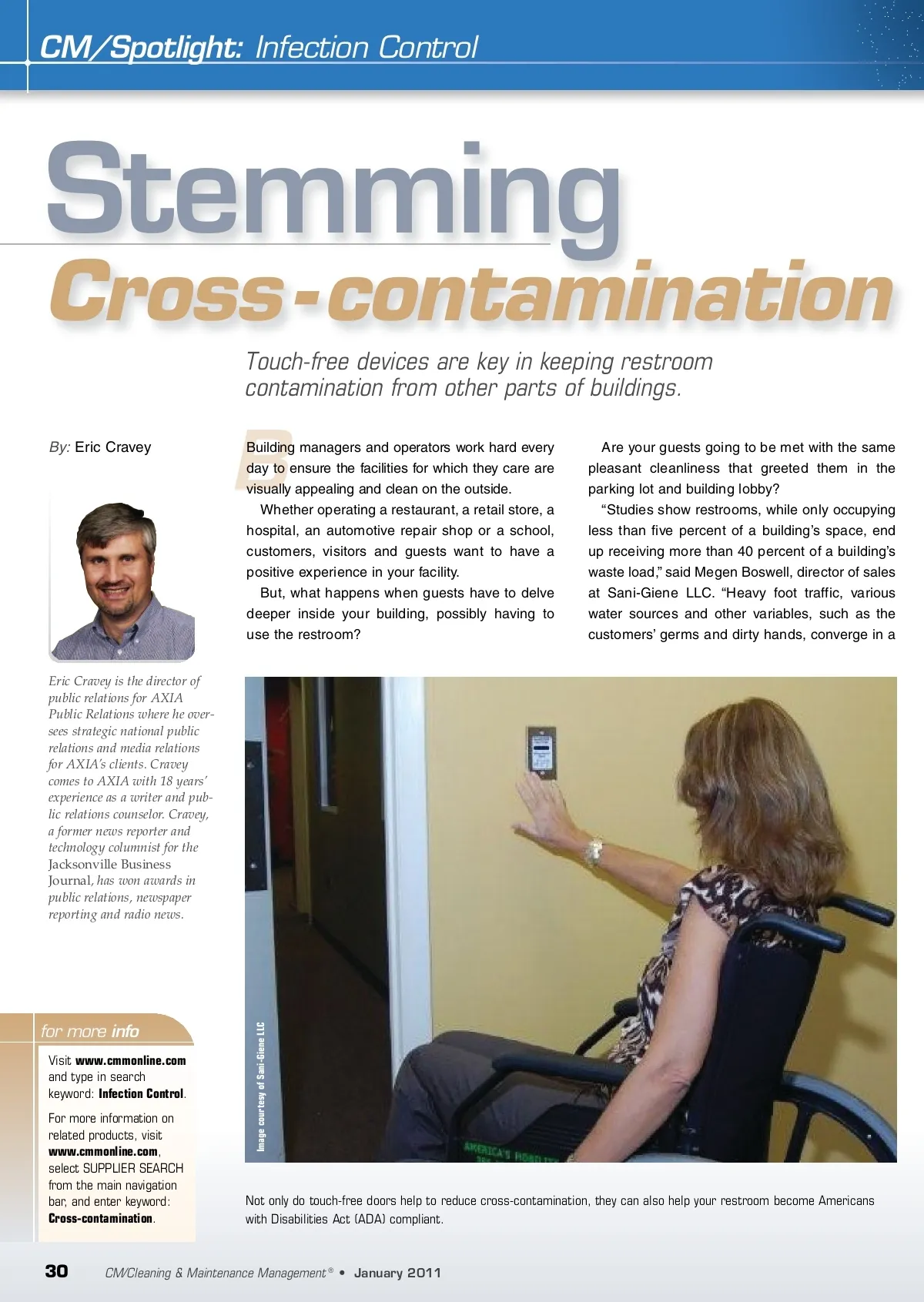 CM/Spotlight: Infection Control Stemming By: Eric Cravey Cross -contamination Touch-free devices are key in keeping restroom contamination from other parts of buildings. B Building managers and operators work hard every day to ensure the facilities for which they care are visually appealing and clean on the outside. Whether operating a restaurant, a retail store, a hospital, an automotive repair shop or a school, customers, visitors and guests want to have a positive experience in your facility. But, what happens when guests have to delve deeper inside your building, possibly having to use the restroom? Are your guests going to be met with the same pleasant cleanliness that greeted them in the parking lot and building lobby? “Studies show restrooms, while only occupying less than five percent of a building’s space, end up receiving more than 40 percent of a building’s waste load,” said Megen Boswell, director of sales at Sani-Giene LLC. “Heavy foot traffic, various water sources and other variables, such as the customers’ germs and dirty hands, converge in a Eric Cravey is the director of public relations for AXIA Public Relations where he over-sees strategic national public relations and media relations for AXIA’s clients. Cravey comes to AXIA with 18 years’ experience as a writer and pub-lic relations counselor. Cravey, a former news reporter and technology columnist for the Jacksonville Business Journal , has won awards in public relations, newspaper reporting and radio news. for more info Visit www.cmmonline.com and type in search keyword: Infection Control . For more information on related products, visit www.cmmonline.com , select SUPPLIER SEARCH from the main navigation bar, and enter keyword: Cross-contamination . Not only do touch-free doors help to reduce cross-contamination, they can also help your restroom become Americans with Disabilities Act (ADA) compliant. 30 CM/Cleaning & Maintenance Management ® • January 2011 Image courtesy of Sani-Giene LLC