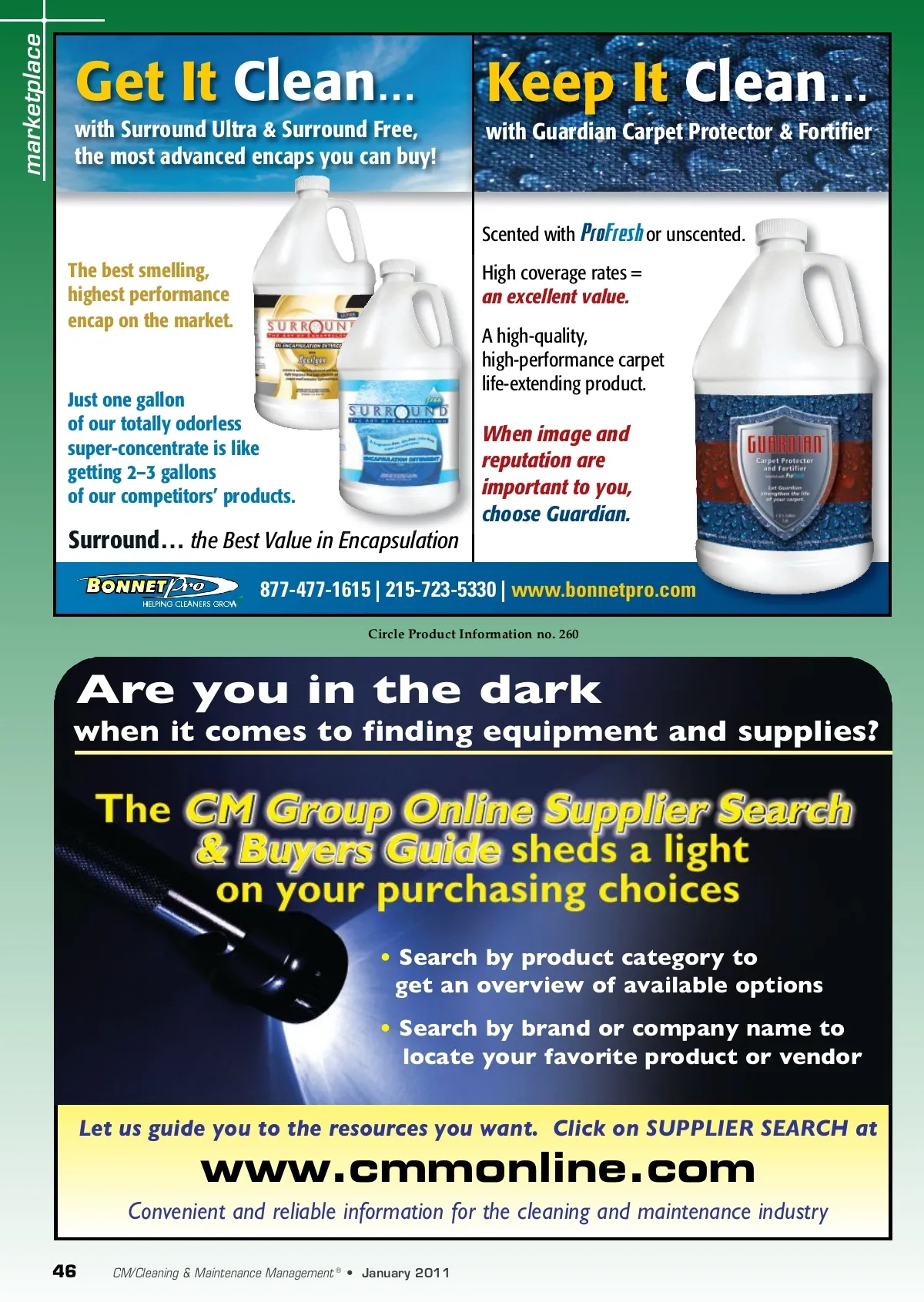 marketplace Get It Clean … with Surround Ultra & Surround Free, the most advanced encaps you can buy! Keep It Clean … with Guardian Carpet Protector & Fortifi er Scented with ProFresh or unscented. The best smelling, highest performance encap on the market. High coverage rates = an excellent value. A high-quality, high-performance carpet life-extending product. Just one gallon of our totally odorless super-concentrate is like getting 2–3 gallons of our competitors’ products. When image and reputation are important to you, choose Guardian. Surround… the Best Value in Encapsulation 877-477-1615 | 215-723-5330 | www.bonnetpro.com Circle Product Information no. 260 Are you in the dark when it comes to finding equipment and supplies? • Search by product category to get an overview of available options • Search by brand or company name to locate your favorite product or vendor Let us guide you to the resources you want. Click on SUPPLIER SEARCH at www.cmmonline.com Convenient and reliable information for the cleaning and maintenance industry 46 CM/Cleaning & Maintenance Management ® • January 2011