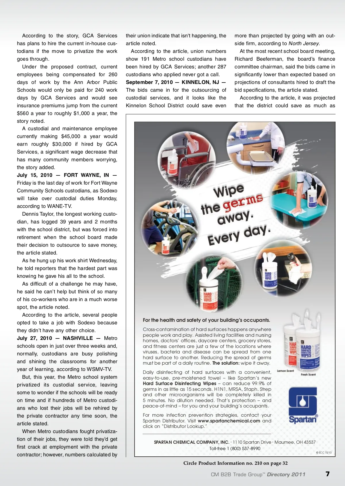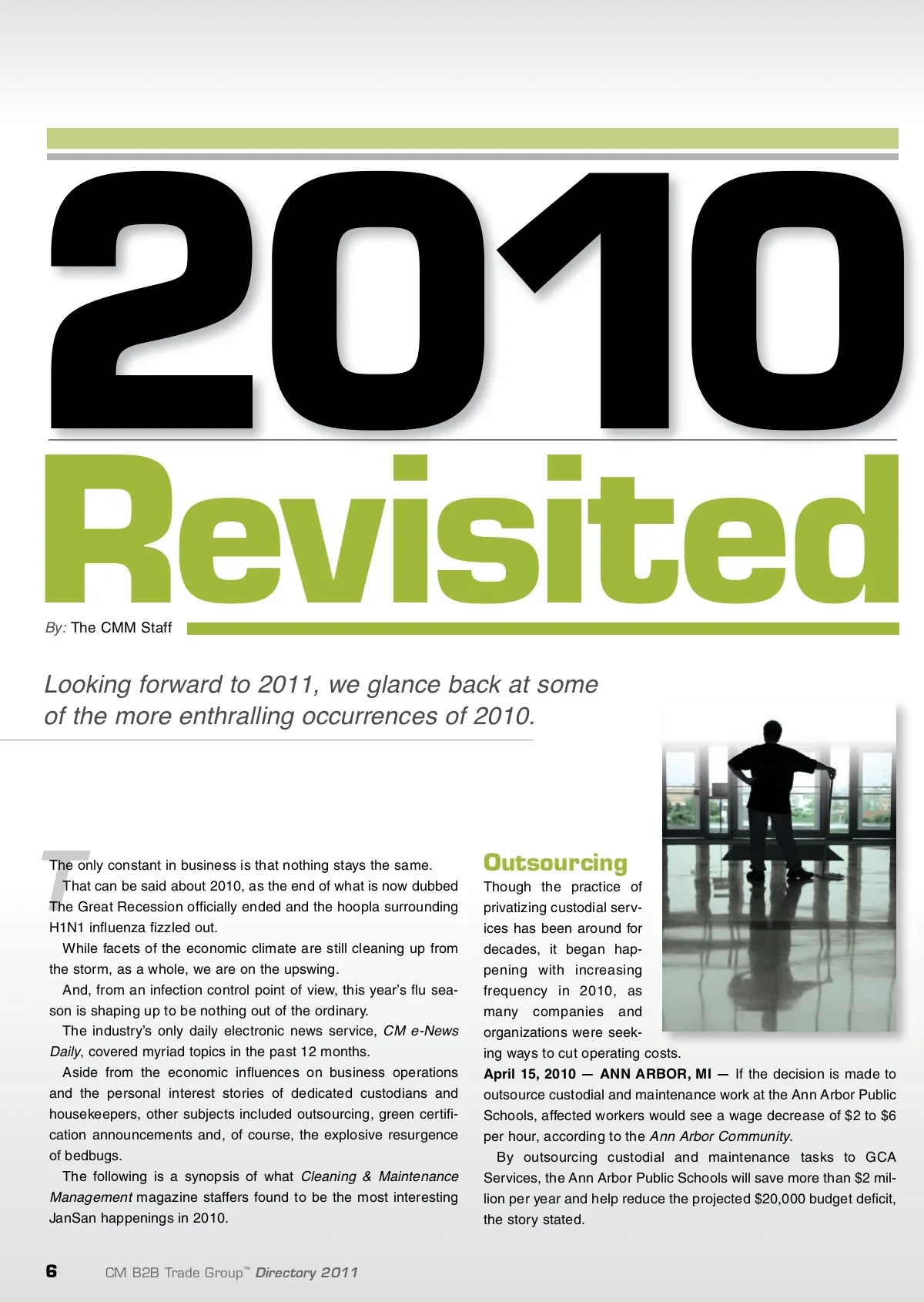 2010 Revisited By: The CMM Staff Looking forward to 2011, we glance back at some of the more enthralling occurrences of 2010. T The only constant in business is that nothing stays the same. That can be said about 2010, as the end of what is now dubbed The Great Recession officially ended and the hoopla surrounding H1N1 influenza fizzled out. While facets of the economic climate are still cleaning up from the storm, as a whole, we are on the upswing. And, from an infection control point of view, this year’s flu sea-son is shaping up to be nothing out of the ordinary. The industry’s only daily electronic news service, CM e-News Daily , covered myriad topics in the past 12 months. Aside from the economic influences on business operations and the personal interest stories of dedicated custodians and housekeepers, other subjects included outsourcing, green certifi-cation announcements and, of course, the explosive resurgence of bedbugs. The following is a synopsis of what Cleaning & Maintenance Management magazine staffers found to be the most interesting JanSan happenings in 2010. Outsourcing Though the practice of privatizing custodial serv-ices has been around for decades, it began hap-pening with increasing frequency in 2010, as many companies and organizations were seek-ing ways to cut operating costs. April 15, 2010 — ANN ARBOR, MI — If the decision is made to outsource custodial and maintenance work at the Ann Arbor Public Schools, affected workers would see a wage decrease of $2 to $6 per hour, according to the Ann Arbor Community . By outsourcing custodial and maintenance tasks to GCA Services, the Ann Arbor Public Schools will save more than $2 mil-lion per year and help reduce the projected $20,000 budget deficit, the story stated. 6 CM B2B Trade Group ™ Directory 2011