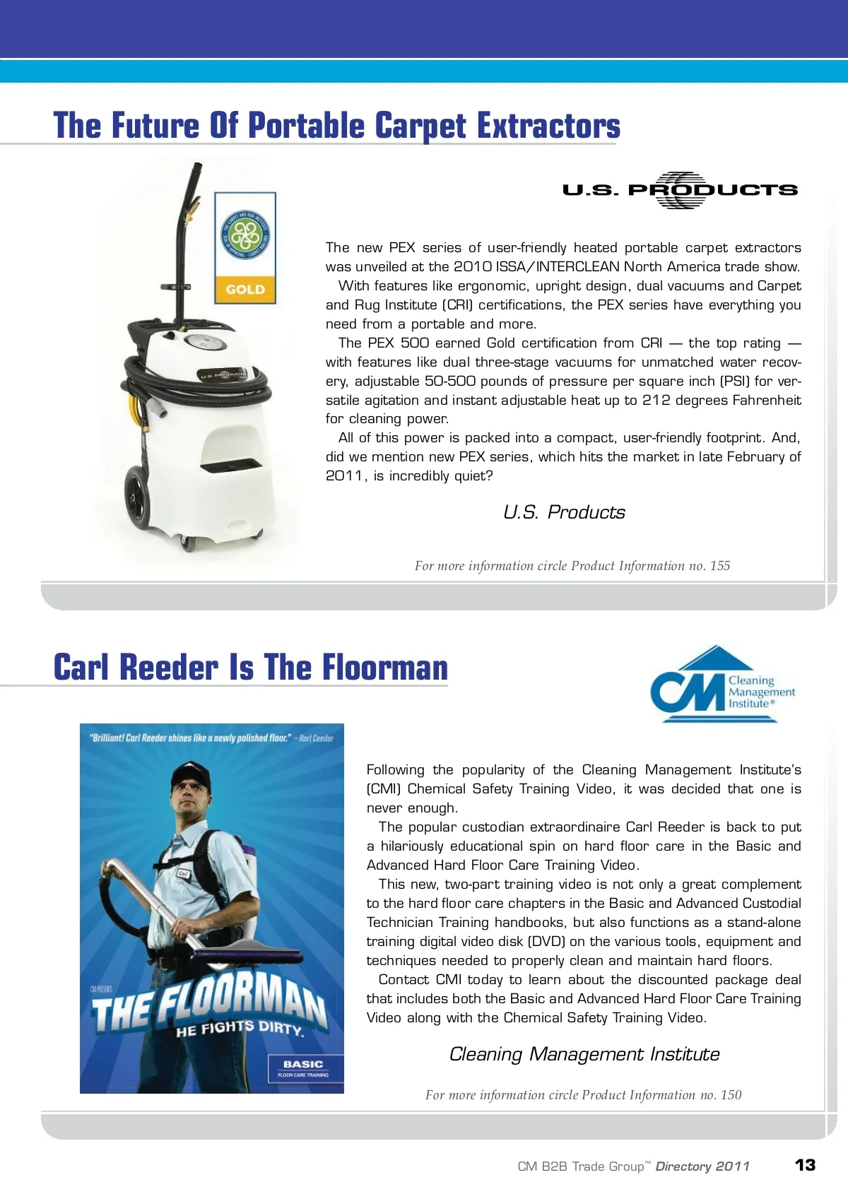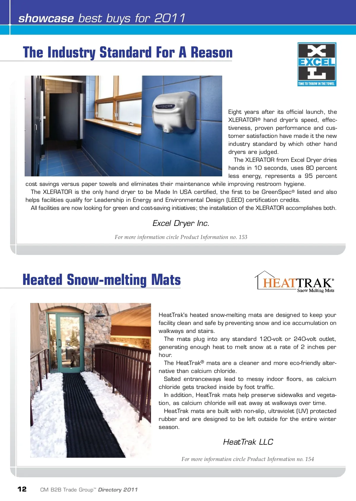 showcase best buys for 2011 The Industry Standard For A Reason Eight years after its official launch, the XLERATOR ® hand dryer’s speed, effec-tiveness, proven performance and cus-tomer satisfaction have made it the new industry standard by which other hand dryers are judged. The XLERATOR from Excel Dryer dries hands in 10 seconds, uses 80 percent less energy, represents a 95 percent cost savings versus paper towels and eliminates their maintenance while improving restroom hygiene. The XLERATOR is the only hand dryer to be Made In USA certified, the first to be GreenSpec ® listed and also helps facilities qualify for Leadership in Energy and Environmental Design (LEED) certification credits. All facilities are now looking for green and cost-saving initiatives; the installation of the XLERATOR accomplishes both. Excel Dryer Inc. For more information circle Product Information no. 153 Heated Snow-melting Mats HeatTrak's heated snow-melting mats are designed to keep your facility clean and safe by preventing snow and ice accumulation on walkways and stairs. The mats plug into any standard 120-volt or 240-volt outlet, generating enough heat to melt snow at a rate of 2 inches per hour. The HeatTrak ® mats are a cleaner and more eco-friendly alter-native than calcium chloride. Salted entranceways lead to messy indoor floors, as calcium chloride gets tracked inside by foot traffic. In addition, HeatTrak mats help preserve sidewalks and vegeta-tion, as calcium chloride will eat away at walkways over time. HeatTrak mats are built with non-slip, ultraviolet (UV) protected rubber and are designed to be left outside for the entire winter season. HeatTrak LLC For more information circle Product Information no. 154 12 CM B2B Trade Group ™ Directory 2011