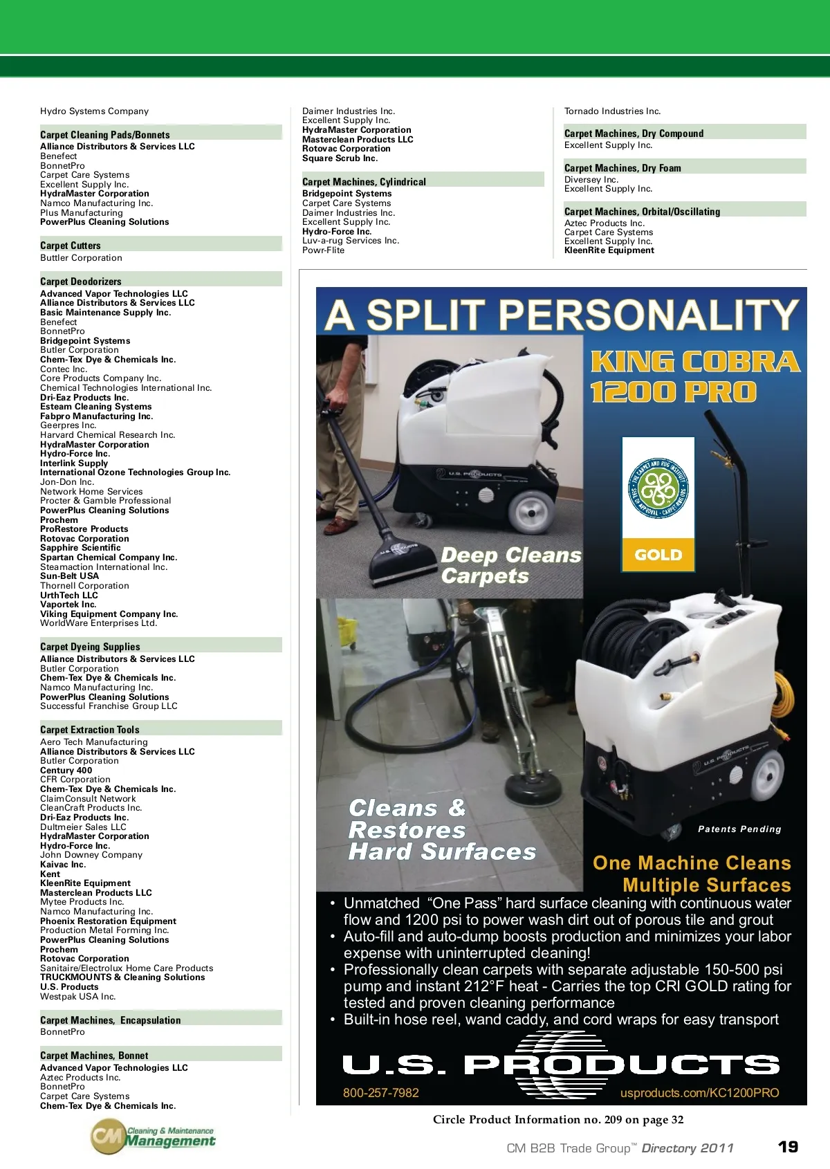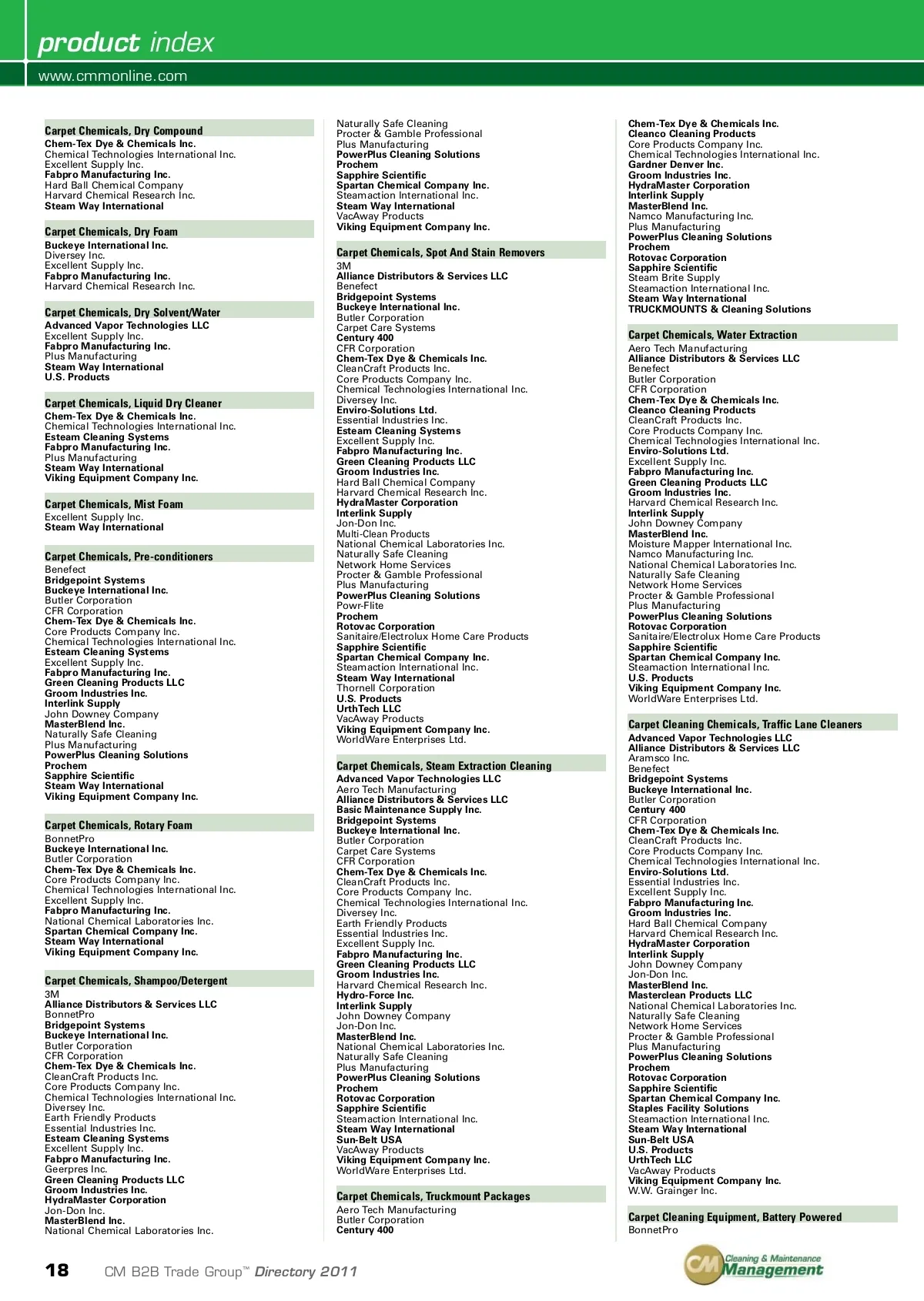 product index www.cmmonline.com Naturally Safe Cleaning Procter & Gamble Professional Plus Manufacturing PowerPlus Cleaning Solutions Prochem Sapphire Scientific Spartan Chemical Company Inc. Steamaction International Inc. Steam Way International VacAway Products Viking Equipment Company Inc. Chem-Tex Dye & Chemicals Inc. Cleanco Cleaning Products Core Products Company Inc. Chemical Technologies International Inc. Gardner Denver Inc. Groom Industries Inc. HydraMaster Corporation Interlink Supply MasterBlend Inc. Namco Manufacturing Inc. Plus Manufacturing PowerPlus Cleaning Solutions Prochem Rotovac Corporation Sapphire Scientific Steam Brite Supply Steamaction International Inc. Steam Way International TRUCKMOUNTS & Cleaning Solutions Carpet Chemicals, Dry Compound Chem-Tex Dye & Chemicals Inc. Chemical Technologies International Inc. Excellent Supply Inc. Fabpro Manufacturing Inc. Hard Ball Chemical Company Harvard Chemical Research Inc. Steam Way International Carpet Chemicals, Dry Foam Buckeye International Inc. Diversey Inc. Excellent Supply Inc. Fabpro Manufacturing Inc. Harvard Chemical Research Inc. Carpet Chemicals, Spot And Stain Removers 3M Alliance Distributors & Services LLC Benefect Bridgepoint Systems Buckeye International Inc. Butler Corporation Carpet Care Systems Century 400 CFR Corporation Chem-Tex Dye & Chemicals Inc. CleanCraft Products Inc. Core Products Company Inc. Chemical Technologies International Inc. Diversey Inc. Enviro-Solutions Ltd. Essential Industries Inc. Esteam Cleaning Systems Excellent Supply Inc. Fabpro Manufacturing Inc. Green Cleaning Products LLC Groom Industries Inc. Hard Ball Chemical Company Harvard Chemical Research Inc. HydraMaster Corporation Interlink Supply Jon-Don Inc. Multi-Clean Products National Chemical Laboratories Inc. Naturally Safe Cleaning Network Home Services Procter & Gamble Professional Plus Manufacturing PowerPlus Cleaning Solutions Powr-Flite Prochem Rotovac Corporation Sanitaire/Electrolux Home Care Products Sapphire Scientific Spartan Chemical Company Inc. Steamaction International Inc. Steam Way International Thornell Corporation U.S. Products UrthTech LLC VacAway Products Viking Equipment Company Inc. WorldWare Enterprises Ltd. Carpet Chemicals, Dry Solvent/Water Advanced Vapor Technologies LLC Excellent Supply Inc. Fabpro Manufacturing Inc. Plus Manufacturing Steam Way International U.S. Products Carpet Chemicals, Water Extraction Aero Tech Manufacturing Alliance Distributors & Services LLC Benefect Butler Corporation CFR Corporation Chem-Tex Dye & Chemicals Inc. Cleanco Cleaning Products CleanCraft Products Inc. Core Products Company Inc. Chemical Technologies International Inc. Enviro-Solutions Ltd. Excellent Supply Inc. Fabpro Manufacturing Inc. Green Cleaning Products LLC Groom Industries Inc. Harvard Chemical Research Inc. Interlink Supply John Downey Company MasterBlend Inc. Moisture Mapper International Inc. Namco Manufacturing Inc. National Chemical Laboratories Inc. Naturally Safe Cleaning Network Home Services Procter & Gamble Professional Plus Manufacturing PowerPlus Cleaning Solutions Rotovac Corporation Sanitaire/Electrolux Home Care Products Sapphire Scientific Spartan Chemical Company Inc. Steamaction International Inc. U.S. Products Viking Equipment Company Inc. WorldWare Enterprises Ltd. Carpet Chemicals, Liquid Dry Cleaner Chem-Tex Dye & Chemicals Inc. Chemical Technologies International Inc. Esteam Cleaning Systems Fabpro Manufacturing Inc. Plus Manufacturing Steam Way International Viking Equipment Company Inc. Carpet Chemicals, Mist Foam Excellent Supply Inc. Steam Way International Carpet Chemicals, Pre-conditioners Benefect Bridgepoint Systems Buckeye International Inc. Butler Corporation CFR Corporation Chem-Tex Dye & Chemicals Inc. Core Products Company Inc. Chemical Technologies International Inc. Esteam Cleaning Systems Excellent Supply Inc. Fabpro Manufacturing Inc. Green Cleaning Products LLC Groom Industries Inc. Interlink Supply John Downey Company MasterBlend Inc. Naturally Safe Cleaning Plus Manufacturing PowerPlus Cleaning Solutions Prochem Sapphire Scientific Steam Way International Viking Equipment Company Inc. Carpet Cleaning Chemicals, Traffic Lane Cleaners Advanced Vapor Technologies LLC Alliance Distributors & Services LLC Aramsco Inc. Benefect Bridgepoint Systems Buckeye International Inc. Butler Corporation Century 400 CFR Corporation Chem-Tex Dye & Chemicals Inc. CleanCraft Products Inc. Core Products Company Inc. Chemical Technologies International Inc. Enviro-Solutions Ltd. Essential Industries Inc. Excellent Supply Inc. Fabpro Manufacturing Inc. Groom Industries Inc. Hard Ball Chemical Company Harvard Chemical Research Inc. HydraMaster Corporation Interlink Supply John Downey Company Jon-Don Inc. MasterBlend Inc. Masterclean Products LLC National Chemical Laboratories Inc. Naturally Safe Cleaning Network Home Services Procter & Gamble Professional Plus Manufacturing PowerPlus Cleaning Solutions Prochem Rotovac Corporation Sapphire Scientific Spartan Chemical Company Inc. Staples Facility Solutions Steamaction International Inc. Steam Way International Sun-Belt USA U.S. Products UrthTech LLC VacAway Products Viking Equipment Company Inc. W.W. Grainger Inc. Carpet Chemicals, Steam Extraction Cleaning Advanced Vapor Technologies LLC Aero Tech Manufacturing Alliance Distributors & Services LLC Basic Maintenance Supply Inc. Bridgepoint Systems Buckeye International Inc. Butler Corporation Carpet Care Systems CFR Corporation Chem-Tex Dye & Chemicals Inc. CleanCraft Products Inc. Core Products Company Inc. Chemical Technologies International Inc. Diversey Inc. Earth Friendly Products Essential Industries Inc. Excellent Supply Inc. Fabpro Manufacturing Inc. Green Cleaning Products LLC Groom Industries Inc. Harvard Chemical Research Inc. Hydro-Force Inc. Interlink Supply John Downey Company Jon-Don Inc. MasterBlend Inc. National Chemical Laboratories Inc. Naturally Safe Cleaning Pl