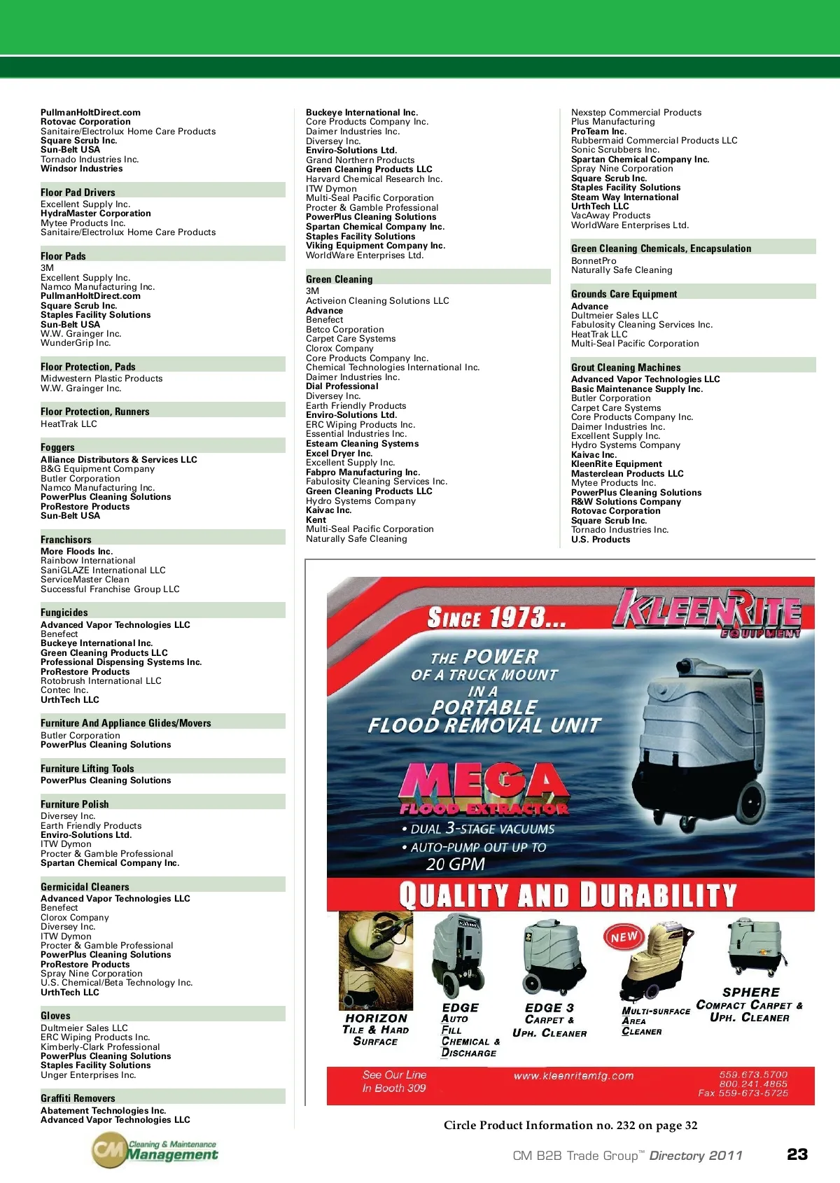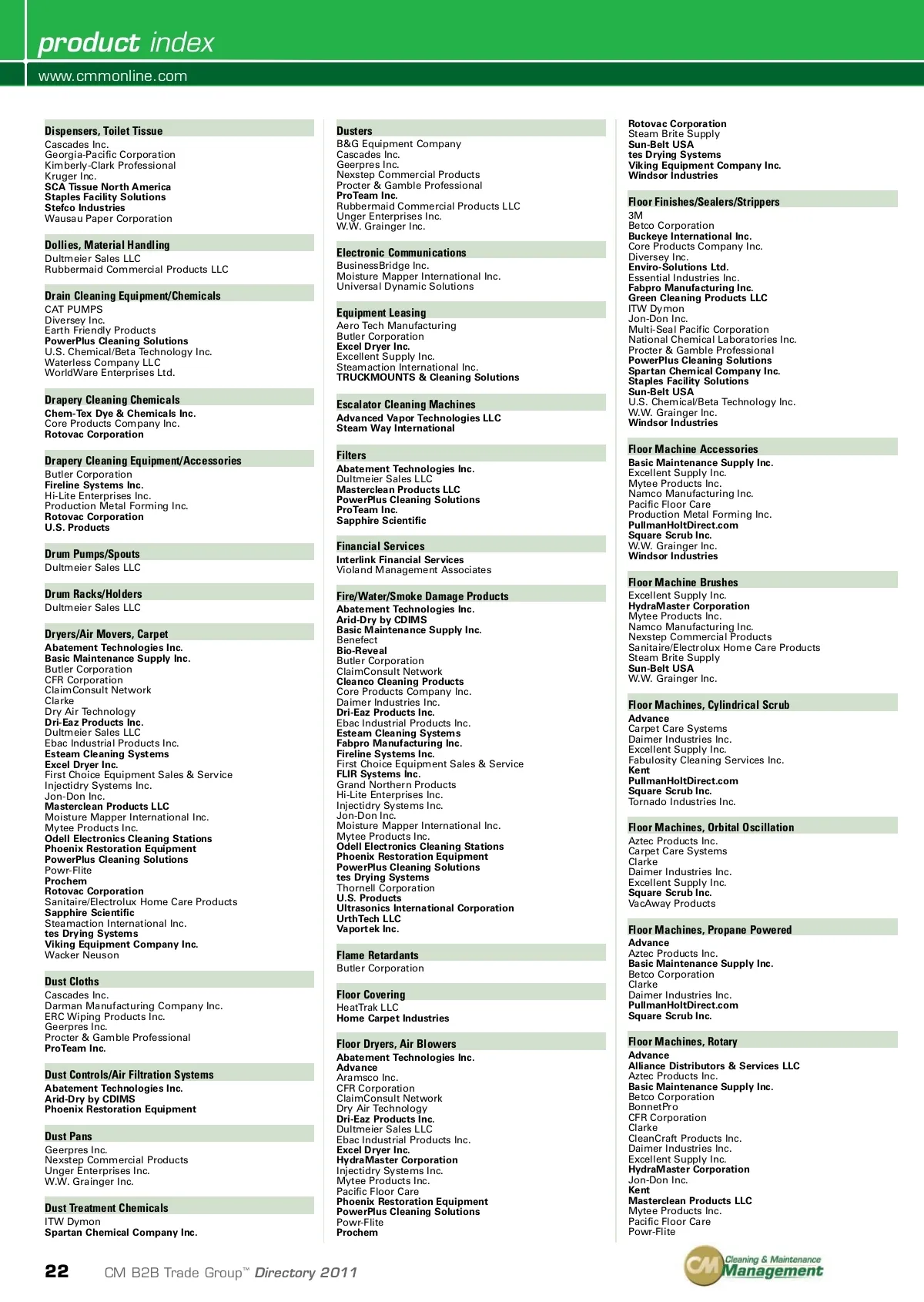 product index www.cmmonline.com Rotovac Corporation Steam Brite Supply Sun-Belt USA tes Drying Systems Viking Equipment Company Inc. Windsor Industries Dispensers, Toilet Tissue Cascades Inc. Georgia-Pacific Corporation Kimberly-Clark Professional Kruger Inc. SCA Tissue North America Staples Facility Solutions Stefco Industries Wausau Paper Corporation Dusters B&G Equipment Company Cascades Inc. Geerpres Inc. Nexstep Commercial Products Procter & Gamble Professional ProTeam Inc. Rubbermaid Commercial Products LLC Unger Enterprises Inc. W.W. Grainger Inc. Floor Finishes/Sealers/Strippers 3M Betco Corporation Buckeye International Inc. Core Products Company Inc. Diversey Inc. Enviro-Solutions Ltd. Essential Industries Inc. Fabpro Manufacturing Inc. Green Cleaning Products LLC ITW Dymon Jon-Don Inc. Multi-Seal Pacific Corporation National Chemical Laboratories Inc. Procter & Gamble Professional PowerPlus Cleaning Solutions Spartan Chemical Company Inc. Staples Facility Solutions Sun-Belt USA U.S. Chemical/Beta Technology Inc. W.W. Grainger Inc. Windsor Industries Dollies, Material Handling Dultmeier Sales LLC Rubbermaid Commercial Products LLC Electronic Communications BusinessBridge Inc. Moisture Mapper International Inc. Universal Dynamic Solutions Drain Cleaning Equipment/Chemicals CAT PUMPS Diversey Inc. Earth Friendly Products PowerPlus Cleaning Solutions U.S. Chemical/Beta Technology Inc. Waterless Company LLC WorldWare Enterprises Ltd. Equipment Leasing Aero Tech Manufacturing Butler Corporation Excel Dryer Inc. Excellent Supply Inc. Steamaction International Inc. TRUCKMOUNTS & Cleaning Solutions Drapery Cleaning Chemicals Chem-Tex Dye & Chemicals Inc. Core Products Company Inc. Rotovac Corporation Escalator Cleaning Machines Advanced Vapor Technologies LLC Steam Way International Drapery Cleaning Equipment/Accessories Butler Corporation Fireline Systems Inc. Hi-Lite Enterprises Inc. Production Metal Forming Inc. Rotovac Corporation U.S. Products Filters Abatement Technologies Inc. Dultmeier Sales LLC Masterclean Products LLC PowerPlus Cleaning Solutions ProTeam Inc. Sapphire Scientific Floor Machine Accessories Basic Maintenance Supply Inc. Excellent Supply Inc. Mytee Products Inc. Namco Manufacturing Inc. Pacific Floor Care Production Metal Forming Inc. PullmanHoltDirect.com Square Scrub Inc. W.W. Grainger Inc. Windsor Industries Drum Pumps/Spouts Dultmeier Sales LLC Financial Services Interlink Financial Services Violand Management Associates Floor Machine Brushes Drum Racks/Holders Dultmeier Sales LLC Fire/Water/Smoke Damage Products Abatement Technologies Inc. Arid-Dry by CDIMS Basic Maintenance Supply Inc. Benefect Bio-Reveal Butler Corporation ClaimConsult Network Cleanco Cleaning Products Core Products Company Inc. Daimer Industries Inc. Dri-Eaz Products Inc. Ebac Industrial Products Inc. Esteam Cleaning Systems Fabpro Manufacturing Inc. Fireline Systems Inc. First Choice Equipment Sales & Service FLIR Systems Inc. Grand Northern Products Hi-Lite Enterprises Inc. Injectidry Systems Inc. Jon-Don Inc. Moisture Mapper International Inc. Mytee Products Inc. Odell Electronics Cleaning Stations Phoenix Restoration Equipment PowerPlus Cleaning Solutions tes Drying Systems Thornell Corporation U.S. Products Ultrasonics International Corporation UrthTech LLC Vaportek Inc. Dryers/Air Movers, Carpet Abatement Technologies Inc. Basic Maintenance Supply Inc. Butler Corporation CFR Corporation ClaimConsult Network Clarke Dry Air Technology Dri-Eaz Products Inc. Dultmeier Sales LLC Ebac Industrial Products Inc. Esteam Cleaning Systems Excel Dryer Inc. First Choice Equipment Sales & Service Injectidry Systems Inc. Jon-Don Inc. Masterclean Products LLC Moisture Mapper International Inc. Mytee Products Inc. Odell Electronics Cleaning Stations Phoenix Restoration Equipment PowerPlus Cleaning Solutions Powr-Flite Prochem Rotovac Corporation Sanitaire/Electrolux Home Care Products Sapphire Scientific Steamaction International Inc. tes Drying Systems Viking Equipment Company Inc. Wacker Neuson Excellent Supply Inc. HydraMaster Corporation Mytee Products Inc. Namco Manufacturing Inc. Nexstep Commercial Products Sanitaire/Electrolux Home Care Products Steam Brite Supply Sun-Belt USA W.W. Grainger Inc. Floor Machines, Cylindrical Scrub Advance Carpet Care Systems Daimer Industries Inc. Excellent Supply Inc. Fabulosity Cleaning Services Inc. Kent PullmanHoltDirect.com Square Scrub Inc. Tornado Industries Inc. Floor Machines, Orbital Oscillation Aztec Products Inc. Carpet Care Systems Clarke Daimer Industries Inc. Excellent Supply Inc. Square Scrub Inc. VacAway Products Floor Machines, Propane Powered Advance Aztec Products Inc. Basic Maintenance Supply Inc. Betco Corporation Clarke Daimer Industries Inc. PullmanHoltDirect.com Square Scrub Inc. Flame Retardants Butler Corporation Dust Cloths Cascades Inc. Darman Manufacturing Company Inc. ERC Wiping Products Inc. Geerpres Inc. Procter & Gamble Professional ProTeam Inc. Floor Covering HeatTrak LLC Home Carpet Industries Floor Dryers, Air Blowers Abatement Technologies Inc. Advance Aramsco Inc. CFR Corporation ClaimConsult Network Dry Air Technology Dri-Eaz Products Inc. Dultmeier Sales LLC Ebac Industrial Products Inc. Excel Dryer Inc. HydraMaster Corporation Injectidry Systems Inc. Mytee Products Inc. Pacific Floor Care Phoenix Restoration Equipment PowerPlus Cleaning Solutions Powr-Flite Prochem Floor Machines, Rotary Advance Alliance Distributors & Services LLC Aztec Products Inc. Basic Maintenance Supply Inc. Betco Corporation BonnetPro CFR Corporation Clarke CleanCraft Products Inc. Daimer Industries Inc. Excellent Supply Inc. HydraMaster Corporation Jon-Don Inc. Kent Masterclean Products LLC Mytee Products Inc. Pacific Floor Care Powr-Flite Dust Controls/Air Filtration Systems Abatement Technologies Inc. Arid-Dry by CDIMS Phoenix Restoration Equipment Dust Pans Geerpres Inc. Nexstep Commercial Products Unger Enterprises Inc. W.W. Grainger Inc. Dus