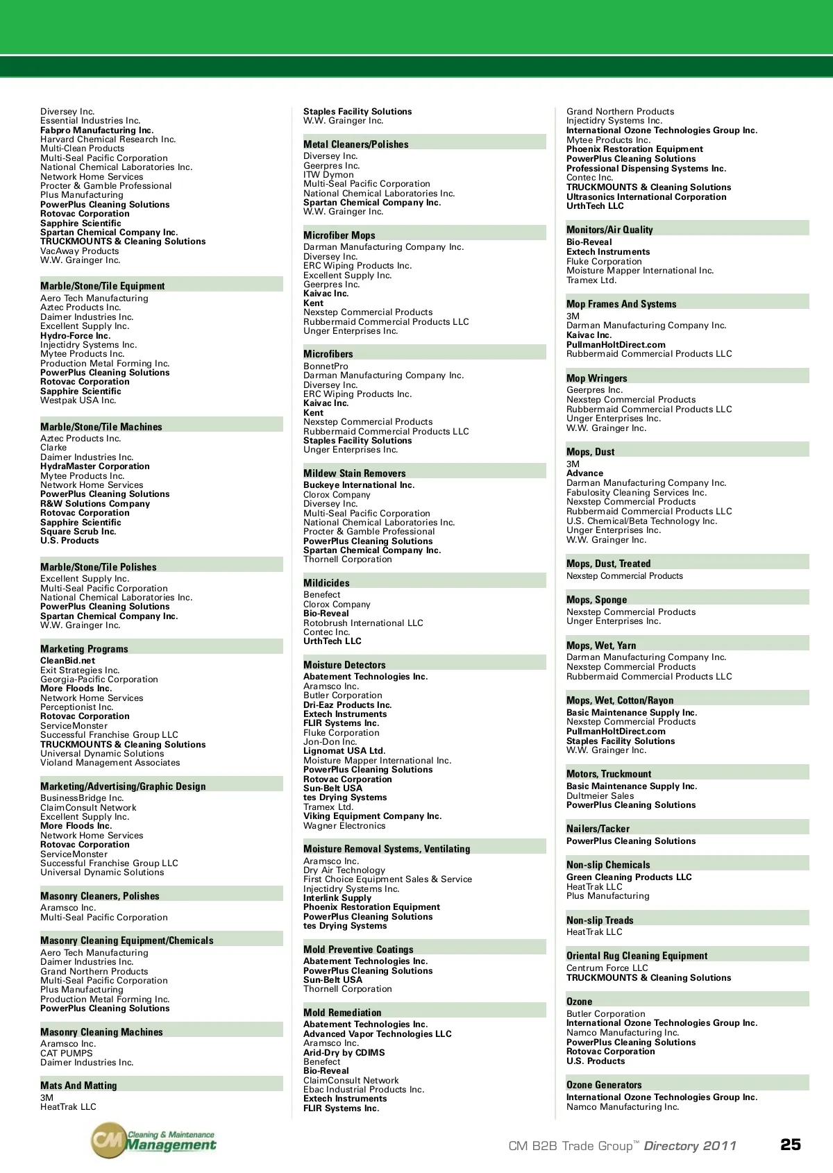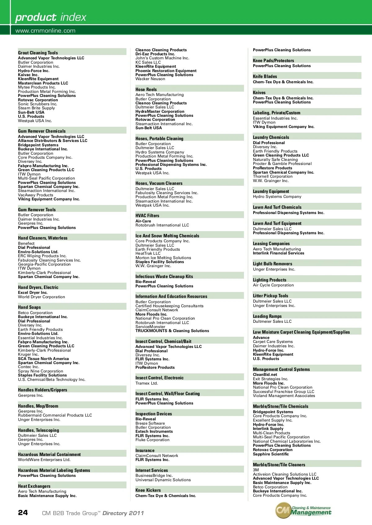 product index www.cmmonline.com Cleanco Cleaning Products Dri-Eaz Products Inc. John’s Custom Machine Inc. KC Sales LLC KleenRite Equipment Phoenix Restoration Equipment PowerPlus Cleaning Solutions Wacker Neuson PowerPlus Cleaning Solutions Grout Cleaning Tools Advanced Vapor Technologies LLC Butler Corporation Daimer Industries Inc. Hydro-Force Inc. Kaivac Inc. KleenRite Equipment Masterclean Products LLC Mytee Products Inc. Production Metal Forming Inc. PowerPlus Cleaning Solutions Rotovac Corporation Sonic Scrubbers Inc. Steam Brite Supply Sun-Belt USA U.S. Products Westpak USA Inc. Knee Pads/Protectors PowerPlus Cleaning Solutions Knife Blades Chem-Tex Dye & Chemicals Inc. Hose Reels Aero Tech Manufacturing Butler Corporation Cleanco Cleaning Products Dultmeier Sales LLC HydraMaster Corporation PowerPlus Cleaning Solutions Rotovac Corporation Steamaction International Inc. Sun-Belt USA Knives Chem-Tex Dye & Chemicals Inc. PowerPlus Cleaning Solutions Labeling, Private/Custom Essential Industries Inc. ITW Dymon Viking Equipment Company Inc. Gum Remover Chemicals Advanced Vapor Technologies LLC Alliance Distributors & Services LLC Bridgepoint Systems Buckeye International Inc. Butler Corporation Core Products Company Inc. Diversey Inc. Fabpro Manufacturing Inc. Green Cleaning Products LLC ITW Dymon Multi-Seal Pacific Corporation PowerPlus Cleaning Solutions Spartan Chemical Company Inc. Steamaction International Inc. VacAway Products Viking Equipment Company Inc. Hoses, Portable Cleaning Butler Corporation Dultmeier Sales LLC Hydro Systems Company Production Metal Forming Inc. PowerPlus Cleaning Solutions Professional Dispensing Systems Inc. U.S. Products Westpak USA Inc. Laundry Chemicals Dial Professional Diversey Inc. Earth Friendly Products Green Cleaning Products LLC Naturally Safe Cleaning Procter & Gamble Professional ProRestore Products Spartan Chemical Company Inc. Thornell Corporation W.W. Grainger Inc. Hoses, Vacuum Cleaners Dultmeier Sales LLC Fabulosity Cleaning Services Inc. Production Metal Forming Inc. Steamaction International Inc. Westpak USA Inc. Laundry Equipment Hydro Systems Company Gum Remover Tools Butler Corporation Daimer Industries Inc. Geerpres Inc. PowerPlus Cleaning Solutions Lawn And Turf Chemicals Professional Dispensing Systems Inc. HVAC Filters Air-Care Rotobrush International LLC Lawn And Turf Equipment Dultmeier Sales LLC Professional Dispensing Systems Inc. Hand Cleaners, Waterless Benefect Dial Professional Enviro-Solutions Ltd. ERC Wiping Products Inc. Fabulosity Cleaning Services Inc. Georgia-Pacific Corporation ITW Dymon Kimberly-Clark Professional Spartan Chemical Company Inc. Ice And Snow Melting Chemicals Core Products Company Inc. Dultmeier Sales LLC Earth Friendly Products HeatTrak LLC Morton Ice Melting Solutions Staples Facility Solutions W.W. Grainger Inc. Leasing Companies Aero Tech Manufacturing Interlink Financial Services Light Bulb Removers Unger Enterprises Inc. Infectious Waste Cleanup Kits Bio-Reveal PowerPlus Cleaning Solutions Lighting Products Air Cycle Corporation Hand Dryers, Electric Excel Dryer Inc. World Dryer Corporation Information And Education Resources Butler Corporation Certified Housekeeping Consultants ClaimConsult Network More Floods Inc. National Pro Clean Corporation Rotobrush International LLC ServiceMonster TRUCKMOUNTS & Cleaning Solutions Litter Pickup Tools Dultmeier Sales LLC Unger Enterprises Inc. Hand Soaps Betco Corporation Buckeye International Inc. Dial Professional Diversey Inc. Earth Friendly Products Enviro-Solutions Ltd. Essential Industries Inc. Fabpro Manufacturing Inc. Green Cleaning Products LLC Kimberly-Clark Professional Kruger Inc. SCA Tissue North America Spartan Chemical Company Inc. Contec Inc. Spray Nine Corporation Staples Facility Solutions U.S. Chemical/Beta Technology Inc. Loading Ramps Dultmeier Sales LLC Low Moisture Carpet Cleaning Equipment/Supplies Advance Carpet Care Systems Daimer Industries Inc. Hydro-Force Inc. KleenRite Equipment U.S. Products Insect Control, Chemical/Bait Advanced Vapor Technologies LLC Dial Professional Diversey Inc. FLIR Systems Inc. ITW Dymon ProRestore Products Management Control Systems CleanBid.net Exit Strategies Inc. More Floods Inc. National Pro Clean Corporation Successful Franchise Group LLC Violand Management Associates Insect Control, Electronic Tramex Ltd. Handles Holders/Grippers Geerpres Inc. Insect Control, Wall/Floor Coating FLIR Systems Inc. PowerPlus Cleaning Solutions Handles, Mop/Broom Geerpres Inc. Rubbermaid Commercial Products LLC Unger Enterprises Inc. Marble/Stone/Tile Chemicals Bridgepoint Systems Core Products Company Inc. Excellent Supply Inc. Hydro-Force Inc. Interlink Supply Multi-Clean Products Multi-Seal Pacific Corporation National Chemical Laboratories Inc. PowerPlus Cleaning Solutions Rotovac Corporation Sapphire Scientific Inspection Devices Bio-Reveal Breeze Software Butler Corporation Extech Instruments FLIR Systems Inc. Fluke Corporation Handles, Telescoping Dultmeier Sales LLC Geerpres Inc. Unger Enterprises Inc. Hazardous Material Containment WorldWare Enterprises Ltd. Insurance ClaimConsult Network FLIR Systems Inc. Marble/Stone/Tile Cleaners Hazardous Material Labeling Systems PowerPlus Cleaning Solutions Internet Services BusinessBridge Inc. Universal Dynamic Solutions Heat Exchangers Aero Tech Manufacturing Basic Maintenance Supply Inc. Knee Kickers Chem-Tex Dye & Chemicals Inc. 3M Activeion Cleaning Solutions LLC Advanced Vapor Technologies LLC Basic Maintenance Supply Inc. Betco Corporation Buckeye International Inc. Core Products Company Inc. 24 CM B2B Trade Group ™ Directory 2011