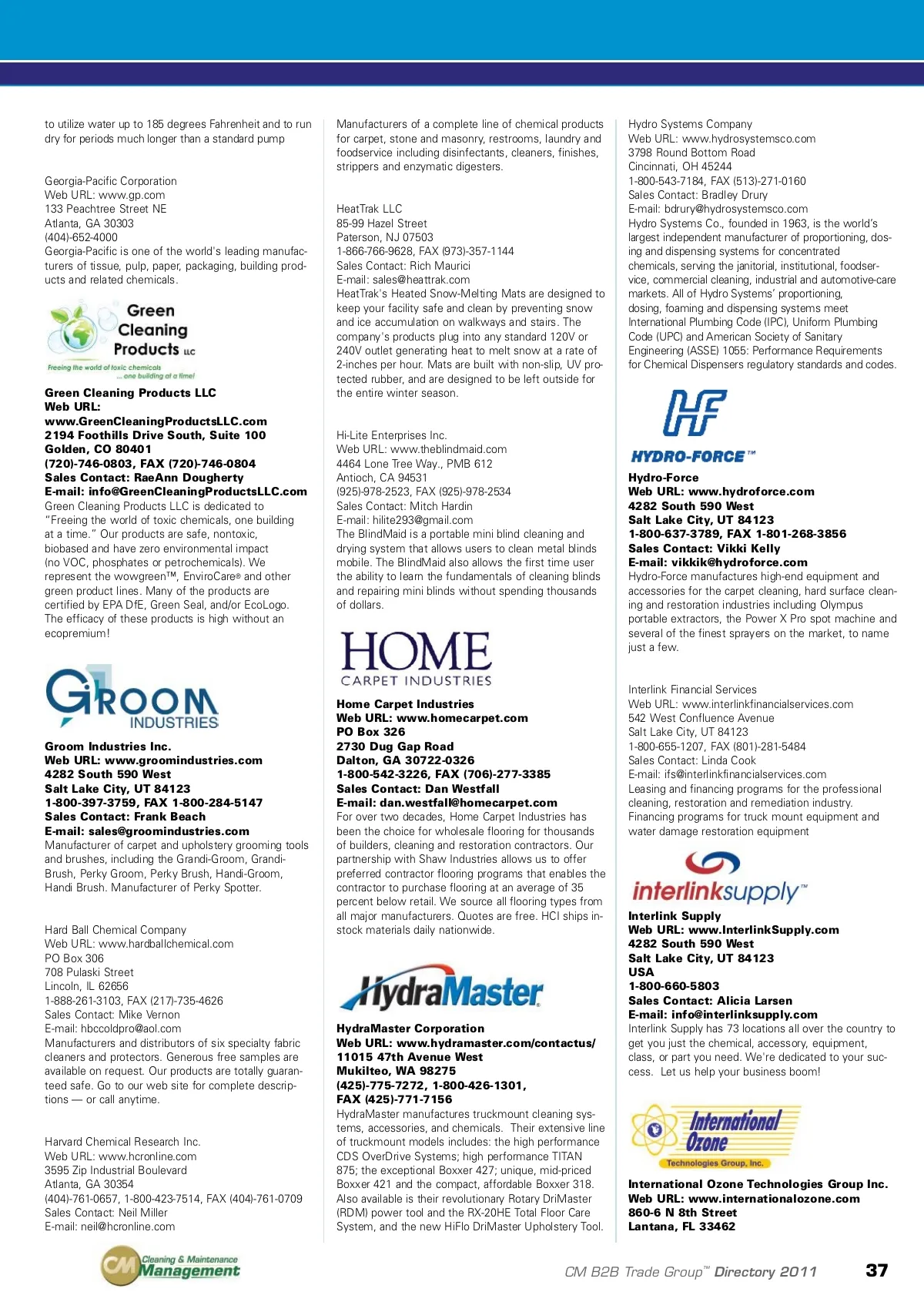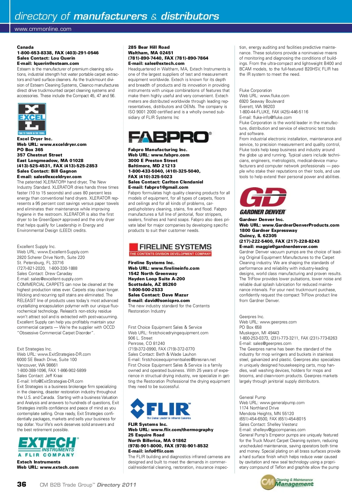 directory of manufacturers www.cmmonline.com Canada 1-800-653-8338, FAX (403)-291-0546 Sales Contact: Lou Querin E-mail: [email protected] Esteam is the manufacturer of premium cleaning solu-tions, industrial strength hot water portable carpet extrac-tors and hard surface cleaners. As the truckmount divi-sion of Esteam Cleaning Systems, Cleanco manufactures direct drive truckmounted carpet cleaning systems and accessories. These include the Compact 45, 47 and 56. & distributors tion, energy auditing and facilities predictive mainte-nance. These solutions provide a noninvasive means of monitoring and diagnosing the conditions of build-ings. From the ultra-compact and lightweight B400 and BCAM models, to the full-featured B20HSV, FLIR has the IR system to meet the need. 285 Bear Hill Road Waltham, MA 02451 (781)-890-7440, FAX (781)-890-7864 E-mail: [email protected] Headquartered in Waltham, MA, Extech Instruments is one of the largest suppliers of test and measurement equipment worldwide. Extech is known for its depth and breadth of products and its innovation in providing instruments with unique combinations of features that make them highly useful and very convenient. Extech meters are distributed worldwide through leading rep-resentatives, distributors and OEMs. The company is ISO 9001 2000 certified and is a wholly owned sub-sidiary of FLIR Systems Inc Excel Dryer Inc. Web URL: www.exceldryer.com PO Box 365 357 Chestnut Street East Longmeadow, MA 01028 (413)-525-4531, FAX (413)-525-2853 Sales Contact: Bill Gagnon E-mail: [email protected] The patented XLERATOR ® hand dryer, The New Industry Standard. XLERATOR dries hands three times faster (10 to 15 seconds) and uses 80 percent less energy than conventional hand dryers. XLERATOR rep-resents a 95 percent cost savings versus paper towels and eliminates their maintenance while improving hygiene in the restroom. XLERATOR is also the first dryer to be GreenSpec ® approved and the only dryer that helps qualify for Leadership in Energy and Environmental Design (LEED) credits. Fabpro Manufacturing Inc. Web URL: www.fabpro.com 3000 E Preston Street Baltimore, MD 21213 1-800-433-5040, (410)-325-5040, FAX (410)-325-5023 Sales Contact: Carlton Clendaniel E-mail: [email protected] Fabpro formulates high quality cleaning products for all models of equipment, for all types of carpets, floors and ceilings and for all kinds of problems, car-pet/upholstery cleaning, stains, fire and flood. Fabpro manufactures a full line of janitorial, floor strippers, sealers, finishes and hand soaps. Fabpro also does pri-vate label for major companies by developing specific products to suit their customer needs. Fluke Corporation Web URL: www.fluke.com 6920 Seaway Boulevard Everett, WA 98203 1-800-44-FLUKE, FAX (425)-446-5116 E-mail: [email protected] Fluke Corporation is the world leader in the manufac-ture, distribution and service of electronic test tools and software. From industrial electronic installation, maintenance and service, to precision measurement and quality control, Fluke tools help keep business and industry around the globe up and running. Typical users include techni-cians, engineers, metrologists, medical-device manu-facturers and computer network professionals — peo-ple who stake their reputations on their tools, and use tools to help extend their personal power and abilities. Excellent Supply Inc. Web URL: www.Excellent-Supply.com 2820 Scherer Drive North, Suite 220 St. Petersburg, FL 33716 (727)-821-2020, 1-800-330-1888 Sales Contact: Drew Canaday E-mail: [email protected] COMMERCIAL CARPETS can now be cleaned at the highest production rates ever. Carpets stay clean longer. Wicking and recurring spill stains are eliminated. The RELEASIT line of products uses today's most advanced crystallizing encapsulation polymer with our unique fluo-rochemical technology. Releasit’s non-sticky residue won’t attract soil and is extracted with post-vacuuming. Excellent Supply can help you profitably maintain your commercial carpets — We're the supplier with OCCD “Obsessive Commercial Carpet Disorder”. Fireline Systems Inc. Web URL: www.firelineinfo.com 1542 North Greenway Hayden Loop Suite A-200 Scottsdale, AZ 85260 1-800-500-2533 Sales Contact: Dave Mazur E-mail: [email protected] The new industry standard for the Contents Restoration Industry Gardner Denver Inc. Web URL: www.GardnerDenverProducts.com 1800 Gardner Expressway Quincy, IL 62305 (217)-222-5400, FAX (217)-228-8243 E-mail: [email protected] Gardner Denver vacuum pumps are the choice of lead-ing Original Equipment Manufactures to the Carpet Cleaning industry. We are shaping the standards of performance and reliability with industry-leading designs, world class manufacturing and proven results. The TriFlow provides lower pulsations, lower noise and reliable dual splash lubrication for reduced mainte-nance intervals. For your next truckmount purchase, confidently request the compact TriFlow product line from Gardner Denver. Exit Strategies Inc. Web URL: www.ExitStrategies-DR.com 6000 SE Beach Drive, Suite 100 Vancouver, WA 98661 1-800-388-1096, FAX 1-866-902-5899 Sales Contact: Jeff Kraai E-mail: [email protected] Exit Strategies is a business brokerage firm specializing in the cleaning, disaster restoration industry throughout the U.S. and Canada. Starting with a business Valuation and Analysis and answers to hundreds of questions, Exit Strategies instills confidence and peace of mind as you contemplate selling. Once ready, Exit Strategies confi-dentially packages, markets and sells your business for top dollar. Your life’s work deserves solid answers and the best retirement possible. First Choice Equipment Sales & Service Web URL: firstchoicedryingequipment.com 906 L. Street Penrose, CO 81240 (719)-372-0990, FAX (719)-372-0770 Sales Contact: Beth & Wade Lauhon E-mail: [email protected] First Choice Equipment Sales & Service is a family owned and operated business. With 25 years of ex