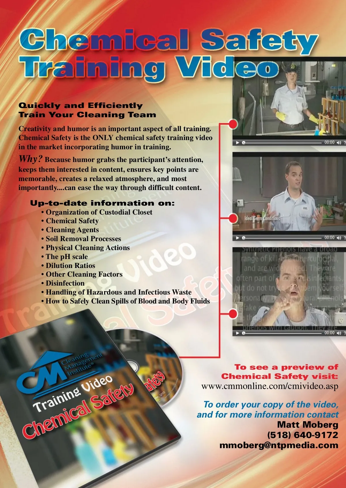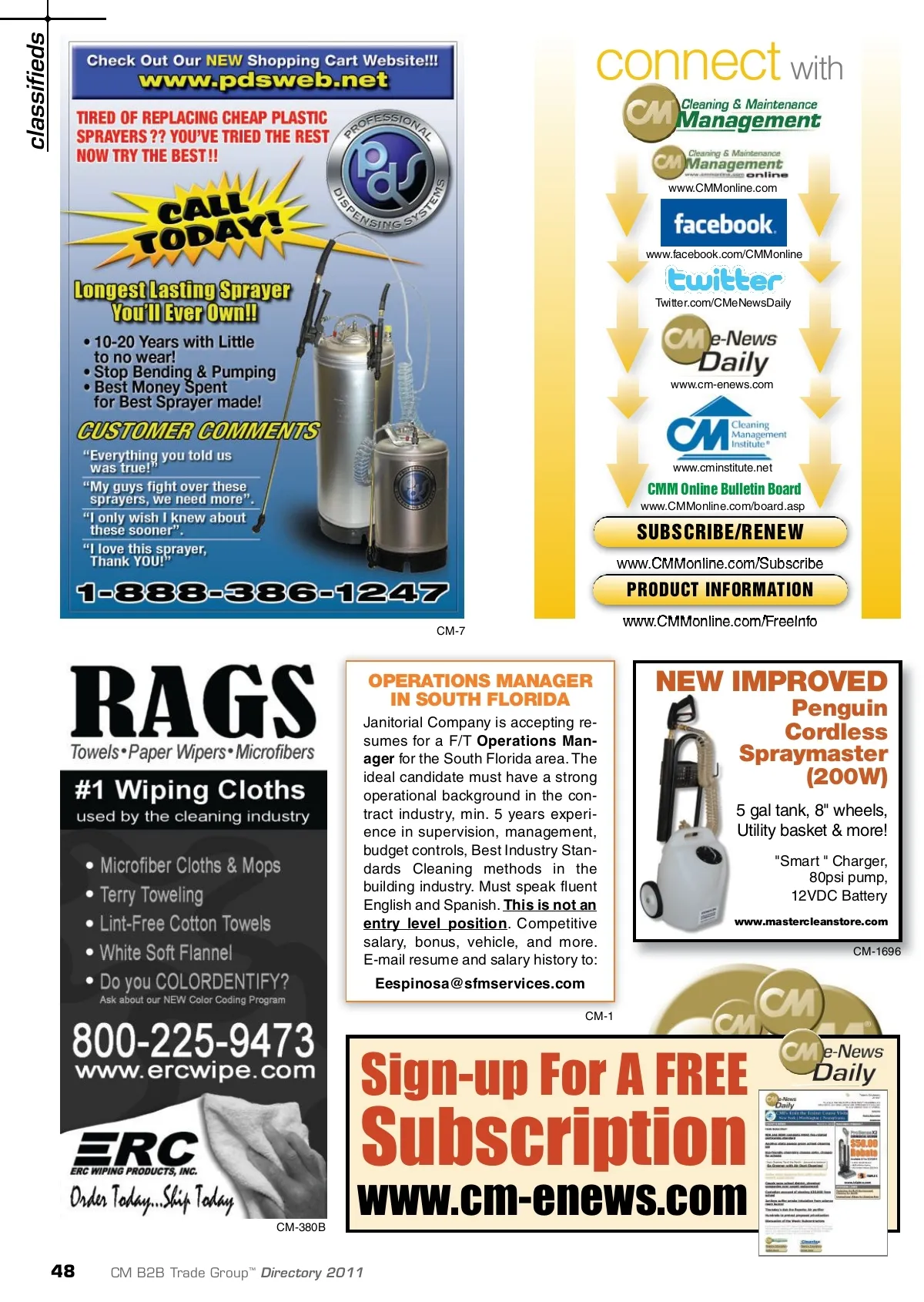 classifieds connect with www.CMMonline.com www.facebook.com/CMMonline Twitter.com/CMeNewsDaily www.cm-enews.com www.cminstitute.net CMM Online Bulletin Board www.CMMonline.com/board.asp SUBSCRIBE/RENEW www.CMMonline.com/Subscribe PRODUCT INFORMATION CM-7 www.CMMonline.com/FreeInfo OPERATIONS MANAGER IN SOUTH FLORIDA Janitorial Company is accepting re-sumes for a F/T Operations Man-ager for the South Florida area. The ideal candidate must have a strong operational background in the con-tract industry, min. 5 years experi-ence in supervision, management, budget controls, Best Industry Stan-dards Cleaning methods in the building industry. Must speak fluent English and Spanish. This is not an entry level position . Competitive salary, bonus, vehicle, and more. E-mail resume and salary history to: [email protected] CM-1 NEW IMPROVED Penguin Cordless Spraymaster (200W) 5 gal tank, 8" wheels, Utility basket & more! "Smart" Charger, 80psi pump, 12VDC Battery www.mastercleanstore.com CM-1696 Sign-up For A FREE Subscription www.cm-enews.com CM-380B 48 CM B2B Trade Group ™ Directory 2011