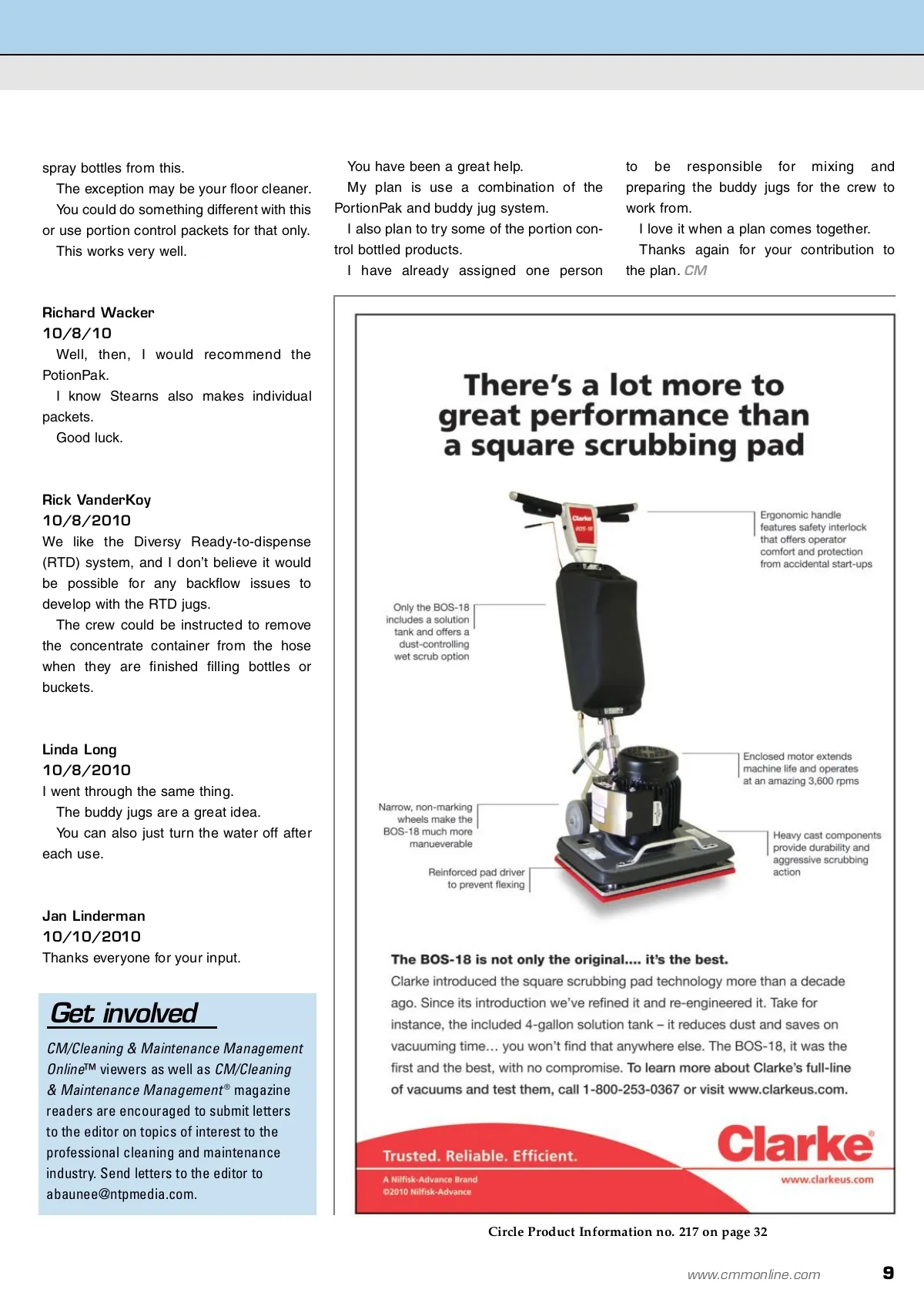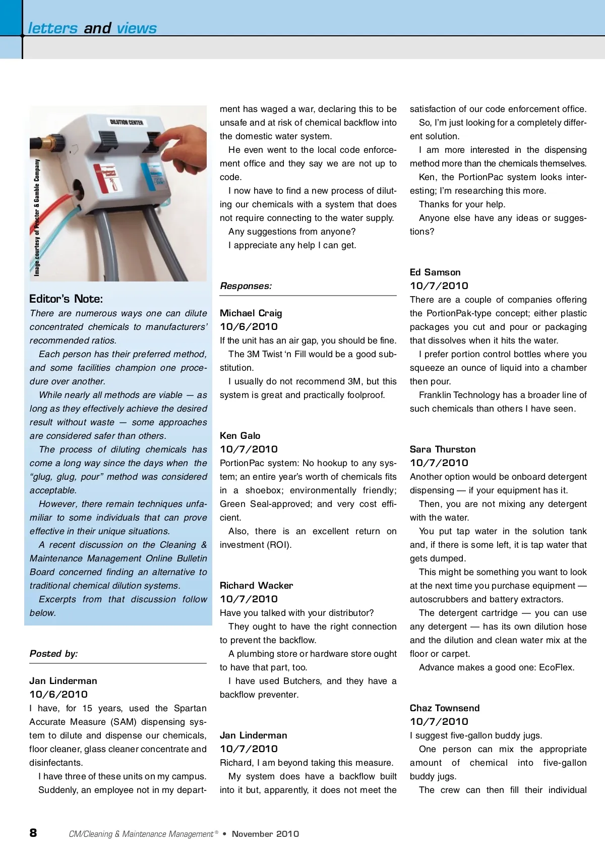 letters and views Image courtesy of Procter & Gamble Company ment has waged a war, declaring this to be unsafe and at risk of chemical backflow into the domestic water system. He even went to the local code enforce-ment office and they say we are not up to code. I now have to find a new process of dilut-ing our chemicals with a system that does not require connecting to the water supply. Any suggestions from anyone? I appreciate any help I can get. satisfaction of our code enforcement office. So, I’m just looking for a completely differ-ent solution. I am more interested in the dispensing method more than the chemicals themselves. Ken, the PortionPac system looks inter-esting; I’m researching this more. Thanks for your help. Anyone else have any ideas or sugges-tions? Responses: Editor’s Note: There are numerous ways one can dilute concentrated chemicals to manufacturersʼ recommended ratios. Each person has their preferred method, and some facilities champion one proce-dure over another. While nearly all methods are viable — as long as they effectively achieve the desired result without waste — some approaches are considered safer than others. The process of diluting chemicals has come a long way since the days when the “glug, glug, pour” method was considered acceptable. However, there remain techniques unfa-miliar to some individuals that can prove effective in their unique situations. A recent discussion on the Cleaning & Maintenance Management Online Bulletin Board concerned finding an alternative to traditional chemical dilution systems. Excerpts from that discussion follow below. Michael Craig 10/6/2010 If the unit has an air gap, you should be fine. The 3M Twist ‘n Fill would be a good sub-stitution. I usually do not recommend 3M, but this system is great and practically foolproof. Ed Samson 10/7/2010 There are a couple of companies offering the PortionPak-type concept; either plastic packages you cut and pour or packaging that dissolves when it hits the water. I prefer portion control bottles where you squeeze an ounce of liquid into a chamber then pour. Franklin Technology has a broader line of such chemicals than others I have seen. Ken Galo 10/7/2010 PortionPac system: No hookup to any sys-tem; an entire year’s worth of chemicals fits in a shoebox; environmentally friendly; Green Seal-approved; and very cost effi-cient. Also, there is an excellent return on investment (ROI). Posted by: Jan Linderman 10/6/2010 I have, for 15 years, used the Spartan Accurate Measure (SAM) dispensing sys-tem to dilute and dispense our chemicals, floor cleaner, glass cleaner concentrate and disinfectants. I have three of these units on my campus. Suddenly, an employee not in my depart-Richard Wacker 10/7/2010 Have you talked with your distributor? They ought to have the right connection to prevent the backflow. A plumbing store or hardware store ought to have that part, too. I have used Butchers, and they have a backflow preventer. Sara Thurston 10/7/2010 Another option would be onboard detergent dispensing — if your equipment has it. Then, you are not mixing any detergent with the water. You put tap water in the solution tank and, if there is some left, it is tap water that gets dumped. This might be something you want to look at the next time you purchase equipment — autoscrubbers and battery extractors. The detergent cartridge — you can use any detergent — has its own dilution hose and the dilution and clean water mix at the floor or carpet. Advance makes a good one: EcoFlex. Jan Linderman 10/7/2010 Richard, I am beyond taking this measure. My system does have a backflow built into it but, apparently, it does not meet the Chaz Townsend 10/7/2010 I suggest five-gallon buddy jugs. One person can mix the appropriate amount of chemical into five-gallon buddy jugs. The crew can then fill their individual 8 CM/Cleaning & Maintenance Management ® • November 2010