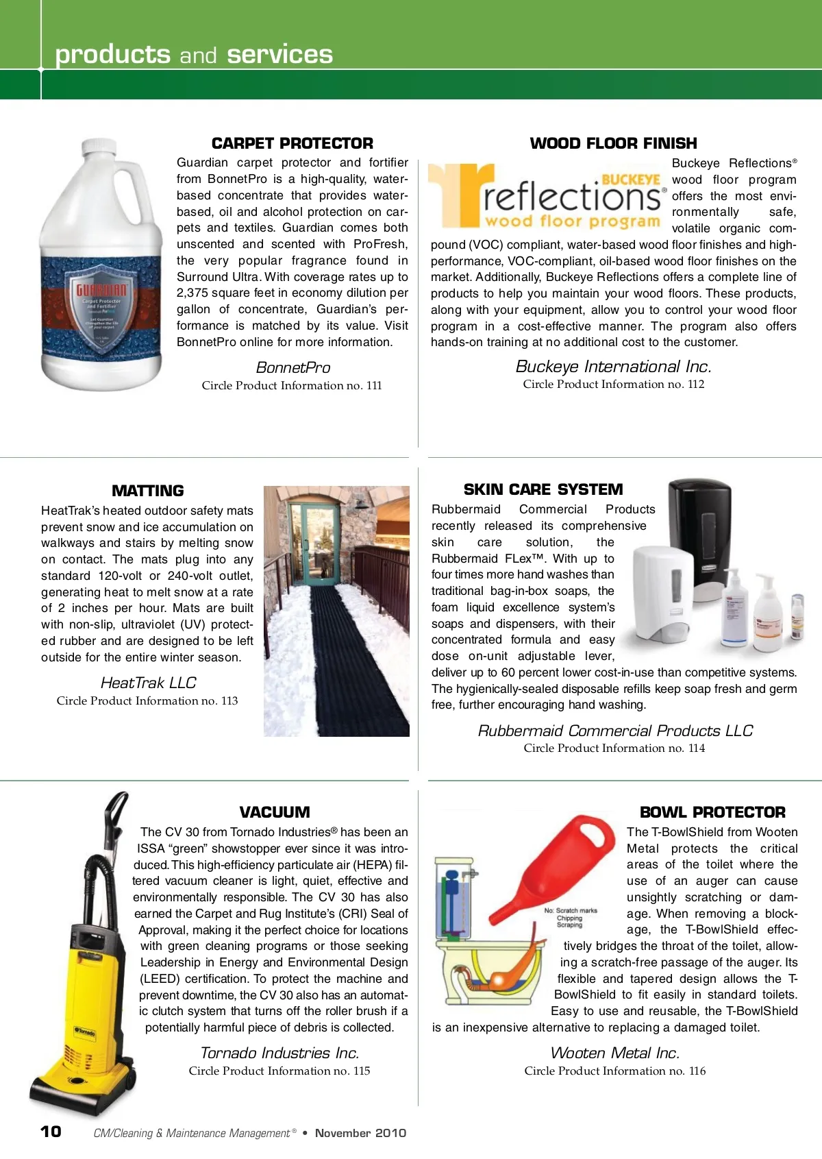 products and services CARPET PROTECTOR Guardian carpet protector and fortifier from BonnetPro is a high-quality, water-based concentrate that provides water-based, oil and alcohol protection on car-pets and textiles. Guardian comes both unscented and scented with ProFresh, the very popular fragrance found in Surround Ultra. With coverage rates up to 2,375 square feet in economy dilution per gallon of concentrate, Guardian’s per-formance is matched by its value. Visit BonnetPro online for more information. WOOD FLOOR FINISH Buckeye Reflections ® wood floor program offers the most envi-ronmentally safe, volatile organic com-pound (VOC) compliant, water-based wood floor finishes and high-performance, VOC-compliant, oil-based wood floor finishes on the market. Additionally, Buckeye Reflections offers a complete line of products to help you maintain your wood floors. These products, along with your equipment, allow you to control your wood floor program in a cost-effective manner. The program also offers hands-on training at no additional cost to the customer. BonnetPro Circle Product Information no. 111 Buckeye International Inc. Circle Product Information no. 112 MATTING HeatTrak’s heated outdoor safety mats prevent snow and ice accumulation on walkways and stairs by melting snow on contact. The mats plug into any standard 120-volt or 240-volt outlet, generating heat to melt snow at a rate of 2 inches per hour. Mats are built with non-slip, ultraviolet (UV) protect-ed rubber and are designed to be left outside for the entire winter season. SKIN CARE SYSTEM Rubbermaid Commercial Products recently released its comprehensive skin care solution, the Rubbermaid FLex™. With up to four times more hand washes than traditional bag-in-box soaps, the foam liquid excellence system’s soaps and dispensers, with their concentrated formula and easy dose on-unit adjustable lever, deliver up to 60 percent lower cost-in-use than competitive systems. The hygienically-sealed disposable refills keep soap fresh and germ free, further encouraging hand washing. HeatTrak LLC Circle Product Information no. 113 Rubbermaid Commercial Products LLC Circle Product Information no. 114 VACUUM The CV 30 from Tornado Industries ® has been an ISSA “green” showstopper ever since it was intro-duced. This high-efficiency particulate air (HEPA) fil-tered vacuum cleaner is light, quiet, effective and environmentally responsible. The CV 30 has also earned the Carpet and Rug Institute’s (CRI) Seal of Approval, making it the perfect choice for locations with green cleaning programs or those seeking Leadership in Energy and Environmental Design (LEED) certification. To protect the machine and prevent downtime, the CV 30 also has an automat-ic clutch system that turns off the roller brush if a potentially harmful piece of debris is collected. BOWL PROTECTOR The T-BowlShield from Wooten Metal protects the critical areas of the toilet where the use of an auger can cause unsightly scratching or dam-age. When removing a block-age, the T-BowlShield effec-tively bridges the throat of the toilet, allow-ing a scratch-free passage of the auger. Its flexible and tapered design allows the T-BowlShield to fit easily in standard toilets. Easy to use and reusable, the T-BowlShield is an inexpensive alternative to replacing a damaged toilet. Tornado Industries Inc. Circle Product Information no. 115 Wooten Metal Inc. Circle Product Information no. 116 10 CM/Cleaning & Maintenance Management ® • November 2010