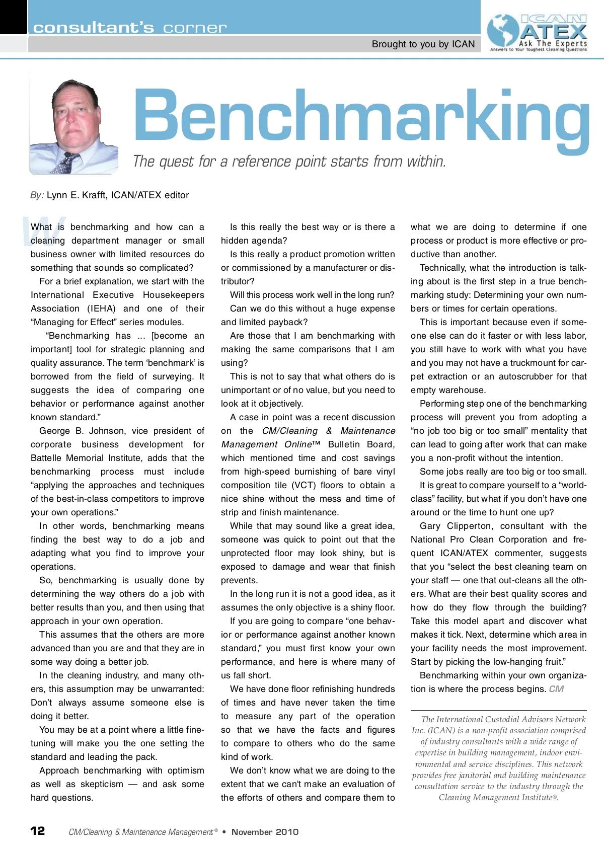 consultant’s corner Brought to you by ICAN Benchmarking The quest for a reference point starts from within. By: Lynn E. Krafft, ICAN/ATEX editor W What is benchmarking and how can a cleaning department manager or small business owner with limited resources do something that sounds so complicated? For a brief explanation, we start with the International Executive Housekeepers Association (IEHA) and one of their “Managing for Effect” series modules. “Benchmarking has ... [become an important] tool for strategic planning and quality assurance. The term ‘benchmark’ is borrowed from the field of surveying. It suggests the idea of comparing one behavior or performance against another known standard.” George B. Johnson, vice president of corporate business development for Battelle Memorial Institute, adds that the benchmarking process must include “applying the approaches and techniques of the best-in-class competitors to improve your own operations.” In other words, benchmarking means finding the best way to do a job and adapting what you find to improve your operations. So, benchmarking is usually done by determining the way others do a job with better results than you, and then using that approach in your own operation. This assumes that the others are more advanced than you are and that they are in some way doing a better job. In the cleaning industry, and many oth-ers, this assumption may be unwarranted: Don’t always assume someone else is doing it better. You may be at a point where a little fine-tuning will make you the one setting the standard and leading the pack. Approach benchmarking with optimism as well as skepticism — and ask some hard questions. Is this really the best way or is there a hidden agenda? Is this really a product promotion written or commissioned by a manufacturer or dis-tributor? Will this process work well in the long run? Can we do this without a huge expense and limited payback? Are those that I am benchmarking with making the same comparisons that I am using? This is not to say that what others do is unimportant or of no value, but you need to look at it objectively. A case in point was a recent discussion on the CM/Cleaning & Maintenance Management Online ™ Bulletin Board, which mentioned time and cost savings from high-speed burnishing of bare vinyl composition tile (VCT) floors to obtain a nice shine without the mess and time of strip and finish maintenance. While that may sound like a great idea, someone was quick to point out that the unprotected floor may look shiny, but is exposed to damage and wear that finish prevents. In the long run it is not a good idea, as it assumes the only objective is a shiny floor. If you are going to compare “one behav-ior or performance against another known standard,” you must first know your own performance, and here is where many of us fall short. We have done floor refinishing hundreds of times and have never taken the time to measure any part of the operation so that we have the facts and figures to compare to others who do the same kind of work. We don’t know what we are doing to the extent that we can't make an evaluation of the efforts of others and compare them to what we are doing to determine if one process or product is more effective or pro-ductive than another. Technically, what the introduction is talk-ing about is the first step in a true bench-marking study: Determining your own num-bers or times for certain operations. This is important because even if some-one else can do it faster or with less labor, you still have to work with what you have and you may not have a truckmount for car-pet extraction or an autoscrubber for that empty warehouse. Performing step one of the benchmarking process will prevent you from adopting a “no job too big or too small” mentality that can lead to going after work that can make you a non-profit without the intention. Some jobs really are too big or too small. It is great to compare yourself to a “world-class” facility, but what if you don’t have one around or the time to hunt one up? Gary Clipperton, consultant with the National Pro Clean Corporation and fre-quent ICAN/ATEX commenter, suggests that you “select the best cleaning team on your staff — one that out-cleans all the oth-ers. What are their best quality scores and how do they flow through the building? Take this model apart and discover what makes it tick. Next, determine which area in your facility needs the most improvement. Start by picking the low-hanging fruit.” Benchmarking within your own organiza-tion is where the process begins. CM The International Custodial Advisors Network Inc. (ICAN) is a non-profit association comprised of industry consultants with a wide range of expertise in building management, indoor envi-ronmental and service disciplines. This network provides free janitorial and building maintenance consultation service to the industry through the Cleaning Management Institute ® . 12 CM/Cleaning & Maintenance Management ® • November 2010