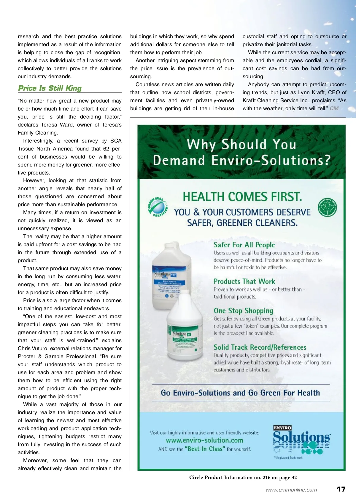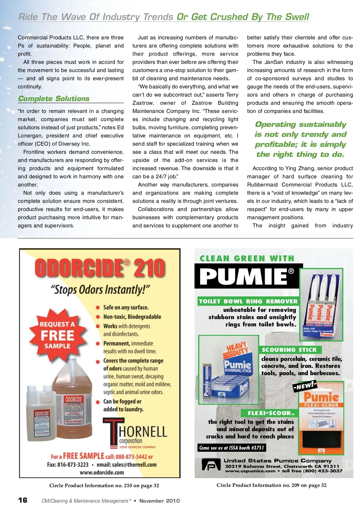 Ride The Wave Of Industry Trends Or Get Crushed By The Swell Commercial Products LLC, there are three Ps of sustainability: People, planet and profit. All three pieces must work in accord for the movement to be successful and lasting — and all signs point to its ever-present continuity. Just as increasing numbers of manufac-turers are offering complete solutions with their product offerings, more service providers than ever before are offering their customers a one-stop solution to their gam-bit of cleaning and maintenance needs. “We basically do everything, and what we can’t do we subcontract out,” asserts Terry Zastrow, owner of Zastrow Building Maintenance Company Inc. “These servic-es include changing and recycling light bulbs, moving furniture, completing preven-tative maintenance on equipment, etc. I send staff for specialized training when we see a class that will meet our needs. The upside of the add-on services is the increased revenue. The downside is that it can be a 24/7 job.” Another way manufacturers, companies and organizations are making complete solutions a reality is through joint ventures. Collaborations and partnerships allow businesses with complementary products and services to supplement one another to better satisfy their clientele and offer cus-tomers more exhaustive solutions to the problems they face. The JanSan industry is also witnessing increasing amounts of research in the form of co-sponsored surveys and studies to gauge the needs of the end-users, supervi-sors and others in charge of purchasing products and ensuring the smooth opera-tion of companies and facilities. Complete Solutions “In order to remain relevant in a changing market, companies must sell complete solutions instead of just products,” notes Ed Lonergan, president and chief executive officer (CEO) of Diversey Inc. Frontline workers demand convenience, and manufacturers are responding by offer-ing products and equipment formulated and designed to work in harmony with one another. Not only does using a manufacturer’s complete solution ensure more consistent, productive results for end-users, it makes product purchasing more intuitive for man-agers and supervisors. Operating sustainably is not only trendy and profitable; it is simply the right thing to do. According to Ying Zhang, senior product manager of hard surface cleaning for Rubbermaid Commercial Products LLC, there is a “void of knowledge” on many lev-els in our industry, which leads to a “lack of respect” for end-users by many in upper management positions. The insight gained from industry CLEAN GREEN WITH PUMIE ® TOILET BOWL RING REMOVER unbeatable for removing stubborn stains and unsightly rings from toilet bowls. SCOURING STICK cleans porcelain, ceramic tile, concrete, and iron. Restores tools, pools, and barbecues. !--NEW FLEXI -SCOUR TM the right tool to get the stains and mineral deposits out of cracks and hard to reach places Come see us at ISSA booth #3751 20219 Bahama Street, Chatsworth CA 91311 www.uspumice.com • toll free (800) 423-3037 Circle Product Information no. 210 on page 32 Circle Product Information no. 209 on page 32 16 CM/Cleaning & Maintenance Management ® • November 2010