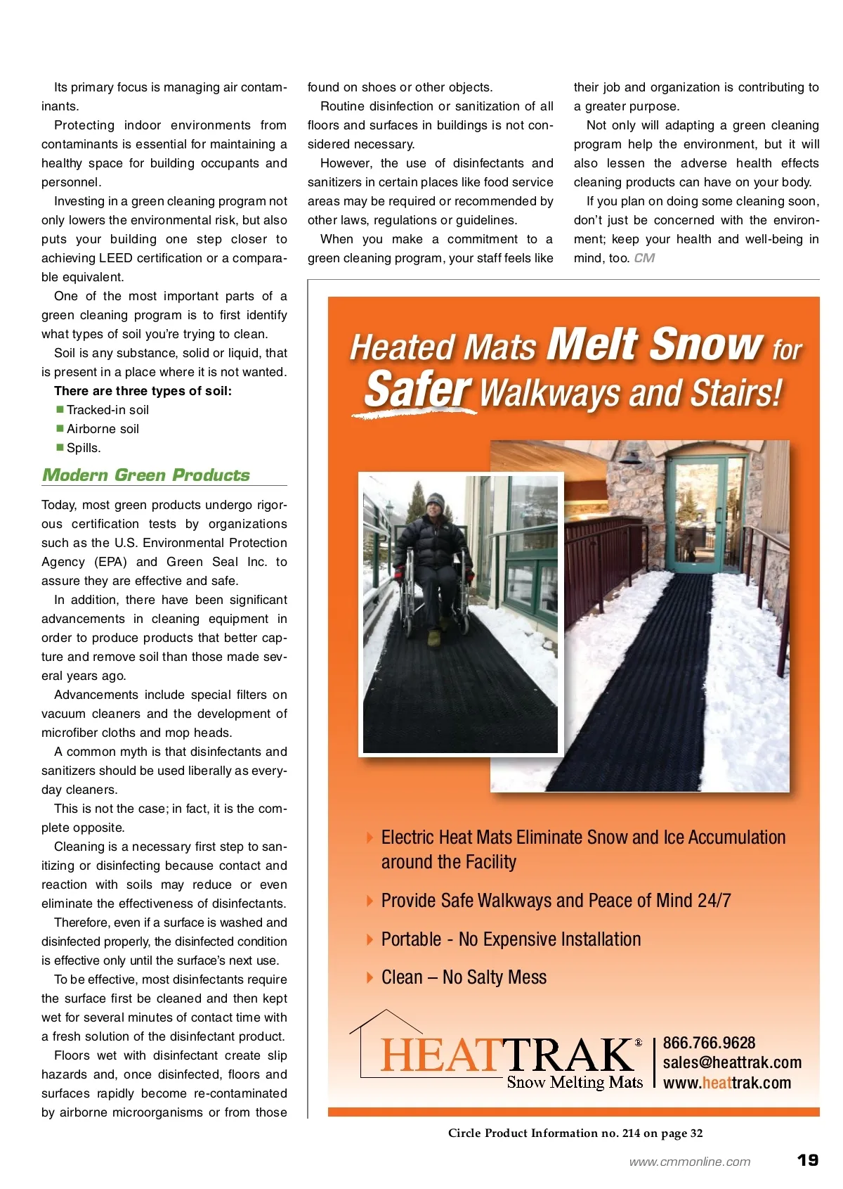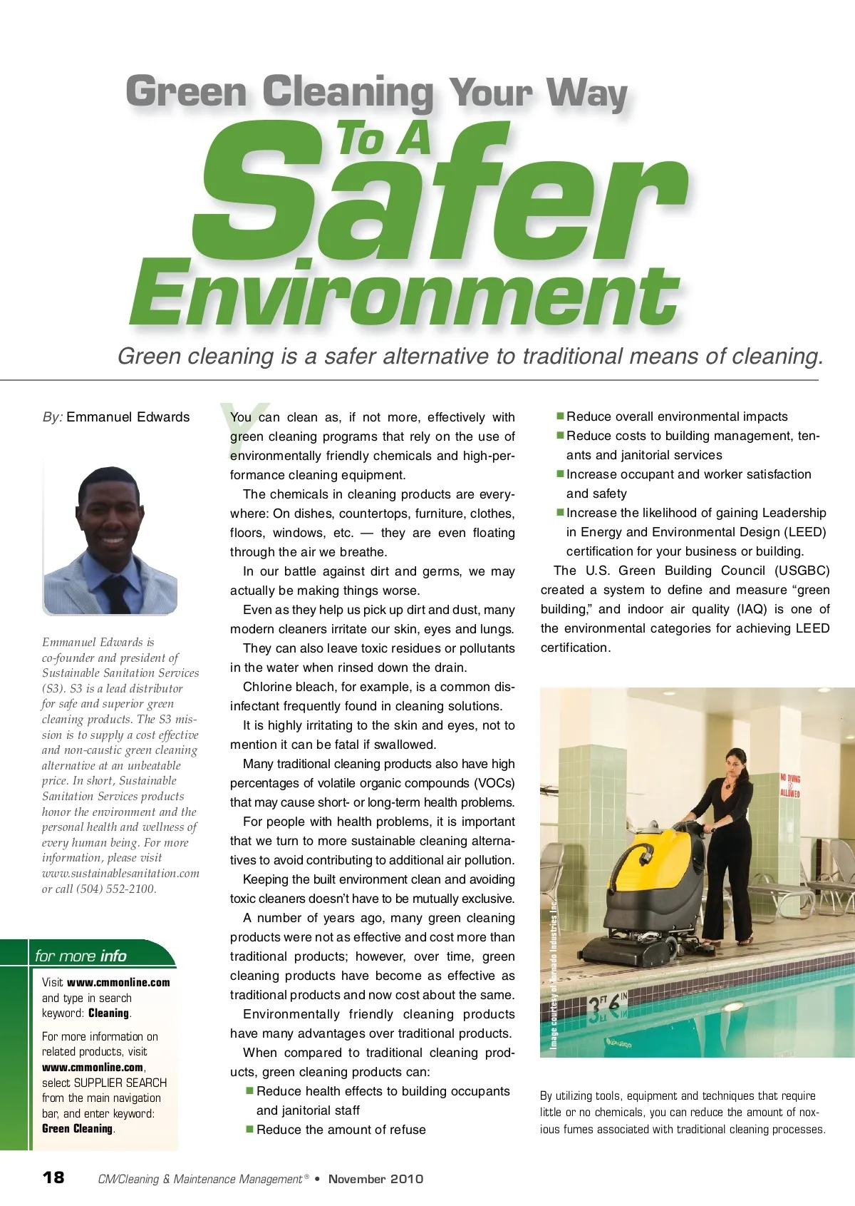 Green Cleaning Your Way Safer Environment Green cleaning is a safer alternative to traditional means of cleaning. By: Emmanuel Edwards To A Y Emmanuel Edwards is co-founder and president of Sustainable Sanitation Services (S3). S3 is a lead distributor for safe and superior green cleaning products. The S3 mis-sion is to supply a cost effective and non-caustic green cleaning alternative at an unbeatable price. In short, Sustainable Sanitation Services products honor the environment and the personal health and wellness of every human being. For more information, please visit www.sustainablesanitation.com or call (504) 552-2100. for more info Visit www.cmmonline.com and type in search keyword: Cleaning . For more information on related products, visit www.cmmonline.com , select SUPPLIER SEARCH from the main navigation bar, and enter keyword: Green Cleaning . You can clean as, if not more, effectively with green cleaning programs that rely on the use of environmentally friendly chemicals and high-per-formance cleaning equipment. The chemicals in cleaning products are every-where: On dishes, countertops, furniture, clothes, floors, windows, etc. — they are even floating through the air we breathe. In our battle against dirt and germs, we may actually be making things worse. Even as they help us pick up dirt and dust, many modern cleaners irritate our skin, eyes and lungs. They can also leave toxic residues or pollutants in the water when rinsed down the drain. Chlorine bleach, for example, is a common dis-infectant frequently found in cleaning solutions. It is highly irritating to the skin and eyes, not to mention it can be fatal if swallowed. Many traditional cleaning products also have high percentages of volatile organic compounds (VOCs) that may cause short-or long-term health problems. For people with health problems, it is important that we turn to more sustainable cleaning alterna-tives to avoid contributing to additional air pollution. Keeping the built environment clean and avoiding toxic cleaners doesn’t have to be mutually exclusive. A number of years ago, many green cleaning products were not as effective and cost more than traditional products; however, over time, green cleaning products have become as effective as traditional products and now cost about the same. Environmentally friendly cleaning products have many advantages over traditional products. When compared to traditional cleaning prod-ucts, green cleaning products can: Reduce health effects to building occupants and janitorial staff Reduce the amount of refuse Reduce overall environmental impacts Reduce costs to building management, ten-ants and janitorial services Increase occupant and worker satisfaction and safety Increase the likelihood of gaining Leadership in Energy and Environmental Design (LEED) certification for your business or building. The U.S. Green Building Council (USGBC) created a system to define and measure “green building,” and indoor air quality (IAQ) is one of the environmental categories for achieving LEED certification. By utilizing tools, equipment and techniques that require little or no chemicals, you can reduce the amount of nox-ious fumes associated with traditional cleaning processes. 18 CM/Cleaning & Maintenance Management ® • November 2010 Image courtesy of Tornado Industries Inc.