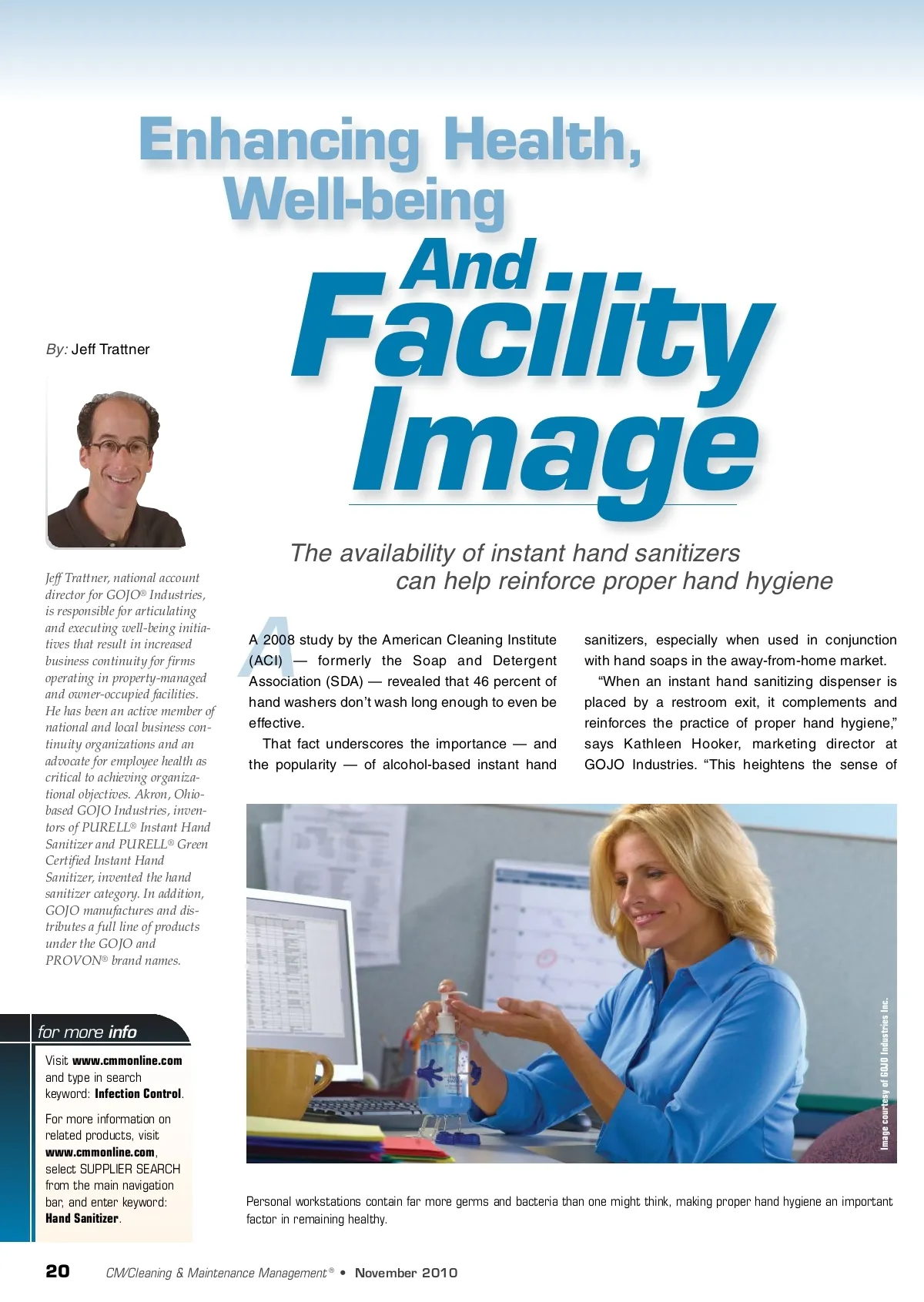 Enhancing Health, Well-being By: Jeff Trattner Facility Image The availability of instant hand sanitizers can help reinforce proper hand hygiene And Jeff Trattner, national account director for GOJO ® Industries, is responsible for articulating and executing well-being initia-tives that result in increased business continuity for firms operating in property-managed and owner-occupied facilities. He has been an active member of national and local business con-tinuity organizations and an advocate for employee health as critical to achieving organiza-tional objectives. Akron, Ohio-based GOJO Industries, inven-tors of PURELL ® Instant Hand Sanitizer and PURELL ® Green Certified Instant Hand Sanitizer, invented the hand sanitizer category. In addition, GOJO manufactures and dis-tributes a full line of products under the GOJO and PROVON ® brand names. A A 2008 study by the American Cleaning Institute (ACI) — formerly the Soap and Detergent Association (SDA) — revealed that 46 percent of hand washers don’t wash long enough to even be effective. That fact underscores the importance — and the popularity — of alcohol-based instant hand sanitizers, especially when used in conjunction with hand soaps in the away-from-home market. “When an instant hand sanitizing dispenser is placed by a restroom exit, it complements and reinforces the practice of proper hand hygiene,” says Kathleen Hooker, marketing director at GOJO Industries. “This heightens the sense of for more info Visit www.cmmonline.com and type in search keyword: Infection Control . For more information on related products, visit www.cmmonline.com , select SUPPLIER SEARCH from the main navigation bar, and enter keyword: Hand Sanitizer . Personal workstations contain far more germs and bacteria than one might think, making proper hand hygiene an important factor in remaining healthy. 20 CM/Cleaning & Maintenance Management ® • November 2010 Image courtesy of GOJO Industries Inc.