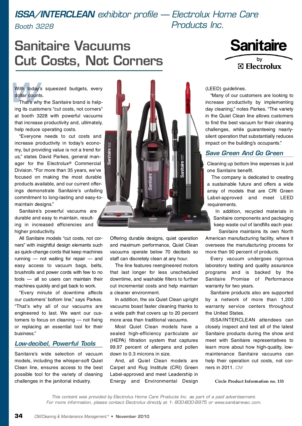 ISSA/INTERCLEAN exhibitor profile — Electrolux Home Care Products Inc. Booth 3228 Sanitaire Vacuums Cut Costs, Not Corners W With today’s squeezed budgets, every dollar counts. That’s why the Sanitaire brand is help-ing its customers “cut costs, not corners” at booth 3228 with powerful vacuums that increase productivity and, ultimately, help reduce operating costs. “Everyone needs to cut costs and increase productivity in today’s econo-my, but providing value is not a trend for us,” states David Parkes, general man-ager for the Electrolux ® Commercial Division. “For more than 35 years, we’ve focused on making the most durable products available, and our current offer-ings demonstrate Sanitaire’s unfailing commitment to long-lasting and easy-to-maintain designs.” Sanitaire’s powerful vacuums are durable and easy to maintain, result-ing in increased efficiencies and higher productivity. All Sanitaire models “cut costs, not cor-ners” with insightful design elements such as quick-change cords that keep machines running — not waiting for repair — and easy access to vacuum bags, belts, brushrolls and power cords with few to no tools — all so users can maintain their machines quickly and get back to work. “Every minute of downtime affects our customers’ bottom line,” says Parkes. “That’s why all of our vacuums are engineered to last. We want our cus-tomers to focus on cleaning — not fixing or replacing an essential tool for their business.” (LEED) guidelines. “Many of our customers are looking to increase productivity by implementing day cleaning,” notes Parkes. “The variety in the Quiet Clean line allows customers to find the best vacuum for their cleaning challenges, while guaranteeing nearly-silent operation that substantially reduces impact on the building’s occupants.” Save Green And Go Green Cleaning up bottom line expenses is just one Sanitaire benefit. The company is dedicated to creating a sustainable future and offers a wide array of models that are CRI Green Label-approved and meet LEED requirements. In addition, recycled materials in Sanitaire components and packaging keep waste out of landfills each year. Sanitaire maintains its own North American manufacturing facility, where it oversees the manufacturing process for more than 90 percent of products. Every vacuum undergoes rigorous laboratory testing and quality assurance programs and is backed by the Sanitaire Promise of Performance warranty for two years. Sanitaire products also are supported by a network of more than 1,200 warranty service centers throughout the United States. ISSA/INTERCLEAN attendees can closely inspect and test all of the latest Sanitaire products during the show and meet with Sanitaire representatives to learn more about how high-quality, low-maintenance Sanitaire vacuums can help their operation cut costs, not cor-ners in 2011. CM Circle Product Information no. 153 Low-decibel, Powerful Tools Sanitaire’s wide selection of vacuum models, including the whisper-soft Quiet Clean line, ensures access to the best possible tool for the variety of cleaning challenges in the janitorial industry. Offering durable designs, quiet operation and maximum performance, Quiet Clean vacuums operate below 70 decibels so staff can discretely clean at any hour. The line features reengineered motors that last longer for less unscheduled downtime, and washable filters to further cut incremental costs and help maintain a cleaner environment. In addition, the six Quiet Clean upright vacuums boast faster cleaning thanks to a wide path that covers up to 20 percent more area than traditional vacuums. Most Quiet Clean models have a sealed high-efficiency particulate air (HEPA) filtration system that captures 99.97 percent of allergens and pollen down to 0.3 microns in size. And, all Quiet Clean models are Carpet and Rug Institute (CRI) Green Label-approved and meet Leadership in Energy and Environmental Design This content was provided by Electrolux Home Care Products Inc. as part of a paid advertisement. For more information, please contact Electrolux directly at 1-800-800-8975 or www.sanitairevac.com. 34 CM/Cleaning & Maintenance Management ® • November 2010