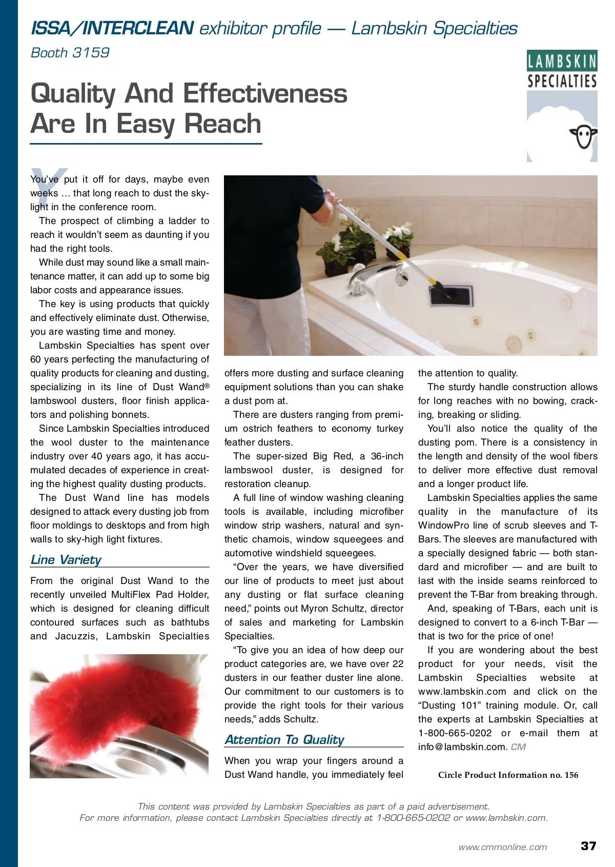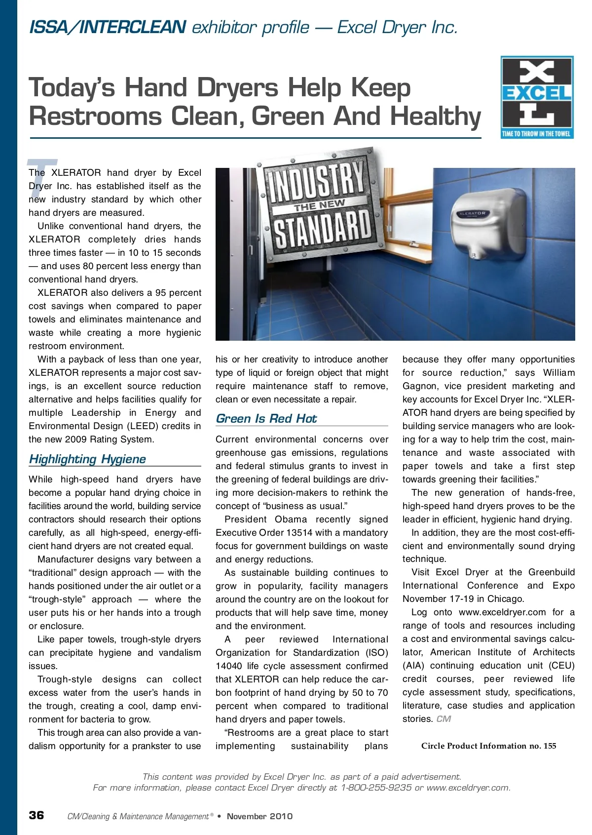 ISSA/INTERCLEAN exhibitor profile — Excel Dryer Inc. Today’s Hand Dryers Help Keep Restrooms Clean, Green And Healthy T The XLERATOR hand dryer by Excel Dryer Inc. has established itself as the new industry standard by which other hand dryers are measured. Unlike conventional hand dryers, the XLERATOR completely dries hands three times faster — in 10 to 15 seconds — and uses 80 percent less energy than conventional hand dryers. XLERATOR also delivers a 95 percent cost savings when compared to paper towels and eliminates maintenance and waste while creating a more hygienic restroom environment. With a payback of less than one year, XLERATOR represents a major cost sav-ings, is an excellent source reduction alternative and helps facilities qualify for multiple Leadership in Energy and Environmental Design (LEED) credits in the new 2009 Rating System. his or her creativity to introduce another type of liquid or foreign object that might require maintenance staff to remove, clean or even necessitate a repair. Green Is Red Hot Current environmental concerns over greenhouse gas emissions, regulations and federal stimulus grants to invest in the greening of federal buildings are driv-ing more decision-makers to rethink the concept of “business as usual.” President Obama recently signed Executive Order 13514 with a mandatory focus for government buildings on waste and energy reductions. As sustainable building continues to grow in popularity, facility managers around the country are on the lookout for products that will help save time, money and the environment. A peer reviewed International Organization for Standardization (ISO) 14040 life cycle assessment confirmed that XLERTOR can help reduce the car-bon footprint of hand drying by 50 to 70 percent when compared to traditional hand dryers and paper towels. “Restrooms are a great place to start implementing sustainability plans Highlighting Hygiene While high-speed hand dryers have become a popular hand drying choice in facilities around the world, building service contractors should research their options carefully, as all high-speed, energy-effi-cient hand dryers are not created equal. Manufacturer designs vary between a “traditional” design approach — with the hands positioned under the air outlet or a “trough-style” approach — where the user puts his or her hands into a trough or enclosure. Like paper towels, trough-style dryers can precipitate hygiene and vandalism issues. Trough-style designs can collect excess water from the user’s hands in the trough, creating a cool, damp envi-ronment for bacteria to grow. This trough area can also provide a van-dalism opportunity for a prankster to use because they offer many opportunities for source reduction,” says William Gagnon, vice president marketing and key accounts for Excel Dryer Inc. “XLER-ATOR hand dryers are being specified by building service managers who are look-ing for a way to help trim the cost, main-tenance and waste associated with paper towels and take a first step towards greening their facilities.” The new generation of hands-free, high-speed hand dryers proves to be the leader in efficient, hygienic hand drying. In addition, they are the most cost-effi-cient and environmentally sound drying technique. Visit Excel Dryer at the Greenbuild International Conference and Expo November 17-19 in Chicago. Log onto www.exceldryer.com for a range of tools and resources including a cost and environmental savings calcu-lator, American Institute of Architects (AIA) continuing education unit (CEU) credit courses, peer reviewed life cycle assessment study, specifications, literature, case studies and application stories. CM Circle Product Information no. 155 This content was provided by Excel Dryer Inc. as part of a paid advertisement. For more information, please contact Excel Dryer directly at 1-800-255-9235 or www.exceldryer.com. 36 CM/Cleaning & Maintenance Management ® • November 2010