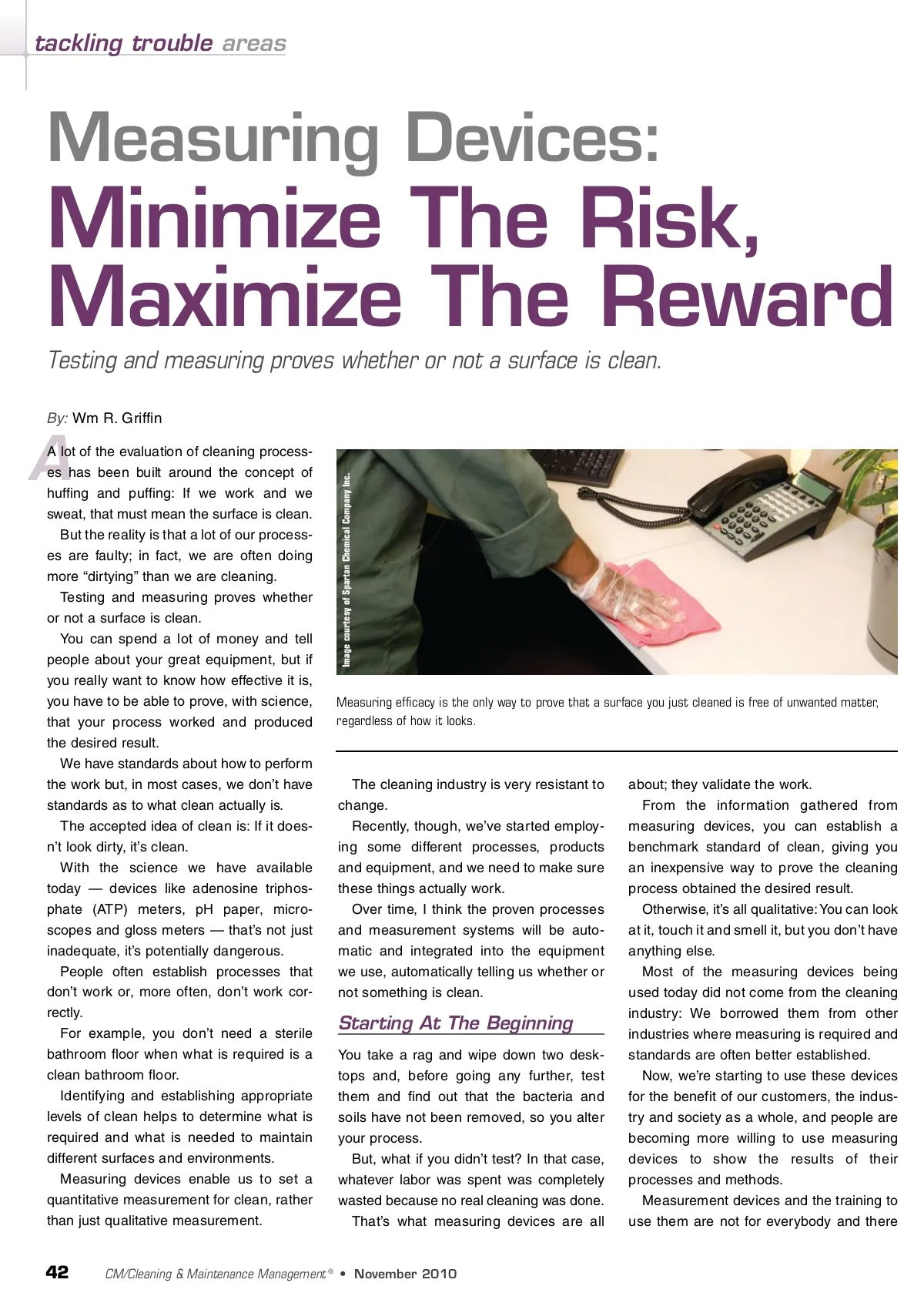 tackling trouble areas Measuring Devices: Minimize The Risk, Maximize The Reward Testing and measuring proves whether or not a surface is clean. By: Wm R. Griffin Image courtesy of Spartan Chemical Company Inc. A A lot of the evaluation of cleaning process-es has been built around the concept of huffing and puffing: If we work and we sweat, that must mean the surface is clean. But the reality is that a lot of our process-es are faulty; in fact, we are often doing more “dirtying” than we are cleaning. Testing and measuring proves whether or not a surface is clean. You can spend a lot of money and tell people about your great equipment, but if you really want to know how effective it is, you have to be able to prove, with science, that your process worked and produced the desired result. We have standards about how to perform the work but, in most cases, we don’t have standards as to what clean actually is. The accepted idea of clean is: If it does-n’t look dirty, it’s clean. With the science we have available today — devices like adenosine triphos-phate (ATP) meters, pH paper, micro-scopes and gloss meters — that’s not just inadequate, it’s potentially dangerous. People often establish processes that don’t work or, more often, don’t work cor-rectly. For example, you don’t need a sterile bathroom floor when what is required is a clean bathroom floor. Identifying and establishing appropriate levels of clean helps to determine what is required and what is needed to maintain different surfaces and environments. Measuring devices enable us to set a quantitative measurement for clean, rather than just qualitative measurement. Measuring efficacy is the only way to prove that a surface you just cleaned is free of unwanted matter, regardless of how it looks. The cleaning industry is very resistant to change. Recently, though, we’ve started employ-ing some different processes, products and equipment, and we need to make sure these things actually work. Over time, I think the proven processes and measurement systems will be auto-matic and integrated into the equipment we use, automatically telling us whether or not something is clean. Starting At The Beginning You take a rag and wipe down two desk-tops and, before going any further, test them and find out that the bacteria and soils have not been removed, so you alter your process. But, what if you didn’t test? In that case, whatever labor was spent was completely wasted because no real cleaning was done. That’s what measuring devices are all about; they validate the work. From the information gathered from measuring devices, you can establish a benchmark standard of clean, giving you an inexpensive way to prove the cleaning process obtained the desired result. Otherwise, it’s all qualitative: You can look at it, touch it and smell it, but you don’t have anything else. Most of the measuring devices being used today did not come from the cleaning industry: We borrowed them from other industries where measuring is required and standards are often better established. Now, we’re starting to use these devices for the benefit of our customers, the indus-try and society as a whole, and people are becoming more willing to use measuring devices to show the results of their processes and methods. Measurement devices and the training to use them are not for everybody and there 42 CM/Cleaning & Maintenance Management ® • November 2010