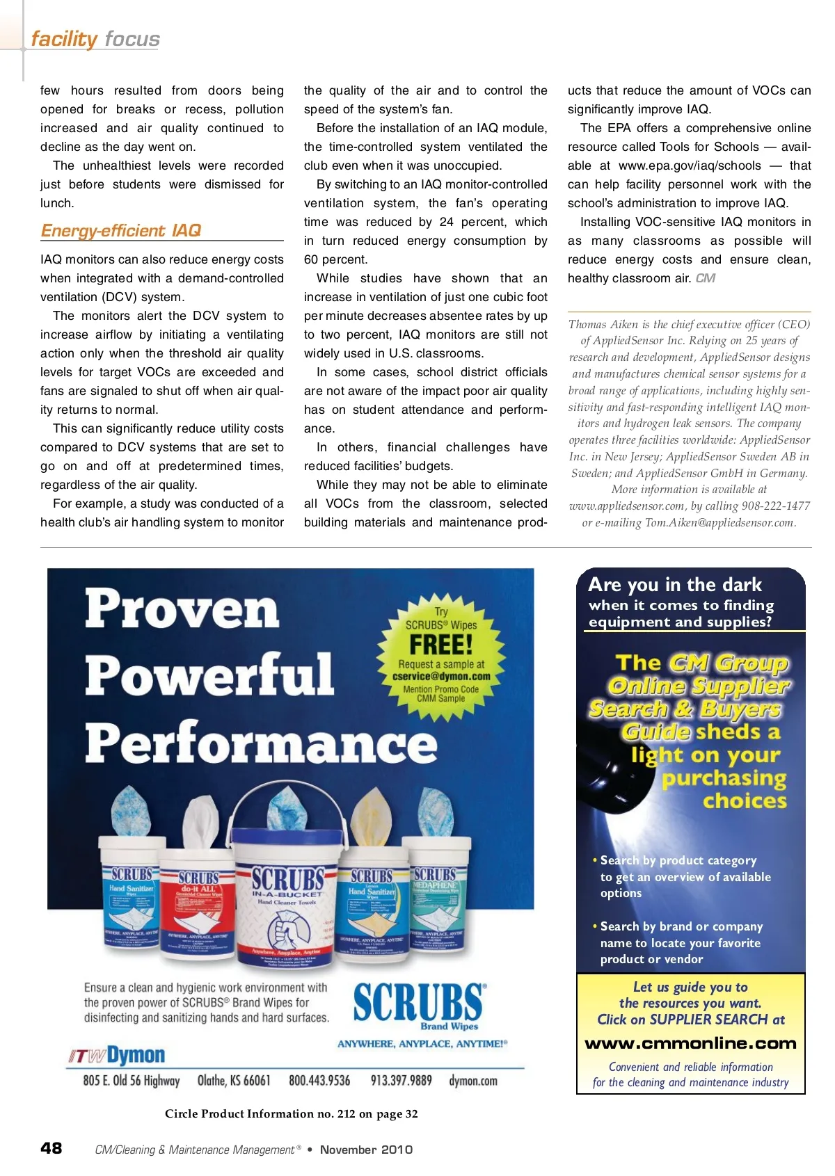 facility focus few hours resulted from doors being opened for breaks or recess, pollution increased and air quality continued to decline as the day went on. The unhealthiest levels were recorded just before students were dismissed for lunch. the quality of the air and to control the speed of the system’s fan. Before the installation of an IAQ module, the time-controlled system ventilated the club even when it was unoccupied. By switching to an IAQ monitor-controlled ventilation system, the fan’s operating time was reduced by 24 percent, which in turn reduced energy consumption by 60 percent. While studies have shown that an increase in ventilation of just one cubic foot per minute decreases absentee rates by up to two percent, IAQ monitors are still not widely used in U.S. classrooms. In some cases, school district officials are not aware of the impact poor air quality has on student attendance and perform-ance. In others, financial challenges have reduced facilities’ budgets. While they may not be able to eliminate all VOCs from the classroom, selected building materials and maintenance prod-ucts that reduce the amount of VOCs can significantly improve IAQ. The EPA offers a comprehensive online resource called Tools for Schools — avail-able at www.epa.gov/iaq/schools — that can help facility personnel work with the school’s administration to improve IAQ. Installing VOC-sensitive IAQ monitors in as many classrooms as possible will reduce energy costs and ensure clean, healthy classroom air. CM Energy-efficient IAQ IAQ monitors can also reduce energy costs when integrated with a demand-controlled ventilation (DCV) system. The monitors alert the DCV system to increase airflow by initiating a ventilating action only when the threshold air quality levels for target VOCs are exceeded and fans are signaled to shut off when air qual-ity returns to normal. This can significantly reduce utility costs compared to DCV systems that are set to go on and off at predetermined times, regardless of the air quality. For example, a study was conducted of a health club’s air handling system to monitor Thomas Aiken is the chief executive officer (CEO) of AppliedSensor Inc. Relying on 25 years of research and development, AppliedSensor designs and manufactures chemical sensor systems for a broad range of applications, including highly sen-sitivity and fast-responding intelligent IAQ mon-itors and hydrogen leak sensors. The company operates three facilities worldwide: AppliedSensor Inc. in New Jersey; AppliedSensor Sweden AB in Sweden; and AppliedSensor GmbH in Germany. More information is available at www.appliedsensor.com, by calling 908-222-1477 or e-mailing [email protected]. Are you in the dark when it comes to finding equipment and supplies? • Search by product category to get an overview of available options • Search by brand or company name to locate your favorite product or vendor Let us guide you to the resources you want. Click on SUPPLIER SEARCH at www.cmmonline.com Convenient and reliable information for the cleaning and maintenance industry Circle Product Information no. 212 on page 32 48 CM/Cleaning & Maintenance Management ® • November 2010