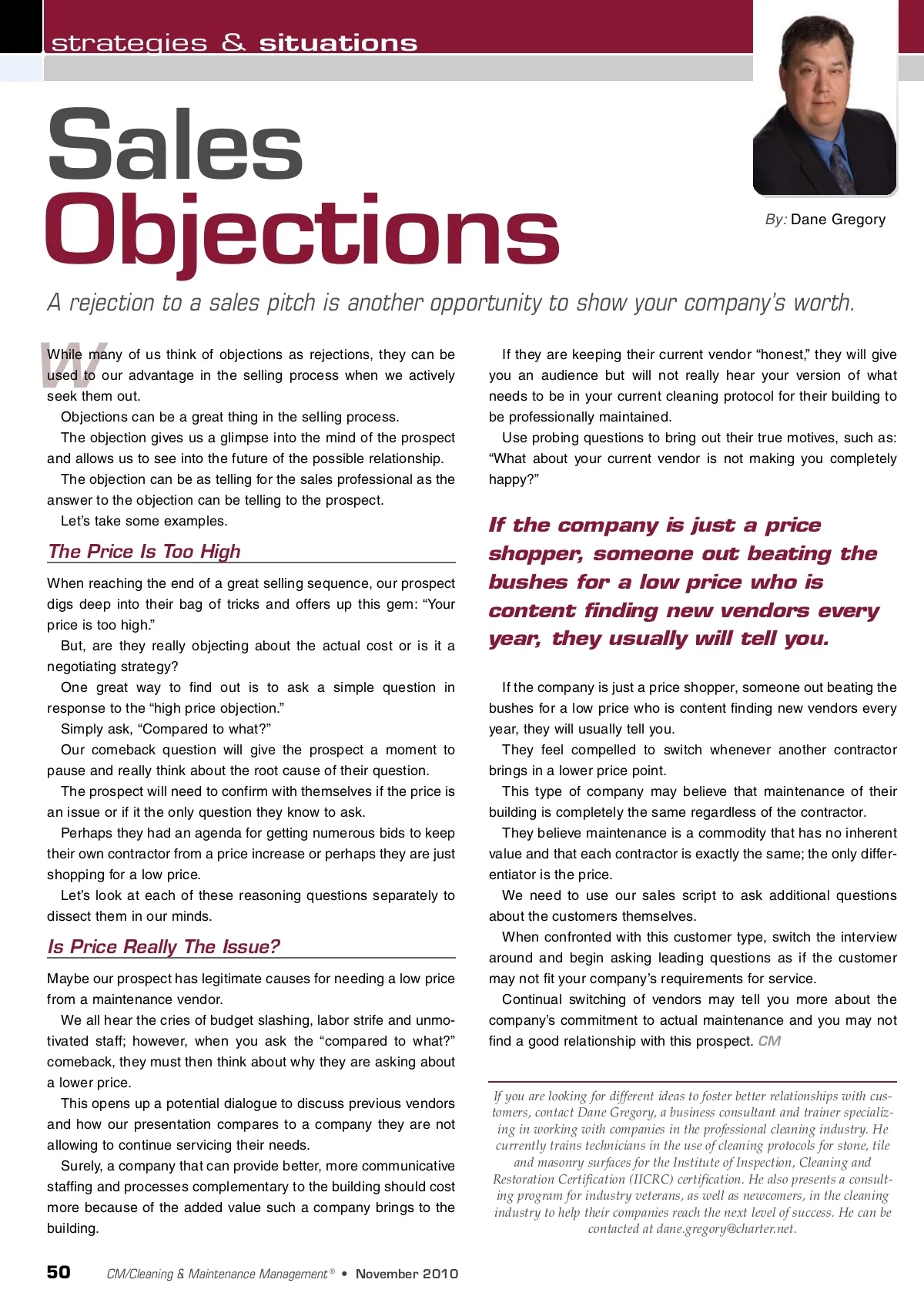 strategies & situations Sales Objections W While many of us think of objections as rejections, they can be used to our advantage in the selling process when we actively seek them out. Objections can be a great thing in the selling process. The objection gives us a glimpse into the mind of the prospect and allows us to see into the future of the possible relationship. The objection can be as telling for the sales professional as the answer to the objection can be telling to the prospect. Let’s take some examples. By: Dane Gregory A rejection to a sales pitch is another opportunity to show your company’s worth. If they are keeping their current vendor “honest,” they will give you an audience but will not really hear your version of what needs to be in your current cleaning protocol for their building to be professionally maintained. Use probing questions to bring out their true motives, such as: “What about your current vendor is not making you completely happy?” The Price Is Too High When reaching the end of a great selling sequence, our prospect digs deep into their bag of tricks and offers up this gem: “Your price is too high.” But, are they really objecting about the actual cost or is it a negotiating strategy? One great way to find out is to ask a simple question in response to the “high price objection.” Simply ask, “Compared to what?” Our comeback question will give the prospect a moment to pause and really think about the root cause of their question. The prospect will need to confirm with themselves if the price is an issue or if it the only question they know to ask. Perhaps they had an agenda for getting numerous bids to keep their own contractor from a price increase or perhaps they are just shopping for a low price. Let’s look at each of these reasoning questions separately to dissect them in our minds. If the company is just a price shopper, someone out beating the bushes for a low price who is content finding new vendors every year, they usually will tell you. If the company is just a price shopper, someone out beating the bushes for a low price who is content finding new vendors every year, they will usually tell you. They feel compelled to switch whenever another contractor brings in a lower price point. This type of company may believe that maintenance of their building is completely the same regardless of the contractor. They believe maintenance is a commodity that has no inherent value and that each contractor is exactly the same; the only differ-entiator is the price. We need to use our sales script to ask additional questions about the customers themselves. When confronted with this customer type, switch the interview around and begin asking leading questions as if the customer may not fit your company’s requirements for service. Continual switching of vendors may tell you more about the company’s commitment to actual maintenance and you may not find a good relationship with this prospect. CM Is Price Really The Issue? Maybe our prospect has legitimate causes for needing a low price from a maintenance vendor. We all hear the cries of budget slashing, labor strife and unmo-tivated staff; however, when you ask the “compared to what?” comeback, they must then think about why they are asking about a lower price. This opens up a potential dialogue to discuss previous vendors and how our presentation compares to a company they are not allowing to continue servicing their needs. Surely, a company that can provide better, more communicative staffing and processes complementary to the building should cost more because of the added value such a company brings to the building. If you are looking for different ideas to foster better relationships with cus-tomers, contact Dane Gregory, a business consultant and trainer specializ-ing in working with companies in the professional cleaning industry. He currently trains technicians in the use of cleaning protocols for stone, tile and masonry surfaces for the Institute of Inspection, Cleaning and Restoration Certification (IICRC) certification. He also presents a consult-ing program for industry veterans, as well as newcomers, in the cleaning industry to help their companies reach the next level of success. He can be contacted at [email protected]. 50 CM/Cleaning & Maintenance Management ® • November 2010