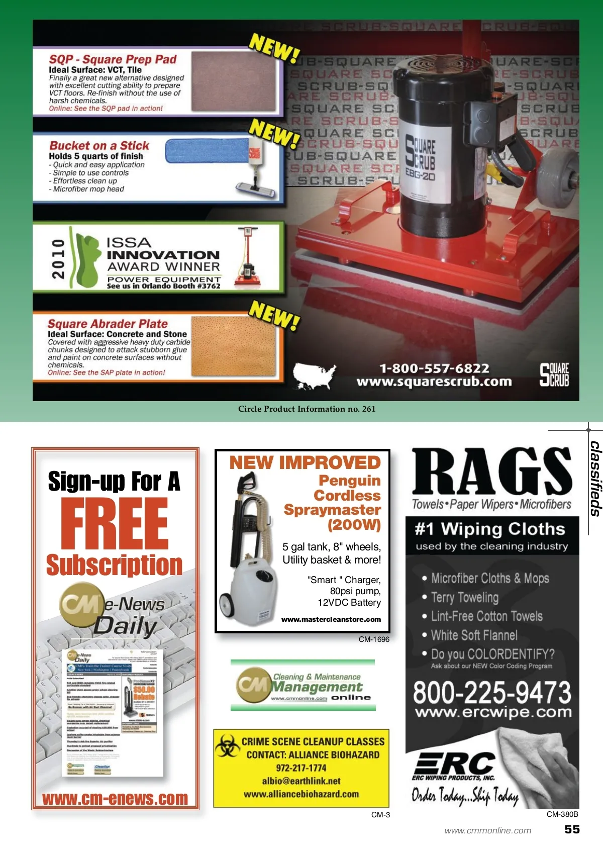 marketplace Get It Clean … with Surround Ultra & Surround Free, the most advanced encaps you can buy! Keep It Clean … with Guardian Carpet Protector & Fortifi er Scented with ProFresh or unscented. The best smelling, highest performance encap on the market. High coverage rates = an excellent value. A high-quality, high-performance carpet life-extending product. Just one gallon of our totally odorless super-concentrate is like getting 2–3 gallons of our competitors’ products. When image and reputation are important to you, choose Guardian. Surround… the Best Value in Encapsulation 877-477-1615 | 215-723-5330 | www.bonnetpro.com Circle Product Information no. 260 STATEMENT OF OWNERSHIP, MANAGEMENT AND CIRCULATION Title: CM/Cleaning & Maintenance Management Pub. No.: 1051-5720 File Date: 9/30/2010 Frequency of Issue: 4VU[OS` No. of issues published annually:  Annual Subscription Price: �b;e;b; Office Address: 19 British American Blvd. West, Latham, NY 12110 Publisher: Matt Gallinger 19 British American Blvd. West, Latham, NY 12110 Editor: Rich DiPaolo 19 British American Blvd. West, Latham, NY 12110 Owner: EBSCO Industries 5724 Hwy 280E Birmingham, AL 35242 Known bondholders, mortgagees and other security holders owning or holding 1% or more of total amount of bonds, mortgages or other securities. �f;0M [OLYL HYL UVUL ZV Z[H[L NONE 0ZZ\L +H[L MVY *PYJ\SH[PVU +H[H )LSV^! :LW[LTILY  ,_[LU[ HUK 5H[\YL VM *PYJ\SH[PVU ;V[HS 5\TILY VM *VWPLZ 7HPK VY 9LX\LZ[LK *PYJ\SH[PVU 6\[ZPKL *V\U[` 4HPS :\IZJYPW[PVUZ 0U*V\U[` 4HPS :\IZJYPW[PVUZ :HSLZ ;OYV\NO +LHSLYZ HUK *HYYPLYZ :[YLL[ =LUKVYZ *V\U[LY :HSLZ HUK 6[OLY 7HPK VY 9LX\LZ[LK +PZ[YPI\[PVU 6\[ZPKL <:7: 9LX\LZ[LK *VWPLZ +PZ[YPI\[LK I` 6[OLY 4HPS *SHZZLZ ;OYV\NO [OL <:7: ;V[HS 7HPK VY 9LX\LZ[LK *PYJ\SH[PVU 5VUYLX\LZ[LK +PZ[YPI\[PVU 6\[ZPKL *V\U[` 5VUYLX\LZ[LK *VWPLZ 0U*V\U[` 5VUYLX\LZ[LK *VWPLZ 5VUYLX\LZ[LK *VWPLZ +PZ[YPI\[LK ;OYV\NO [OL <:7: I` 6[OLY *SHZZLZ VM 4HPS 5VUYLX\LZ[LK *VWPLZ +PZ[Y\I\[LK 6\[ZPKL [OL 4HPS ;V[HS 5VUYLX\LZ[LK +PZ[YPI\[PVU ;V[HS +PZ[YPI\[PVU *VWPLZ 5V[ +PZ[YPI\[LK ;V[HS �c; 7HPK HUKVY 9LX\LZ[LK *PYJ\SH[PVU (]N 7YPU[ a; f; e; d;b;  a;  e; f;e;     a;b;  c;b;  f;a;d; e; a; f; c;�c; (]N +PNP[HS b; a;a;   b; a;a;  b; a;a;      b; a;a;  b; a;a; �c; :LW[  7YPU[  f;f;f; e; b;e;  f;  e; d;d;  e;a;f;   a;c;  c;a;  e;a; e;c;  f;f;f; a;�c; :LW[  +PNP[HS b; b;   b; b;  b; b;      b; b;  b; b; �c; Circle Product Information no. 262 54 CM/Cleaning & Maintenance Management ® • November 2010