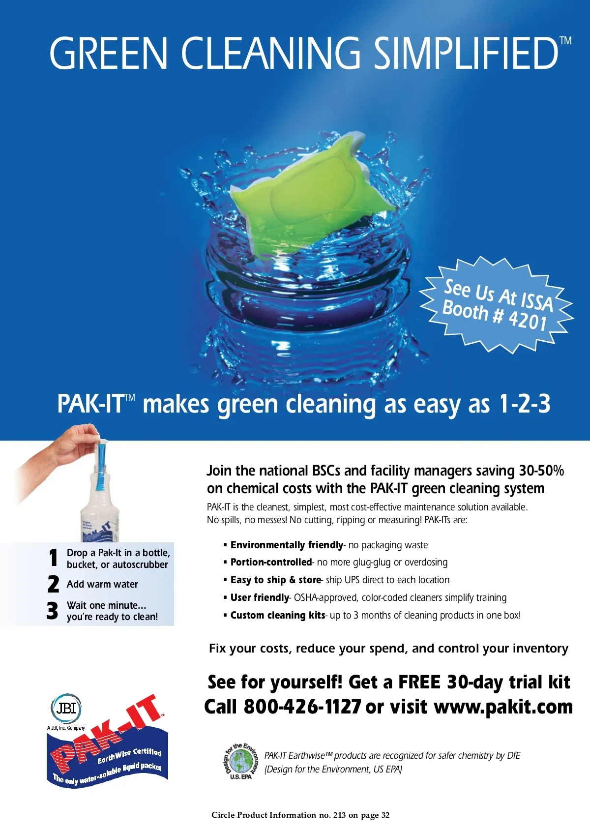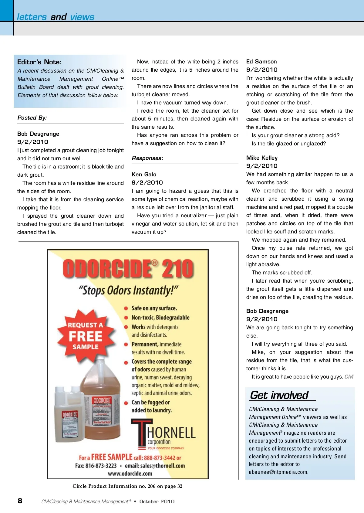 letters and views Editor’s Note: A recent discussion on the CM/Cleaning & Maintenance Management Online™ Bulletin Board dealt with grout cleaning. Elements of that discussion follow below. Posted By: Bob Desgrange 9/2/2010 I just completed a grout cleaning job tonight and it did not turn out well. The tile is in a restroom; it is black tile and dark grout. The room has a white residue line around the sides of the room. I take that it is from the cleaning service mopping the floor. I sprayed the grout cleaner down and brushed the grout and tile and then turbojet cleaned the tile. Now, instead of the white being 2 inches around the edges, it is 5 inches around the room. There are now lines and circles where the turbojet cleaner moved. I have the vacuum turned way down. I redid the room, let the cleaner set for about 5 minutes, then cleaned again with the same results. Has anyone ran across this problem or have a suggestion on how to clean it? Responses: Ken Galo 9/2/2010 I am going to hazard a guess that this is some type of chemical reaction, maybe with a residue left over from the janitorial staff. Have you tried a neutralizer — just plain vinegar and water solution, let sit and then vacuum it up? Ed Samson 9/2/2010 I’m wondering whether the white is actually a residue on the surface of the tile or an etching or scratching of the tile from the grout cleaner or the brush. Get down close and see which is the case: Residue on the surface or erosion of the surface. Is your grout cleaner a strong acid? Is the tile glazed or unglazed? Mike Kelley 9/2/2010 We had something similar happen to us a few months back. We drenched the floor with a neutral cleaner and scrubbed it using a swing machine and a red pad, mopped it a couple of times and, when it dried, there were patches and circles on top of the tile that looked like scuff and scratch marks. We mopped again and they remained. Once my pulse rate returned, we got down on our hands and knees and used a light abrasive. The marks scrubbed off. I later read that when you’re scrubbing, the grout itself gets a little dispersed and dries on top of the tile, creating the residue. Bob Desgrange 9/2/2010 We are going back tonight to try something else. I will try everything all three of you said. Mike, on your suggestion about the residue from the tile, that is what the cus-tomer thinks it is. It is great to have people like you guys. CM Get involved CM/Cleaning & Maintenance Management Online ™ viewers as well as CM/Cleaning & Maintenance Management ® magazine readers are encouraged to submit letters to the editor on topics of interest to the professional cleaning and maintenance industry. Send letters to the editor to [email protected]. Circle Product Information no. 206 on page 32 8 CM/Cleaning & Maintenance Management ® • October 2010