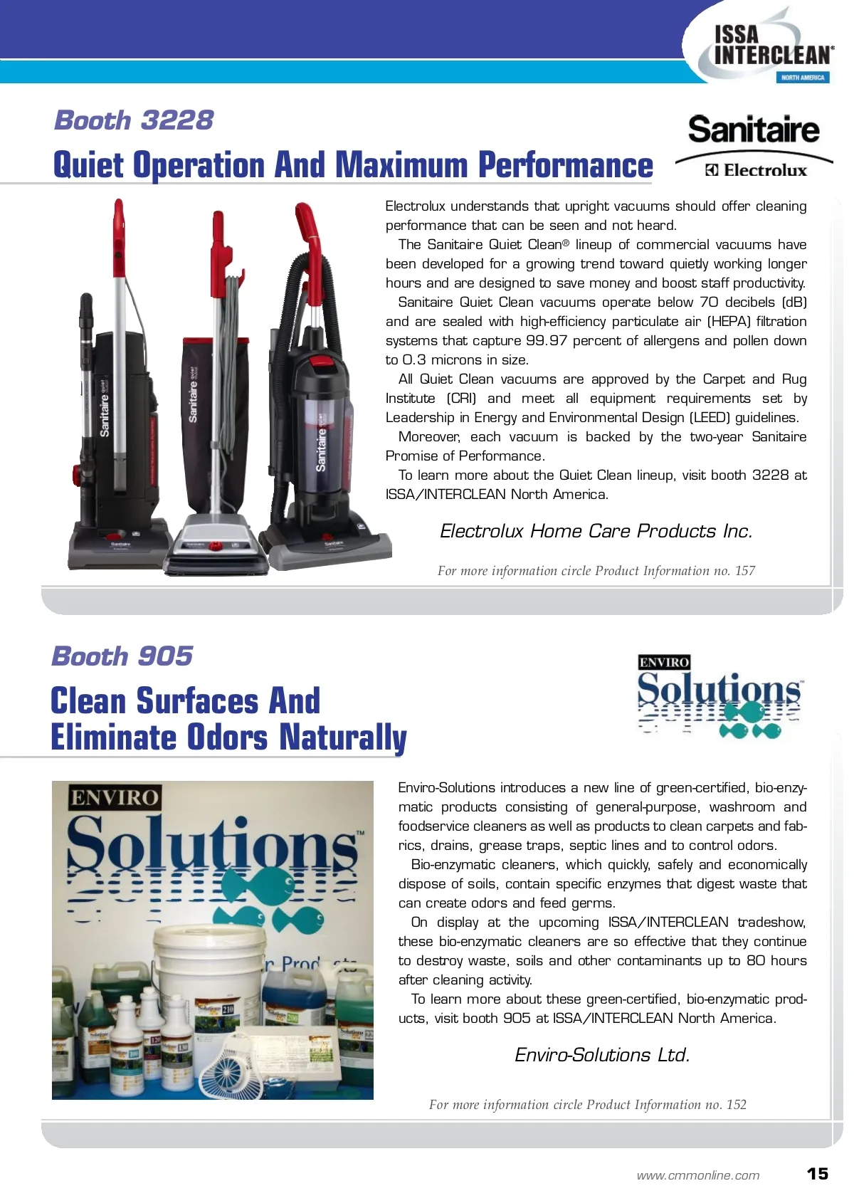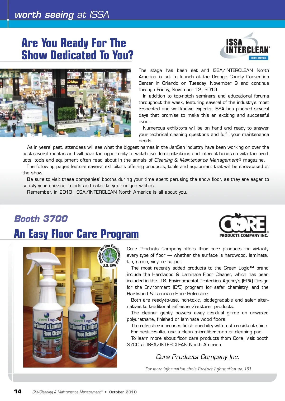worth seeing at ISSA Are You Ready For The Show Dedicated To You? The stage has been set and ISSA/INTERCLEAN North America is set to launch at the Orange County Convention Center in Orlando on Tuesday, November 9 and continue through Friday, November 12, 2010. In addition to top-notch seminars and educational forums throughout the week, featuring several of the industry’s most respected and well-known experts, ISSA has planned several days that promise to make this an exciting and successful event. Numerous exhibitors will be on hand and ready to answer your technical cleaning questions and fulfill your maintenance needs. As in years’ past, attendees will see what the biggest names in the JanSan industry have been working on over the past several months and will have the opportunity to watch live demonstrations and interact hands-on with the prod-ucts, tools and equipment often read about in the annals of Cleaning & Maintenance Management ® magazine. The following pages feature several exhibitors offering products, tools and equipment that will be showcased at the show. Be sure to visit these companies’ booths during your time spent perusing the show floor, as they are eager to satisfy your quizzical minds and cater to your unique wishes. Remember, in 2010, ISSA/INTERCLEAN North America is all about you. Booth 3700 An Easy Floor Care Program Core Products Company offers floor care products for virtually every type of floor — whether the surface is hardwood, laminate, tile, stone, vinyl or carpet. The most recently added products to the Green Logic™ brand include the Hardwood & Laminate Floor Cleaner, which has been included in the U.S. Environmental Protection Agency’s (EPA) Design for the Environment (DfE) program for safer chemistry, and the Hardwood & Laminate Floor Refresher. Both are ready-to-use, non-toxic, biodegradable and safer alter-natives to traditional refresher/restorer products. The cleaner gently powers away residual grime on unwaxed polyurethane, finished or laminate wood floors. The refresher increases finish durability with a slip-resistant shine. For best results, use a clean microfiber mop or cleaning pad. To learn more about floor care products from Core, visit booth 3700 at ISSA/INTERCLEAN North America. Core Products Company Inc. For more information circle Product Information no. 151 14 CM/Cleaning & Maintenance Management ® • October 2010