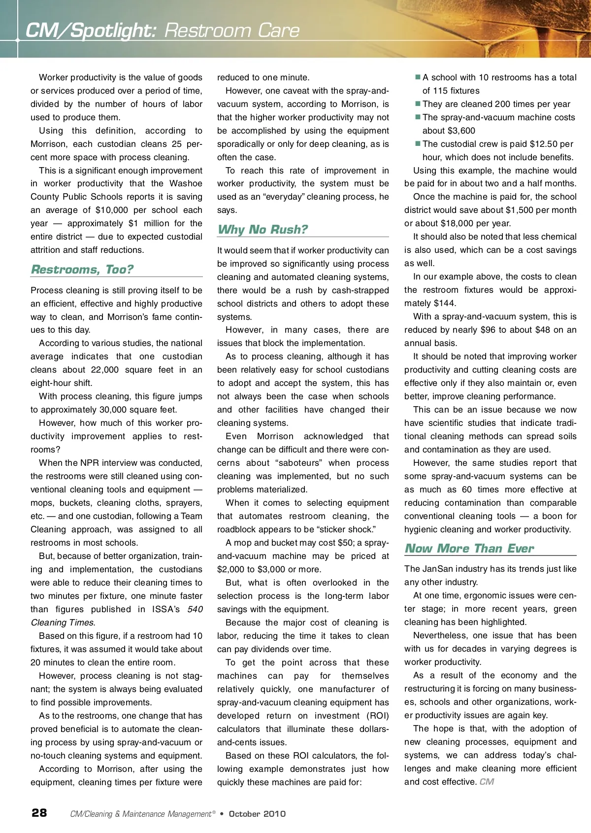 CM/Spotlight: Restroom Care Worker productivity is the value of goods or services produced over a period of time, divided by the number of hours of labor used to produce them. Using this definition, according to Morrison, each custodian cleans 25 per-cent more space with process cleaning. This is a significant enough improvement in worker productivity that the Washoe County Public Schools reports it is saving an average of $10,000 per school each year — approximately $1 million for the entire district — due to expected custodial attrition and staff reductions. reduced to one minute. However, one caveat with the spray-and-vacuum system, according to Morrison, is that the higher worker productivity may not be accomplished by using the equipment sporadically or only for deep cleaning, as is often the case. To reach this rate of improvement in worker productivity, the system must be used as an “everyday” cleaning process, he says. A school with 10 restrooms has a total of 115 fixtures They are cleaned 200 times per year The spray-and-vacuum machine costs about $3,600 The custodial crew is paid $12.50 per hour, which does not include benefits. Using this example, the machine would be paid for in about two and a half months. Once the machine is paid for, the school district would save about $1,500 per month or about $18,000 per year. It should also be noted that less chemical is also used, which can be a cost savings as well. In our example above, the costs to clean the restroom fixtures would be approxi-mately $144. With a spray-and-vacuum system, this is reduced by nearly $96 to about $48 on an annual basis. It should be noted that improving worker productivity and cutting cleaning costs are effective only if they also maintain or, even better, improve cleaning performance. This can be an issue because we now have scientific studies that indicate tradi-tional cleaning methods can spread soils and contamination as they are used. However, the same studies report that some spray-and-vacuum systems can be as much as 60 times more effective at reducing contamination than comparable conventional cleaning tools — a boon for hygienic cleaning and worker productivity. Why No Rush? It would seem that if worker productivity can be improved so significantly using process cleaning and automated cleaning systems, there would be a rush by cash-strapped school districts and others to adopt these systems. However, in many cases, there are issues that block the implementation. As to process cleaning, although it has been relatively easy for school custodians to adopt and accept the system, this has not always been the case when schools and other facilities have changed their cleaning systems. Even Morrison acknowledged that change can be difficult and there were con-cerns about “saboteurs” when process cleaning was implemented, but no such problems materialized. When it comes to selecting equipment that automates restroom cleaning, the roadblock appears to be “sticker shock.” A mop and bucket may cost $50; a spray-and-vacuum machine may be priced at $2,000 to $3,000 or more. But, what is often overlooked in the selection process is the long-term labor savings with the equipment. Because the major cost of cleaning is labor, reducing the time it takes to clean can pay dividends over time. To get the point across that these machines can pay for themselves relatively quickly, one manufacturer of spray-and-vacuum cleaning equipment has developed return on investment (ROI) calculators that illuminate these dollars-and-cents issues. Based on these ROI calculators, the fol-lowing example demonstrates just how quickly these machines are paid for: Restrooms, Too? Process cleaning is still proving itself to be an efficient, effective and highly productive way to clean, and Morrison’s fame contin-ues to this day. According to various studies, the national average indicates that one custodian cleans about 22,000 square feet in an eight-hour shift. With process cleaning, this figure jumps to approximately 30,000 square feet. However, how much of this worker pro-ductivity improvement applies to rest-rooms? When the NPR interview was conducted, the restrooms were still cleaned using con-ventional cleaning tools and equipment — mops, buckets, cleaning cloths, sprayers, etc. — and one custodian, following a Team Cleaning approach, was assigned to all restrooms in most schools. But, because of better organization, train-ing and implementation, the custodians were able to reduce their cleaning times to two minutes per fixture, one minute faster than figures published in ISSA’s 540 Cleaning Times . Based on this figure, if a restroom had 10 fixtures, it was assumed it would take about 20 minutes to clean the entire room. However, process cleaning is not stag-nant; the system is always being evaluated to find possible improvements. As to the restrooms, one change that has proved beneficial is to automate the clean-ing process by using spray-and-vacuum or no-touch cleaning systems and equipment. According to Morrison, after using the equipment, cleaning times per fixture were Now More Than Ever The JanSan industry has its trends just like any other industry. At one time, ergonomic issues were cen-ter stage; in more recent years, green cleaning has been highlighted. Nevertheless, one issue that has been with us for decades in varying degrees is worker productivity. As a result of the economy and the restructuring it is forcing on many business-es, schools and other organizations, work-er productivity issues are again key. The hope is that, with the adoption of new cleaning processes, equipment and systems, we can address today’s chal-lenges and make cleaning more efficient and cost effective. CM 28 CM/Cleaning & Maintenance Management ® • October 2010