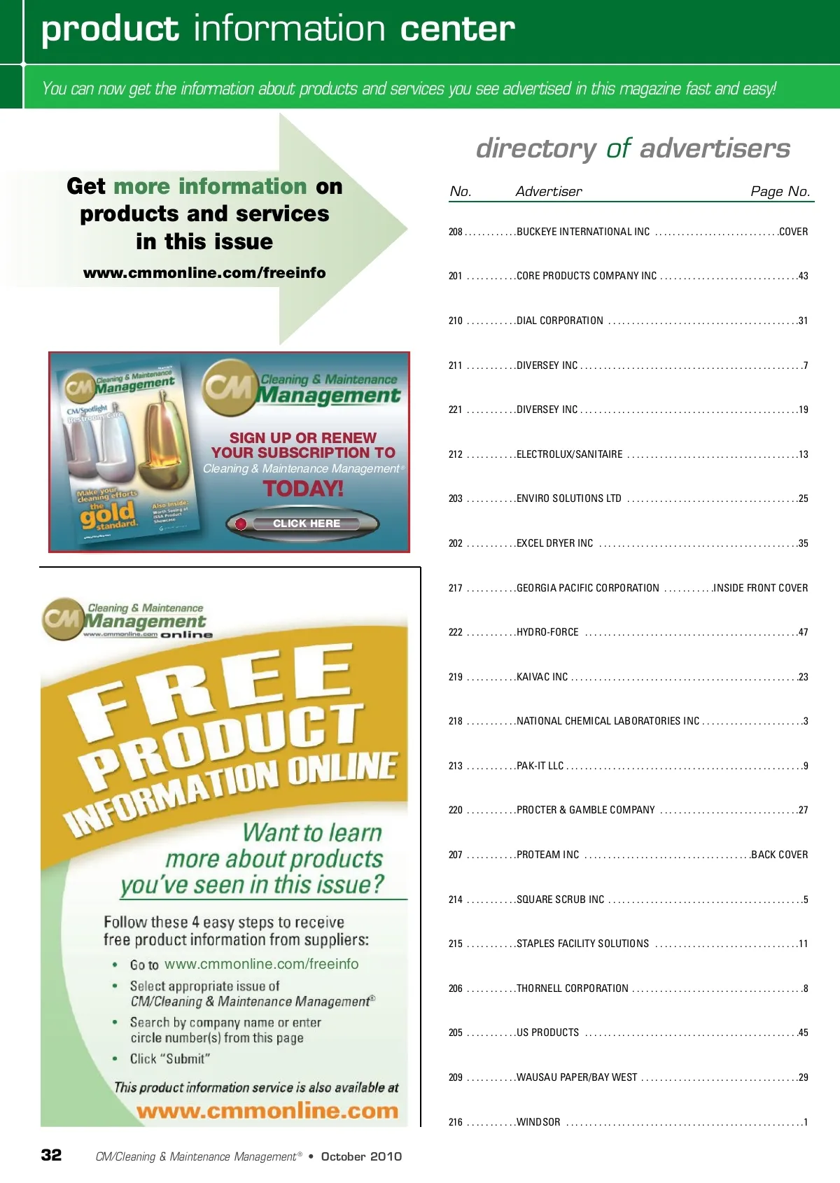 product information center You can now get the information about products and services you see advertised in this magazine fast and easy! directory of advertisers Get more information on products and services in this issue www.cmmonline.com/freeinfo No. Advertiser Page No. 208 . . . . . . . . . . . .BUCKEYE INTERNATIONAL INC . . . . . . . . . . . . . . . . . . . . . . . . . . . .COVER 201 . . . . . . . . . . .CORE PRODUCTS COMPANY INC . . . . . . . . . . . . . . . . . . . . . . . . . . . . . .43 210 . . . . . . . . . . .DIAL CORPORATION . . . . . . . . . . . . . . . . . . . . . . . . . . . . . . . . . . . . . . . . .31 2010 October 211 . . . . . . . . . . .DIVERSEY INC . . . . . . . . . . . . . . . . . . . . . . . . . . . . . . . . . . . . . . . . . . . . . . . .7 221 . . . . . . . . . . .DIVERSEY INC . . . . . . . . . . . . . . . . . . . . . . . . . . . . . . . . . . . . . . . . . . . . . . .19 SIGN UP OR RENEW YOUR SUBSCRIPTION TO Cleaning & Maintenance Management ® 212 . . . . . . . . . . .ELECTROLUX/SANITAIRE . . . . . . . . . . . . . . . . . . . . . . . . . . . . . . . . . . . . .13 TODAY! V G GRAND EDIA VIEW M GROUP 203 . . . . . . . . . . .ENVIRO SOLUTIONS LTD . . . . . . . . . . . . . . . . . . . . . . . . . . . . . . . . . . . . .25 SUBSCRIBE NOW! 202 . . . . . . . . . . .EXCEL DRYER INC . . . . . . . . . . . . . . . . . . . . . . . . . . . . . . . . . . . . . . . . . . .35 CLICK HERE online.com www.cmm 217 . . . . . . . . . . .GEORGIA PACIFIC CORPORATION . . . . . . . . . . .INSIDE FRONT COVER 222 . . . . . . . . . . .HYDRO-FORCE . . . . . . . . . . . . . . . . . . . . . . . . . . . . . . . . . . . . . . . . . . . . . .47 219 . . . . . . . . . . .KAIVAC INC . . . . . . . . . . . . . . . . . . . . . . . . . . . . . . . . . . . . . . . . . . . . . . . . .23 218 . . . . . . . . . . .NATIONAL CHEMICAL LABORATORIES INC . . . . . . . . . . . . . . . . . . . . . .3 213 . . . . . . . . . . .PAK-IT LLC . . . . . . . . . . . . . . . . . . . . . . . . . . . . . . . . . . . . . . . . . . . . . . . . . . .9 220 . . . . . . . . . . .PROCTER & GAMBLE COMPANY . . . . . . . . . . . . . . . . . . . . . . . . . . . . . .27 207 . . . . . . . . . . .PROTEAM INC . . . . . . . . . . . . . . . . . . . . . . . . . . . . . . . . . . . .BACK COVER 214 . . . . . . . . . . .SQUARE SCRUB INC . . . . . . . . . . . . . . . . . . . . . . . . . . . . . . . . . . . . . . . . . .5 215 . . . . . . . . . . .STAPLES FACILITY SOLUTIONS . . . . . . . . . . . . . . . . . . . . . . . . . . . . . . .11 www.cmmonline.com/freeinfo 206 . . . . . . . . . . .THORNELL CORPORATION . . . . . . . . . . . . . . . . . . . . . . . . . . . . . . . . . . . . .8 205 . . . . . . . . . . .US PRODUCTS . . . . . . . . . . . . . . . . . . . . . . . . . . . . . . . . . . . . . . . . . . . . . .45 209 . . . . . . . . . . .WAUSAU PAPER/BAY WEST . . . . . . . . . . . . . . . . . . . . . . . . . . . . . . . . . .29 216 . . . . . . . . . . .WINDSOR . . . . . . . . . . . . . . . . . . . . . . . . . . . . . . . . . . . . . . . . . . . . . . . . . . .1 32 CM/Cleaning & Maintenance Management ® • October 2010