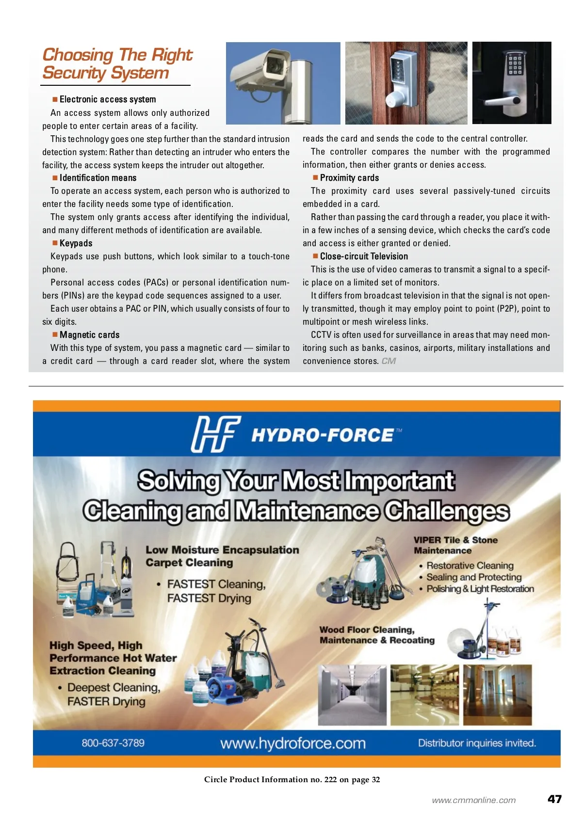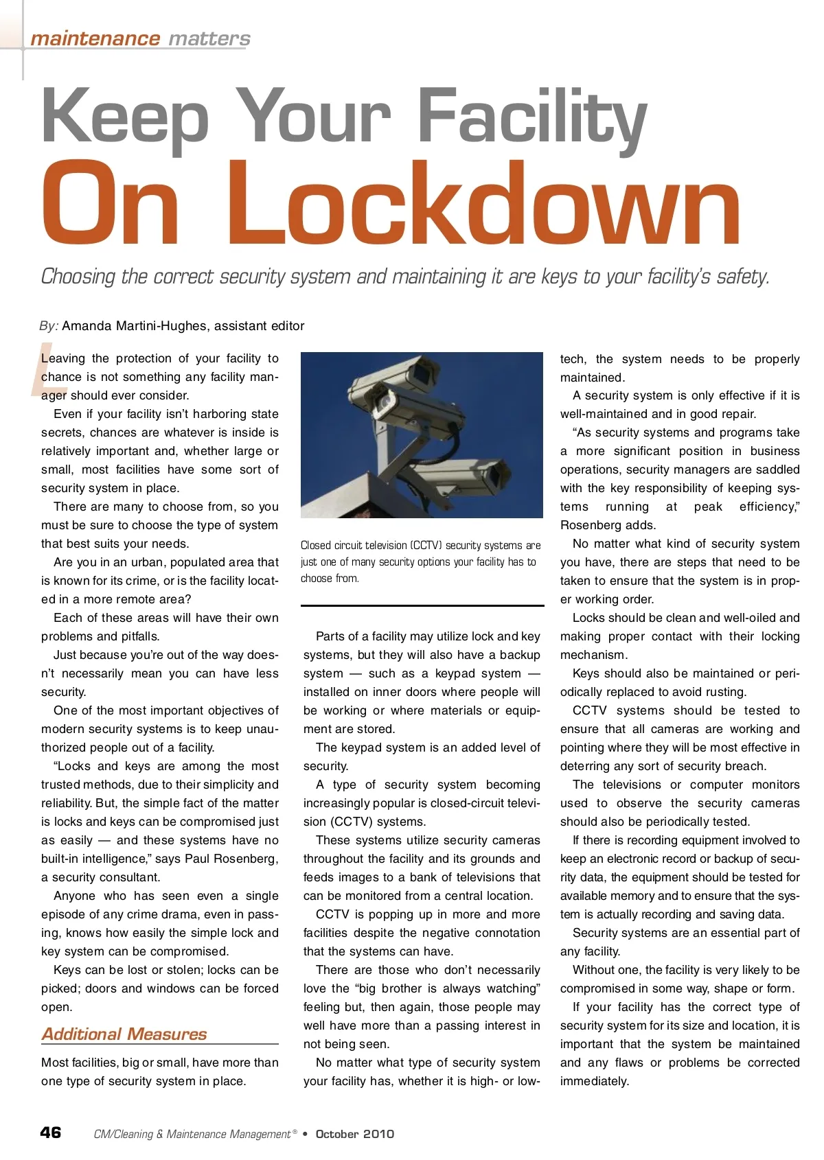 maintenance matters Keep Your Facility On Lockdown By: Amanda Martini-Hughes, assistant editor Choosing the correct security system and maintaining it are keys to your facility’s safety. L Leaving the protection of your facility to chance is not something any facility man-ager should ever consider. Even if your facility isn’t harboring state secrets, chances are whatever is inside is relatively important and, whether large or small, most facilities have some sort of security system in place. There are many to choose from, so you must be sure to choose the type of system that best suits your needs. Are you in an urban, populated area that is known for its crime, or is the facility locat-ed in a more remote area? Each of these areas will have their own problems and pitfalls. Just because you’re out of the way does-n’t necessarily mean you can have less security. One of the most important objectives of modern security systems is to keep unau-thorized people out of a facility. “Locks and keys are among the most trusted methods, due to their simplicity and reliability. But, the simple fact of the matter is locks and keys can be compromised just as easily — and these systems have no built-in intelligence,” says Paul Rosenberg, a security consultant. Anyone who has seen even a single episode of any crime drama, even in pass-ing, knows how easily the simple lock and key system can be compromised. Keys can be lost or stolen; locks can be picked; doors and windows can be forced open. Closed circuit television (CCTV) security systems are just one of many security options your facility has to choose from. Additional Measures Most facilities, big or small, have more than one type of security system in place. Parts of a facility may utilize lock and key systems, but they will also have a backup system — such as a keypad system — installed on inner doors where people will be working or where materials or equip-ment are stored. The keypad system is an added level of security. A type of security system becoming increasingly popular is closed-circuit televi-sion (CCTV) systems. These systems utilize security cameras throughout the facility and its grounds and feeds images to a bank of televisions that can be monitored from a central location. CCTV is popping up in more and more facilities despite the negative connotation that the systems can have. There are those who don’t necessarily love the “big brother is always watching” feeling but, then again, those people may well have more than a passing interest in not being seen. No matter what type of security system your facility has, whether it is high-or low-tech, the system needs to be properly maintained. A security system is only effective if it is well-maintained and in good repair. “As security systems and programs take a more significant position in business operations, security managers are saddled with the key responsibility of keeping sys-tems running at peak efficiency,” Rosenberg adds. No matter what kind of security system you have, there are steps that need to be taken to ensure that the system is in prop-er working order. Locks should be clean and well-oiled and making proper contact with their locking mechanism. Keys should also be maintained or peri-odically replaced to avoid rusting. CCTV systems should be tested to ensure that all cameras are working and pointing where they will be most effective in deterring any sort of security breach. The televisions or computer monitors used to observe the security cameras should also be periodically tested. If there is recording equipment involved to keep an electronic record or backup of secu-rity data, the equipment should be tested for available memory and to ensure that the sys-tem is actually recording and saving data. Security systems are an essential part of any facility. Without one, the facility is very likely to be compromised in some way, shape or form. If your facility has the correct type of security system for its size and location, it is important that the system be maintained and any flaws or problems be corrected immediately. 46 CM/Cleaning & Maintenance Management ® • October 2010